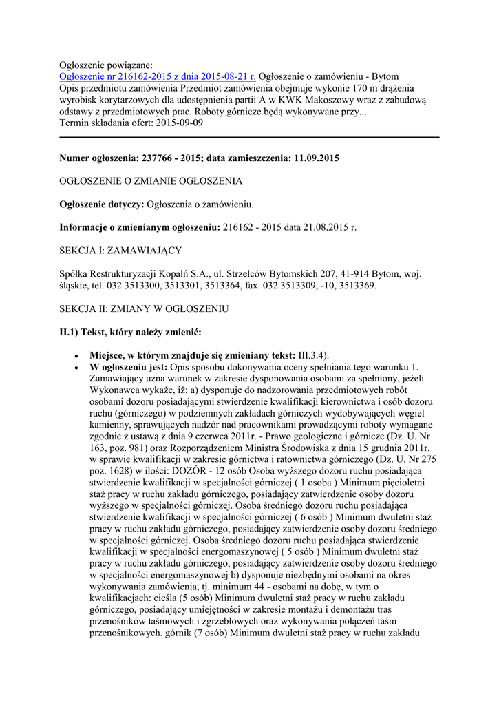 Ogłoszenie powiązane: Ogłoszenie nr 216162-2015 z dnia 2015-08-21 r. Ogłoszenie o zamówieniu - Bytom Opis przedmiotu zamówienia Przedmiot zamówienia obejmuje wykonie 170 m drążenia wyrobisk korytarzowych dla udostępnienia partii A w KWK Makoszowy wraz z zabudową odstawy z przedmiotowych prac. Roboty górnicze będą wykonywane przy... Termin składania ofert: 2015-09-09 Numer ogłoszenia: 237766 - 2015; data zamieszczenia: 11.09.2015 OGŁOSZENIE O ZMIANIE OGŁOSZENIA Ogłoszenie dotyczy: Ogłoszenia o zamówieniu. Informacje o zmienianym ogłoszeniu: 216162 - 2015 data 21.08.2015 r. SEKCJA I: ZAMAWIAJĄCY Spółka Restrukturyzacji Kopalń S.A., ul. Strzelców Bytomskich 207, 41-914 Bytom, woj. śląskie, tel. 032 3513300, 3513301, 3513364, fax. 032 3513309, -10, 3513369. SEKCJA II: ZMIANY W OGŁOSZENIU II.1) Tekst, który należy zmienić: Miejsce, w którym znajduje się zmieniany tekst: III.3.4). W ogłoszeniu jest: Opis sposobu dokonywania oceny spełniania tego warunku 1. Zamawiający uzna warunek w zakresie dysponowania osobami za spełniony, jeżeli Wykonawca wykaże, iż: a) dysponuje do nadzorowania przedmiotowych robót osobami dozoru posiadającymi stwierdzenie kwalifikacji kierownictwa i osób dozoru ruchu (górniczego) w podziemnych zakładach górniczych wydobywających węgiel kamienny, sprawujących nadzór nad pracownikami prowadzącymi roboty wymagane zgodnie z ustawą z dnia 9 czerwca 2011r. - Prawo geologiczne i górnicze (Dz. U. Nr 163, poz. 981) oraz Rozporządzeniem Ministra Środowiska z dnia 15 grudnia 2011r. w sprawie kwalifikacji w zakresie górnictwa i ratownictwa górniczego (Dz. U. Nr 275 poz. 1628) w ilości: DOZÓR - 12 osób Osoba wyższego dozoru ruchu posiadająca stwierdzenie kwalifikacji w specjalności górniczej ( 1 osoba ) Minimum pięcioletni staż pracy w ruchu zakładu górniczego, posiadający zatwierdzenie osoby dozoru wyższego w specjalności górniczej. Osoba średniego dozoru ruchu posiadająca stwierdzenie kwalifikacji w specjalności górniczej ( 6 osób ) Minimum dwuletni staż pracy w ruchu zakładu górniczego, posiadający zatwierdzenie osoby dozoru średniego w specjalności górniczej. Osoba średniego dozoru ruchu posiadająca stwierdzenie kwalifikacji w specjalności energomaszynowej ( 5 osób ) Minimum dwuletni staż pracy w ruchu zakładu górniczego, posiadający zatwierdzenie osoby dozoru średniego w specjalności energomaszynowej b) dysponuje niezbędnymi osobami na okres wykonywania zamówienia, tj. minimum 44 - osobami na dobę, w tym o kwalifikacjach: cieśla (5 osób) Minimum dwuletni staż pracy w ruchu zakładu górniczego, posiadający umiejętności w zakresie montażu i demontażu tras przenośników taśmowych i zgrzebłowych oraz wykonywania połączeń taśm przenośnikowych. górnik (7 osób) Minimum dwuletni staż pracy w ruchu zakładu górniczego, posiadający ukończony kurs górnika. przodowy (5 osób) Minimum pięcioletni staż pracy w ruchu zakładu górniczego, posiadający ukończony kurs górnika. kombajnista (5 osób) Minimum pięcioletni staż pracy w ruchu zakładu górniczego, posiadający ukończony kurs górnika oraz szkolenie specjalistyczne dla operatorów samojezdnych maszyn przodkowych - kombajnów chodnikowych. strzałowy (4 osoby) Minimum pięcioletni staż pracy w ruchu zakładu górniczego, posiadający: ukończony kurs górnika oraz kurs górnika strzałowego, ukończony 24 rok życia, pozytywny wynik badań psychologicznych, psychiatrycznych oraz psychotechnicznych, pozytywną opinię komendanta policji właściwego dla miejsca zamieszkania, brak wpisów do Krajowego Rejestru Karnego. ślusarz (3 osoby) Minimum trzyletni staż pracy w ruchu zakładu górniczego, posiadający ukończony kurs montażu, demontażu, obsługi i konserwacji kombajnów chodnikowych oraz przenośniki taśmowe. pracownik obsługujący przenośnik taśmowy ( 6 osób ) Minimum dwuletni staż pracy w ruchu zakładu górniczego, posiadający ukończony kurs obsługi przenośników taśmowych i zgrzebłowych. pracownik transportowy ( 6 osób ) Minimum dwuletni staż pracy w ruchu zakładu górniczego, posiadający ukończony kurs młodszego górnika lub górnika oraz ukończony kurs obsługi kolejek podwieszanych linowych typu KSP-16 i KSP-32. elektromonter ( 3 osoby ) Minimum pięcioletni staż pracy w ruchu zakładu górniczego, posiadający kwalifikacje zgodne z Rozporządzeniem Ministra Środowiska z dnia 15 grudnia 2011 r. w sprawie kwalifikacji w zakresie górnictwa i ratownictwa górniczego lub Rozporządzeniem Ministra Gospodarki, Pracy I Polityki Społecznej dnia 28 kwietnia 2003 r. sprawie szczegółowych zasad stwierdzania posiadania kwalifikacji przez osoby zajmujące się eksploatacją urządzeń, instalacji i sieci, potwierdzone ważnym świadectwem kwalifikacyjnym, w zakresie urządzeń, instalacji i sieci elektroenergetycznych na napięcie powyżej 1 kV.. W ogłoszeniu powinno być: Opis sposobu dokonywania oceny spełniania tego warunku 1. Zamawiający uzna warunek w zakresie dysponowania osobami za spełniony, jeżeli Wykonawca wykaże, iż: a) dysponuje do nadzorowania przedmiotowych robót osobami dozoru posiadającymi stwierdzenie kwalifikacji kierownictwa i osób dozoru ruchu (górniczego) w podziemnych zakładach górniczych wydobywających węgiel kamienny, sprawujących nadzór nad pracownikami prowadzącymi roboty wymagane zgodnie z ustawą z dnia 9 czerwca 2011r. - Prawo geologiczne i górnicze (Dz. U. Nr 163, poz. 981) oraz Rozporządzeniem Ministra Środowiska z dnia 15 grudnia 2011r. w sprawie kwalifikacji w zakresie górnictwa i ratownictwa górniczego (Dz. U. Nr 275 poz. 1628) w ilości: DOZÓR - 12 osób Osoba wyższego dozoru ruchu posiadająca stwierdzenie kwalifikacji w specjalności górniczej ( 1 osoba ) Minimum pięcioletni staż pracy w ruchu zakładu górniczego, posiadający zatwierdzenie osoby dozoru wyższego w specjalności górniczej. Osoba średniego dozoru ru