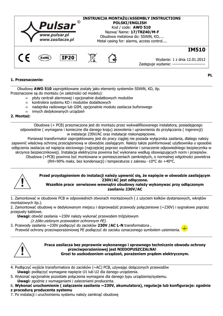 INSTRUKCJA MONTAŻU/ASSEMBLY INSTRUCTIONS POLSKI/ENGLISH Kod / code: AWO 510 Nazwa/ Name: 17/TRZ40/M-F Obudowa metalowa do: SSWiN, KD,…. Metal casing for: alarms, access control.... IM510 Wydanie: 1 z dnia 12.01.2012 Zastępuje wydanie: -----------------------PL 1. Przeznaczenie: Obudowy AWO 510 zaprojektowane zostały jako elementy systemów SSWiN, KD, itp. Przeznaczone są do montażu (w zależności od modelu): • płyty centrali alarmowej i opcjonalnie dodatkowych modułów • kontrolera systemu KD i modułów dodatkowych • nadajnika radiowego lub GSM, opcjonalnie modułu zasilacza buforowego • innych dedykowanych urządzeń 2. Montaż: Obudowa (+ PCB) przeznaczona jest do montażu przez wykwalifikowanego instalatora, posiadającego odpowiednie ( wymagane i konieczne dla danego kraju) zezwolenia i uprawnienia do przyłączania ( ingerencji) w instalacje 230V/AC oraz instalacje niskonapięciowe. Ponieważ transformator zaprojektowany jest do pracy ciągłej nie posiada wyłącznika zasilania, dlatego należy zapewnić właściwą ochronę przeciążeniową w obwodzie zasilającym. Należy także poinformować użytkownika o sposobie odłączenia zasilacza od napięcia sieciowego (najczęściej poprzez wydzielenie i oznaczenie odpowiedniego bezpiecznika w skrzynce bezpiecznikowej). Instalacja elektryczna powinna być wykonana według obowiązujących norm i przepisów. Obudowa (+PCB) powinna być montowana w pomieszczeniach zamkniętych, o normalnej wilgotności powietrza (RH=90% maks. bez kondensacji) i temperaturze z zakresu -10°C do +40°C. Przed przystąpieniem do instalacji należy upewnić się, że napięcie w obwodzie zasilającym 230V/AC jest odłączone. Wszelkie prace serwisowe wewnątrz obudowy należy wykonywac przy odłączonym zasilaniu 230V/AC 1. Zamontować w obudowie PCB w odpowiednich otworach montażowych ( z użyciem kołków dystansowych, wkrętów montażowych itp.). 2. Zamontować obudowę w dedykowanym miejscu i doprowadzić przewody połączeniowe (~230V) i sygnałowe poprzez przepusty kablowe. Uwagi: obwód zasilania ~230V należy wykonać przewodem trójżyłowym (z żółto-zielonym przewodem ochronnym PE). 3. Przewody zasilania ~230V podłączyć do zacisków 230V /AC L-N transformatora . Przewód ochrony przeciwporażeniowej PE podłączyć do zacisku oznaczonego symbolem uziemienia. Praca zasilacza bez poprawnie wykonanego i sprawnego technicznie obwodu ochrony przeciwporażeniowej jest NIEDOPUSZCZALNA! Grozi to uszkodzeniem urządzeń, porażeniem prądem elektrycznym. 4. Podłączyć wyjście transformatora do zacisków (~AC) PCB, używając dołączonych przewodów Uwagi: podłączyć wymagane napięcie U1 lub U2 dla danego urządzenia. 5. Wykonać opcjonalnie pozostałe połączenia wymagane dla danego typu urządzenia/systemu. Uwagi: zgodnie z wymaganiami i zaleceniami producenta. 6. Wykonać uruchomienie ( załączenie zasilania ~230V, akumulatora), regulacje lub konfiguracje: zgodnie z procedurą producenta systemu 7. Po instalacji i uruchomieniu systemu należy zamknąć obudowę 1. Destination: EN The AWO 510 metal casings are designed as components (supplying) in intruders alarms, access control systems, security systems etc. There are intended for installation: • control panel optional with supplementary modules • access control controllers with optional modules • radio or GSM transmitter with optional module PS • other dedicated devices, components etc. 2. Installation: The metal casing (+PCB) must be installed by a qualified installer, holding the relevant certificates, required and necessary in the particular country for connecting (interfering with) the 230 V AC systems and low-voltage installations. Because the transformer is designed for the continuous operation and is not equipped with ON/OFF switch, the power supply line should have the appropriate overload protection. The user should be informed how to disconnect the unit from the mains (the most often by separate and mark the adequate fuse in the fuse box). The power supply installation should be conform to the applicable standards and law. The casing (+PCB) should be installed indoors, where the air humidity is normal (RH=90% max. without condensation) and temperature in the range of -10°C to +40°C. Caution! Prior to entering for installation it is necessary to make sure if the voltage in the 230 V/AC circuit is disconnected. All service works inside the housing must be carried out with 230V/AC supply voltage disconnected. 1. Mount the PCB (control panel, etc) with dedicated holes (use distance pins, bracket screw). 2. Install metal casing in dedicated place and bring in the connecting (~230V) and signal conductors through cables bushings. Remarks: supply circuit ~230V should be carried out with three-core cable (with yellow-green protective PE conductor). 3. Supply conductors ~230V should be connected to 230V / AC L-N terminals of the transformers. Protective conductor should be connected to the terminal marked with grounding symbol. Caution! Operating the power supply without properly made and technically operational electric shock protection circuit is IMPERMISSIBLE! This creates hazard of equipment damage and risk of electric shock. 4. Connect the output of transformer to the terminals (~AC) on the PCB, using installed cables Remarks: connect required voltage U1 or U2 (secondary voltage) for the correct device. 5. If necessary, make other connections required for the correct type of system / device. Remarks: consistent with requirements and recommendation of the producer. 6. Start the system (switch on ~230V, battery), adjust or configure: according to procedure of the producer’s system. 7. After installing and checking the proper operation of the system, close the casing. 2 3. Parametry techniczne / Technical data: PL/EN PARAMETRY TECHNICZNE Napięcie zasilania TECHNICAL DATA Power supply voltage 230V/AC, 50Hz (-/+15%) Transformator Transformer TRZ 40/16/18