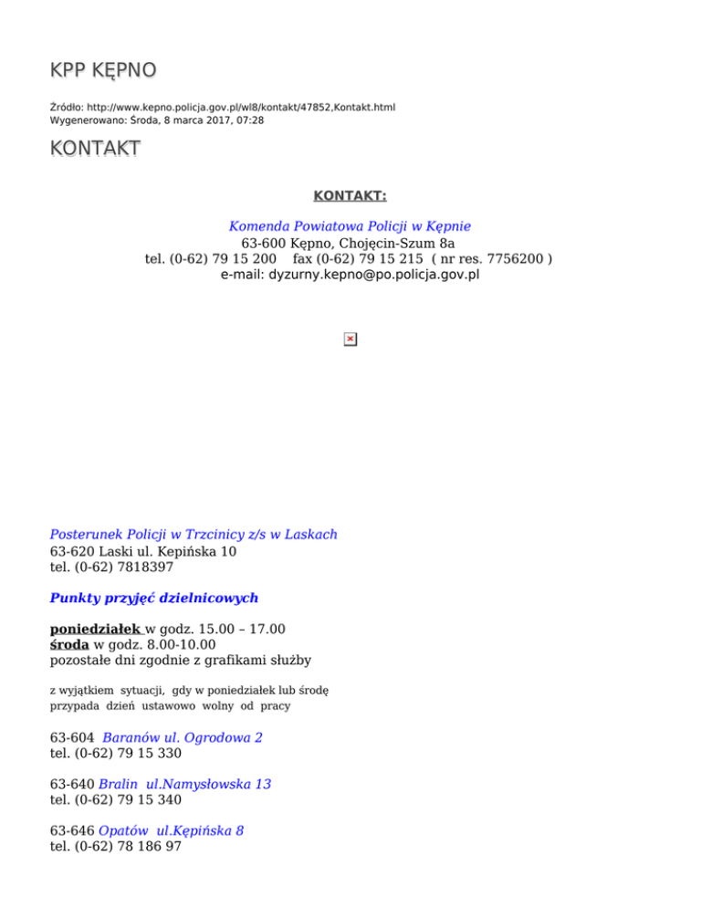 KPP KĘPNO Źródło: http://www.kepno.policja.gov.pl/wl8/kontakt/47852,Kontakt.html Wygenerowano: Środa, 8 marca 2017, 07:28 KONTAKT KONTAKT: Komenda Powiatowa Policji w Kępnie 63-600 Kępno, Chojęcin-Szum 8a tel. (0-62) 79 15 200 fax (0-62) 79 15 215 ( nr res. 7756200 ) e-mail: [email protected] Posterunek Policji w Trzcinicy z/s w Laskach 63-620 Laski ul. Kepińska 10 tel. (0-62) 7818397 Punkty przyjęć dzielnicowych poniedziałek w godz. 15.00 – 17.00 środa w godz. 8.00-10.00 pozostałe dni zgodnie z grafikami służby z wyjątkiem sytuacji, gdy w poniedziałek lub środę przypada dzień ustawowo wolny od pracy 63-604 Baranów ul. Ogrodowa 2 tel. (0-62) 79 15 330 63-640 Bralin ul.Namysłowska 13 tel. (0-62) 79 15 340 63-646 Opatów ul.Kępińska 8 tel. (0-62) 78 186 97 63-642 Perzów 78 tel. (0-62) 78 61 097 63-620 Rychtal ul.Namysłowska 6 tel. (0-62) 78 16 997 63-620 Laski ul.Kępińska 10 (Posterunek Policji) tel. (0-62) 7818397 Ocena: 0/5 (0) Tweetnij