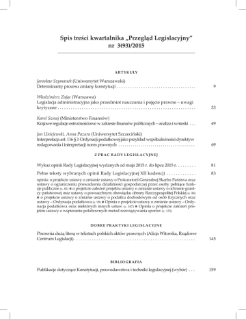 Spis treści kwartalnika „Przegląd Legislacyjny” nr 3(93)/2015 A R T Y K U ŁY Jarosław Szymanek (Uniwersytet Warszawski) Determinanty procesu zmiany konstytucji . . . . . . . . . . . . . . . . . . . . . . . . . . . . . . . . . . . . 9 Włodzimierz Zając (Warszawa) Legislacja administracyjna jako przedmiot nauczania i pojęcie prawne – uwagi krytyczne . . . . . . . . . . . . . . . . . . . . . . . . . . . . . . . . . . . . . . . . . . . . . . . . . . . . . . . . . . . . . . . 33 Karol Szmaj (Ministerstwo Finansów) Krajowe regulacje ostrożnościowe w zakresie finansów publicznych – analiza i wnioski . . . 49 Jan Uniejewski, Anna Pazura (Uniwersytet Szczeciński) Interpretacja art. 116 § 1 Ordynacji podatkowej jako przykład współzależności dyrektyw redagowania i interpretacji norm prawnych . . . . . . . . . . . . . . . . . . . . . . . . . . . . . . . . . . . . . . 69 Z PRAC RADY LEGISLACYJNEJ Wykaz opinii Rady Legislacyjnej wydanych od maja 2015 r. do lipca 2015 r. . . . . . . . . 81 Pełne teksty wybranych opinii Rady Legislacyjnej XII kadencji . . . . . . . . . . . . . 83 opinia: o projekcie ustawy o zmianie ustawy o Prokuratorii Generalnej Skarbu Państwa oraz ustawy o ograniczeniu prowadzenia działalności gospodarczej przez osoby pełniące funkcje publiczne (s. 82) o projekcie założeń projektu ustawy o zmianie ustawy o ochronie granicy państwowej oraz ustawy o powszechnym obowiązku obrony Rzeczypospolitej Polskiej (s. 88) o projekcie ustawy o zmianie ustawy o podatku dochodowym od osób fizycznych oraz ustawy – Ordynacja podatkowa (s. 99) Opinia o projekcie ustawy o zmianie ustawy – Ordynacja podatkowa oraz niektórych innych ustaw (s. 107) Opinia o projekcie założeń projektu ustawy o wspieraniu polubownych metod rozwiązywania sporów (s. 133) DOBRE PRAKTYKI LEGISLACYJNE Pisownia dużą literą w tekstach polskich aktów prawnych (Alicja Witorska, Rządowe Centrum Legislacji) . . . . . . . . . . . . . . . . . . . . . . . . . . . . . . . . . . . . . . . . . . . . . . . . . . . . . . 145 BIBLIOGRAFIA Publikacje dotyczące Konstytucji, prawodawstwa i techniki legislacyjnej (wybór) . . . 159 4 PRZEGLĄD LEGISLACYJNY NR 3(93)/2015 INFORMACJE DLA AUTORÓW „PRZEGLĄDU LEGISLACYJNEGO” 1. Teksty opracowań do „Przeglądu Legislacyjnego” powinny być przesyłane w wersji elektronicznej na adres: [email protected]. 2. Warunkiem wydrukowania tekstu jest uzyskanie pozytywnej oceny recenzentów. Procedura recenzowania opisana jest szczegółowo na stronie internetowej „Przeglądu Legislacyjnego”. 3. Do przesłanego tekstu należy dołączyć zamieszczony na stronie http://www.radalegislacyjna.gov.pl formularz, w którym znajdują się informacje o autorze (stopień lub tytuł naukowy, afiliacja, numer telefonu i adres domowy). 4. Do artykułu należy dodatkowo dołączyć krótkie (1/2 strony) streszczenie w języku angielskim oraz propozycję notki biograficznej autora. 5. Objętość nadsyłanych tekstów nie powinna przekraczać 2 ark. wyd. (ok. 80 000 znaków wraz ze spacjami i przypisami) w przypadku artykułu oraz 1/2 ark. wyd. w przypadku recenzji. 6. Do druku przyjmowane są wyłącznie prace oryginalne, wcześniej niepublikowane. Redakcja prosi o niedostarczanie jej prac wysyłanych jednocześnie do innych czasopism. 7. Redakcja „Przeglądu Legislacyjnego” wdrożyła procedurę zabezpieczającą oryginalność publikacji naukowych. Polega ona na tym, że: – jeśli tekst jest podpisany przez więcej niż jednego autora, należy w nim umieścić (w przypisie) dokładne określenie wkładu, jaki w jego powstanie wnieśli poszczególni współautorzy (z podaniem informacji, kto jest autorem koncepcji, założeń, metod itp. wykorzystanych podczas przygotowywania publikacji). Ujawnić należy także (np. w formie podziękowań) nazwiska wszystkich osób, które przyczyniły się do powstania publikacji, a nie figurują jako autorzy. Ma to na celu zapobieganie nierzetelnym praktykom naukowym, do których należy ghostwriting (tj. ukrywanie osób, które przyczyniły się do powstania tekstu) i guest authorship (tj. wymienianie jako autorów osób, które przyczyniły się w znikomym stopniu do powstania publikacji albo wcale nie wniosły w nią swojego wkładu). – wykrycie takich praktyk przez redakcję skutkować będzie powiadomieniem odpowiednich podmiotów (instytucji zatrudniających autorów, towarzystw naukowych, stowarzyszeń edytorów naukowych itp.). – należy także podać (w przypisie) informacje o źródłach finansowania danej publikacji, takich jak na przykład granty krajowe, międzynarodowe, dotacje fundacji, stowarzyszeń lub instytucji komercyjnych. – odpowiedzialność za podanie powyższych danych ponosi autor bezpośrednio zgłaszający tekst do redakcji. 8. Publikacje w kwartalniku „Przegląd Legislacyjny” są odpłatne. 9. Redakcja nie zwraca autorom nadesłanych materiałów. Autorzy 5 Autorzy artykułów zamieszczonych w tym numerze: Jarosław Szymanek, dr hab., profesor Uniwersytetu Warszawskiego, politolog, ustrojoznawca, specjalista z zakresu porównawczego prawa konstytucyjnego i współczesnych systemów politycznych. Członek Polskiego Towarzystwa Prawa Konstytucyjnego oraz Polskiego Towarzystwa Nauk Politycznych. Włodzimierz Zając, absolwent Wydziału Prawa i Administracji Uniwersytetu Warszawskiego; w latach 2009–2015 dyrektor Departamentu Prawa Społecznego w Rządowym Centrum Legislacji. Prowadzi zajęcia z technik legislacyjnych na Podyplomowym Studium Zagadnień Legislacyjnych Uniwersytetu Warszawskiego, a także wykłady i ćwiczenia na aplikacji legislacyjnej. Karol Szmaj, dr nauk prawnych, absolwent Wydziału Prawa i Administracji Uniwersytetu Wrocławskiego oraz Krajowej Szkoły Administracji Publicznej, pracownik Ministerstwa Finansów. Jan Uniejewski, doktorant w Katedrze Prawa Konstytucyjnego i Integracji Europejskiej Wydziału Prawa i Administracji Uniwersytetu Szczecińskiego, aplika