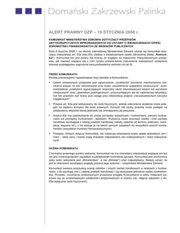 ALERT PRAWNY DZP – 10 STYCZNIA 2008 r. KOMUNIKAT MINISTERSTWA ZDROWIA DOTYCZĄCY PRZEPISÓW ANTYKORUPCYJNYCH WPROWADZONYCH DO USTAWY O ŚWIADCZENIACH OPIEKI ZDROWOTNEJ FINANSOWANYCH ZE ŚRODKÓW PUBLICZNYCH Dnia 8 stycznia 2008 r. na stronie internetowej Ministerstwa Zdrowia ukazał się komunikat dotyczący interpretacji art. 63a oraz 63c Ustawy o świadczeniach opieki zdrowotnej (dalej: „Komunikat”). Komunikat ten jest istotny dla branŜy ze względu na niejasność interpretowanych przepisów, jak równieŜ wiąŜące się z nimi ryzyko prawno-karne (naruszenie wskazanych przepisów stanowi przestępstwo zagroŜone karą pozbawienia wolności do lat 5). TREŚĆ KOMUNIKATU PoniŜej prezentujemy najwaŜniejsze tezy zawarte w Komunikacie: Celem omawianych przepisów jest ograniczenie „moŜliwości tworzenia mechanizmów kreowania popytu na leki refundowane przy braku uzasadnienia względami medycznymi”, przeciwdziałanie „praktykom wypaczającym racjonalny obrót refundowanymi lekami lub wyrobami medycznymi” oraz „zjawiskom patologicznym”, przyczyniającym się do nadmiernej refundacji. Cel ten powinien być brany pod uwagę przy interpretacji pojęcia „nieuzasadnionych korzyści majątkowych”. Przepis art. 63a jest adresowany do osób fizycznych, jednak zabronione działanie moŜe polegać na Ŝądaniu korzyści dla osób prawnych. Korzyść dla osoby prawnej moŜe polegać na zwiększeniu aktywów danej jednostki lub zmniejszaniu jej pasywów. Artykuł 63c ma zastosowanie do umów pomiędzy wytwórcami i hurtowniami, samymi hurtowniami lub pomiędzy hurtowniami i aptekami. Wytwórca moŜe stosować rabaty i inne zachęty handlowe wynikające z dobrej praktyki handlowej (rabaty zaleŜne od terminu płatności, transakcje wiązane itd.), o ile stosuje je na takich samych zasadach do wszystkich swoich kontrahentów (wszystkich hurtowni farmaceutycznych). Przepisy, których dotyczy Komunikat, nie nakazują stosowania przez apteki jednolitych cen i marŜ – takie ceny i marŜe mają charakter odpowiednio cen maksymalnych i marŜ maksymalnych. OCENA KOMUNIKATU Z formalno-prawnego punktu widzenia, Komunikat nie ma charakteru interpretacji wiąŜącej ani teŜ nie jest rozstrzygnięciem zapadłym w jakiejkolwiek konkretnej sprawie. Komunikat jest anonimowy (jako autor wskazane jest „Ministerstwo”, a nie „Minister”) oraz niepodpisany. NaleŜy uznać, Ŝe jest to dokument wyraŜający poglądy prawne jego autorów – urzędników Ministerstwa Zdrowia. Komunikat zawiera pozytywną ocenę rabatów i innych zachęt handlowych w relacjach z hurtowniami, o ile wynikają one z „dobrej praktyki handlowej” i są stosowane jednolicie wobec kontrahentów. Ponadto, rozumienie analizowanych przepisów przyjęte Komunikacie w wielu miejscach pokrywa się ze wcześniejszymi ustaleniami przyjmowanymi w branŜy (np. objęcie zakazem z art. 63a wyłącznie osób fizycznych). 1 Mimo to, Komunikat jest w wielu miejscach dość niejasny. Niejasności dotyczą m.in.: stosunku art. 63a do art. 63c – w Komunikacie stwierdza się, Ŝe rabaty i inne zachęty handlowe nie są zakazane przez art. 63c, Ministerstwo nie wskazuje jednak, czy stosowanie rabatów, premii oraz innych działań sprzedaŜowych moŜe zostać uznane za wręczanie nieuzasadnionych korzyści osobom prawnym w rozumieniu art. 63a; tymczasem liczne odniesienia do celu omawianych przepisów oraz stwierdzenia, iŜ ocena konkretnych przypadków jest wyłączną kompetencją sądów, mogą rodzić pewne wątpliwości w tym zakresie; rozumienia terminów „zwiększenia aktywów” oraz „zmniejszenie pasywów” przedsiębiorstwa – autorzy Komunikatu wskazują, Ŝe zakaz z art. 63a stosuje się równieŜ do sytuacji Ŝądania korzyści przez osobę fizyczną dla osoby prawnej; nie moŜna z całą pewnością wykluczyć, Ŝe wskazanymi pojęciami autorzy Komunikatu obejmują udzielane po transakcjach skonta i premie sprzedaŜowe; zakresu dopuszczalnych w świetle art. 63c działań sprzedaŜowych – w Komunikacie jako przykłady dopuszczalnych działań sprzedaŜowych przedstawia się rabaty zaleŜne od terminu płatności oraz transakcje wiązane; trudno z całą pewnością stwierdzić, czy rabaty uzaleŜnione od wolumenu zakupów w danym okresie rozliczeniowym są zdaniem autorów Komunikatu legalne, czy teŜ stanowią wspomniane w dokumencie „mechanizmy kreowania popytu” nieuzasadnione względami medycznymi; przedstawiona wątpliwość wiąŜe się równieŜ z: (i) z ostatnim zdaniem Komunikatu, z którego moŜna wyinterpretować aprobatę przede wszystkim dla takich działań sprzedaŜowych, które zmniejszają ceny leków dla pacjenta oraz (ii) z uŜyciem sformułowania „dobre praktyki handlowe”, co sugeruje, iŜ w rozumieniu autorów Komunikatu w obrocie funkcjonują równieŜ „złe praktyki”; stosowania art. 63c do aptek – wbrew stwierdzeniom zawartym w Komunikacie, zakaz róŜnicowania cen oraz stosowania warunków uciąŜliwych lub niejednolitych nie znajduje zastosowania do relacji pomiędzy hurtowniami i aptekami (apteki nie sprzedają leków hurtowniom); do relacji tego typu moŜe być stosowany jedynie art. 63c ust. 1 pkt 2, który zakazuje uzaleŜniania zawarcia umowy z hurtownią od przyjęcia lub spełnienia przez hurtownię farmaceutyczną innego świadczenia, niemającego rzeczowego ani zwyczajowego związku z przedmiotem umowy; marŜ detalicznych – w Komunikacie stwierdza się, Ŝe marŜe detaliczne stosowane przez apteki mają charakter marŜ maksymalnych; tymczasem taki charakter mają jedynie ceny urzędowe; w polskim prawie marŜe apteczne nie są przedmiotem regulacji – przepis w Ustawie o cenach dotyczący marŜy detalicznej aptecznej jest adresowany wyłącznie do organów administracji i stanowi element formuły obliczenia ceny urzędowej maksymalnej. REKOMENDACJE W naszej ocenie, Komunikat naleŜy ocenić pozytywnie, jako waŜny etap budowania przez regulatora interpreta