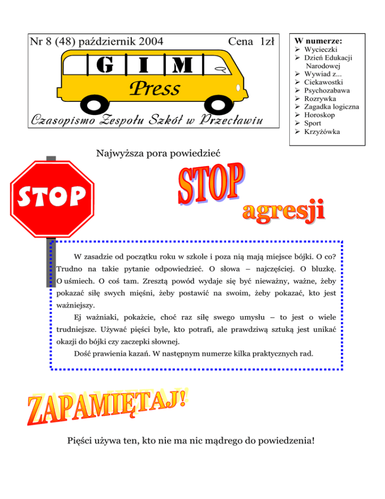Nr 8 (48) październik 2004 Cena 1zł Czasopismo Zespołu Szkół w Prz e cławiu W numerze: Wycieczki Dzień Edukacji Narodowej Wywiad z... Ciekawostki Psychozabawa Rozrywka Zagadka logiczna Horoskop Sport KrzyŜówka Najwyższa pora powiedzieć W zasadzie od początku roku w szkole i poza nią mają miejsce bójki. O co? Trudno na takie pytanie odpowiedzieć. O słowa – najczęściej. O bluzkę. O uśmiech. O coś tam. Zresztą powód wydaje się być nieważny, ważne, żeby pokazać siłę swych mięśni, żeby postawić na swoim, żeby pokazać, kto jest ważniejszy. Ej ważniaki, pokażcie, choć raz siłę swego umysłu – to jest o wiele trudniejsze. Używać pięści byle, kto potrafi, ale prawdziwą sztuką jest unikać okazji do bójki czy zaczepki słownej. Dość prawienia kazań. W następnym numerze kilka praktycznych rad. Pięści używa ten, kto nie ma nic mądrego do powiedzenia! Str. 2 Czasopismo Zespołu Szkół w Przecławiu Jak to gimnazjum i liceum pojechało na wycieczkę... Dawno, dawno temu, bo dnia 7 października 2004 r. odbyła się wycieczka do Sandomierza, Stalowej Woli i Baranowa Sandomierskiego. Wybrali się na nią uczniowie z klas, zarówno gimnazjalnych jak i licealnych pod czujnym okiem kilkorga nauczycieli. W drogę wyruszyliśmy rano sprzed budynku Zespołu Szkół. Na początek stoczyliśmy krwawą bitwę o dobre miejsca w autobusie. Kiedy wreszcie, po licznych pertraktacjach, usiedliśmy rozpoczęła się podróŜ w nieznane... W autobusie otrzymaliśmy wydruki opisujące dokładnie miejsca, wkrótce które mieliśmy zobaczyć. Pierwszym naszym celem był Sandomierz. Pochłonięci lekturą notek o zabytkach i historii pierwszego celu wycieczki (dobra, przesadziłam...) ledwo zauwaŜyliśmy roztaczający się przed nami wspaniały widok: tonące w słońcu wzgórze z licznymi zabytkami, okalane przez Wisłę... Zachwyceni piękną panoramą podąŜyliśmy szlakiem prowadzącym wprost do katedry. Na jej dziedzińcu dowiedzieliśmy się co nieco o historii budowli i weszliśmy podziwiać jej wnętrze. To, co zastaliśmy w środku, urzekało swoim pięknem. Ściany pokryte malowidłami ukazującymi sceny z historii miasta, zachwycały pięknem barw; podobnie jak ołtarze o niezwykłych wręcz kształtach. Całe bogactwo form i barw było wręcz przytłaczające. Tak nastrojeni udaliśmy się do muzeum znajdującego się w tzw. Domu Długosza. Samo muzeum było o tyle niezwykłe, Ŝe znajdujące się w nim przedmioty idealnie współgrały z samymi pomieszczeniami. Budynek ten pochodzi bowiem z XV wieku. Mogliśmy tam podziwiać eksponaty, które, jak powiedziała pani przewodniczka, czasami są ze sobą praktycznie niezwiązane (np. odciski stóp mamuta i ikony przedstawiające wizerunek Maryi). KaŜdy z eksponatów stanowił mimo to ciekawostkę dla kaŜdego ze zwiedzających. I tak na przykład, nie wiedzieć czemu, spora grupa ze szczególnym zapałem oglądała fajki, a inni obraz półnagiego męŜczyzny... Muzeum to było więc dla kaŜdego miejscem interesującym. Nie mogło jednak rywalizować z tym, które odwiedziliśmy później... Później bowiem mieliśmy czas wolny, który spędziliśmy na Rynku sandomierskim. W tym momencie zwarta grupa rozproszyła się i kaŜdy oddawał się róŜnorakim przyjemnościom. Po chwili wytchnienia wyruszyliśmy do zespołu klasztornego Dominikanów pochodzącego z XIII w. W katedrze uderzył nas jej wystrój, a właściwie jego brak. Budowla ta całkowicie róŜniła się od poprzedniego kościoła. Bardzo miły dominikanin wyjaśnił nam dokładnie historię zarówno klasztoru jak i katedry wraz z dodatkowymi historyjkami w stylu „Z Archiwum X”. Po wyjściu z budowli udaliśmy się w kierunku Wąwozu św. Jadwigi. Był on ostatnim punktem, który mieliśmy zwiedzać w Sandomierzu. Następnie pojechaliśmy do Stalowej Woli. Tam mieliśmy okazję obejrzeć wystawę prac słynnego malarza impresjonisty Vincenta van Gogha. Spośród jego licznych obrazów, mogliśmy obejrzeć kilka, ukazujących m. in. krajobrazy i martwe natury. RównieŜ w tym muzeum zobaczyliśmy wystawę mówiącą o Janie III Sobieskim. Kolejnym, i zarazem ostatnim celem naszej wycieczki był Baranów Sandomierski. Tam jednak nie zwiedzaliśmy samego zamku, a jedynie spacerowaliśmy po ogrodzie otaczającym monumentalną budowlę. Kończył się powoli ten pełen wraŜeń dzień, więc zbieraliśmy się do odjazdu. Zmęczeni dotarliśmy w końcu do domów. Nasuwa się pytanie: co dała nam ta wycieczka? Dla mnie była nie tylko odskocznią od szkoły czy okazją do „legalnego” urwania się z lekcji. Była bowiem taką terenową lekcją historii, geografii i sztuki zarazem. Chyba dla kaŜdego, kto wykazał choć odrobinę chęci, wycieczka ta nie była nudna czy bezsensowna. PodróŜe, chociaŜby jednodniowe, kształcą i tego powinniśmy się zawsze trzymać, szczególnie, gdy nauczyciele nie zechcą zgodzić się na wycieczkę!!! J☺BFN GIMPRESS 8 (48) październik 2004 Czasopismo Zespołu Szkół w Przecławiu Str. 3 O tym, co zdarzyło się 10 października... Jest dość zimna październikowa niedziela, a uczniowie Zespołu Szkół w Przecławiu stoją, wyraźnie zniecierpliwieni pod swoją szkołą i po ich minach nie widać, by było im zimno. Wybierają się oni na KABARET „KOŃ POLSKI”, który będzie występował w Rzeszowie. Po kilkunastu minutach nadjeŜdŜa pomarańczowy gimbus, co powoduje, Ŝe na twarzach młodzieŜy☺ pojawia się uśmiech (w końcu jadą na kabaret). Szybko dojeŜdŜają do celu, a to dzięki mistrzowskiej jeździe pana Jacka. Po dotarciu do Rzeszowa, udają się do tamtejszego McDonaldu, by zjeść coś ‘zdrowego’. Niektórzy chcą zjechać ze zjeŜdŜalni znajdującej się na terenie restauracji, ale nie udaje im się, bo atrakcja w tym czasie jest zamknięta (pomijamy fakt, iŜ zabawa ta jest przeznaczona dla dzieci poniŜej dziesięciu lat). Z napełnionymi brzuchami udają się 
