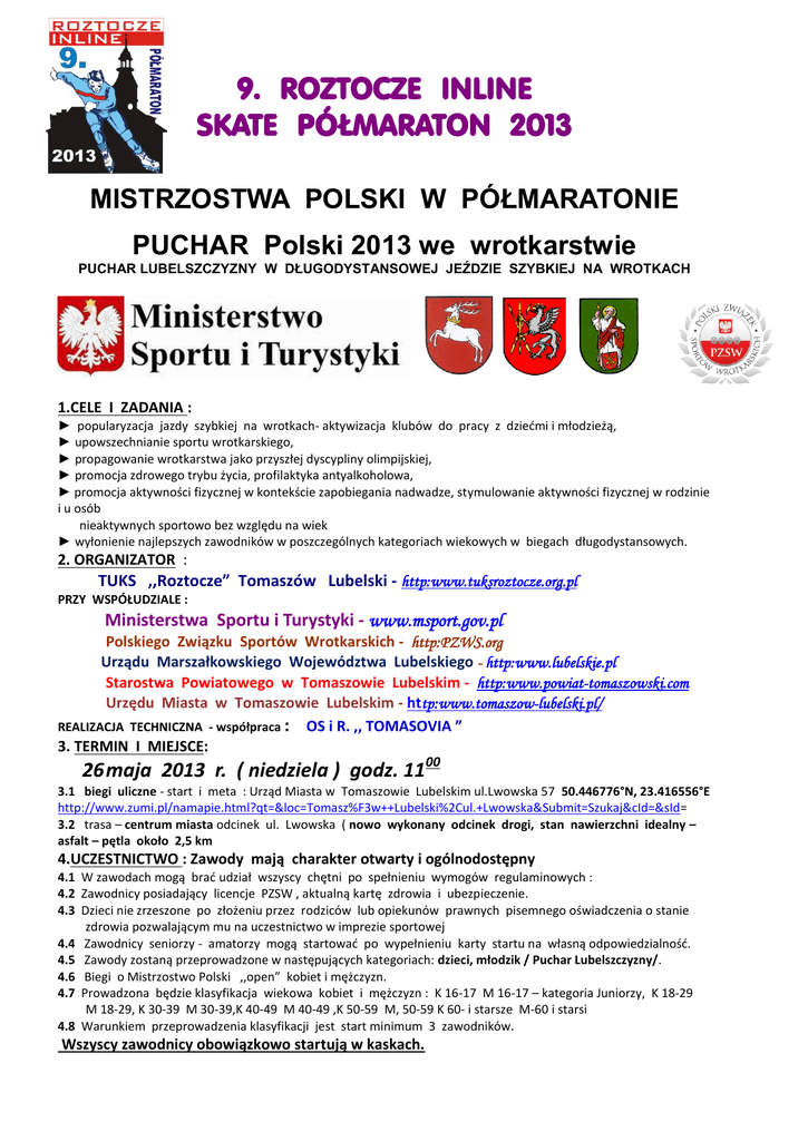 9. ROZTOCZE INLINE SKATE PÓŁMARATON 2013 MISTRZOSTWA POLSKI W PÓŁMARATONIE PUCHAR Polski 2013 we wrotkarstwie PUCHAR LUBELSZCZYZNY W DŁUGODYSTANSOWEJ JEŹDZIE SZYBKIEJ NA WROTKACH 1.CELE I ZADANIA : ► popularyzacja jazdy szybkiej na wrotkach- aktywizacja klubów do pracy z dziećmi i młodzieżą, ► upowszechnianie sportu wrotkarskiego, ► propagowanie wrotkarstwa jako przyszłej dyscypliny olimpijskiej, ► promocja zdrowego trybu życia, profilaktyka antyalkoholowa, ► promocja aktywności fizycznej w kontekście zapobiegania nadwadze, stymulowanie aktywności fizycznej w rodzinie i u osób nieaktywnych sportowo bez względu na wiek ► wyłonienie najlepszych zawodników w poszczególnych kategoriach wiekowych w biegach długodystansowych. 2. ORGANIZATOR : TUKS ,,Roztocze” Tomaszów Lubelski - http:www.tuksroztocze.org.pl PRZY WSPÓŁUDZIALE : Ministerstwa Sportu i Turystyki - www.msport.gov.pl Polskiego Związku Sportów Wrotkarskich - http:PZWS.org Urządu Marszałkowskiego Województwa Lubelskiego - http:www.lubelskie.pl Starostwa Powiatowego w Tomaszowie Lubelskim - http:www.powiat-tomaszowski.com Urzędu Miasta w Tomaszowie Lubelskim - http:www.tomaszow-lubelski.pl/ REALIZACJA TECHNICZNA - współpraca : OS i R. ,, TOMASOVIA ” 3. TERMIN I MIEJSCE: 26 maja 2013 r. ( niedziela ) godz. 1100 3.1 biegi uliczne - start i meta : Urząd Miasta w Tomaszowie Lubelskim ul.Lwowska 57 50.446776°N, 23.416556°E http://www.zumi.pl/namapie.html?qt=&loc=Tomasz%F3w++Lubelski%2Cul.+Lwowska&Submit=Szukaj&cId=&sId= 3.2 trasa – centrum miasta odcinek ul. Lwowska ( nowo wykonany odcinek drogi, stan nawierzchni idealny – asfalt – pętla około 2,5 km 4.UCZESTNICTWO : Zawody mają charakter otwarty i ogólnodostępny 4.1 W zawodach mogą brać udział wszyscy chętni po spełnieniu wymogów regulaminowych : 4.2 Zawodnicy posiadający licencje PZSW , aktualną kartę zdrowia i ubezpieczenie. 4.3 Dzieci nie zrzeszone po złożeniu przez rodziców lub opiekunów prawnych pisemnego oświadczenia o stanie zdrowia pozwalającym mu na uczestnictwo w imprezie sportowej 4.4 Zawodnicy seniorzy - amatorzy mogą startować po wypełnieniu karty startu na własną odpowiedzialność. 4.5 Zawody zostaną przeprowadzone w następujących kategoriach: dzieci, młodzik / Puchar Lubelszczyzny/. 4.6 Biegi o Mistrzostwo Polski ,,open” kobiet i mężczyzn. 4.7 Prowadzona będzie klasyfikacja wiekowa kobiet i mężczyzn : K 16-17 M 16-17 – kategoria Juniorzy, K 18-29 M 18-29, K 30-39 M 30-39,K 40-49 M 40-49 ,K 50-59 M, 50-59 K 60- i starsze M-60 i starsi 4.8 Warunkiem przeprowadzenia klasyfikacji jest start minimum 3 zawodników. Wszyscy zawodnicy obowiązkowo startują w kaskach. 5. KATEGORIE I DYSTANSE KATEGORIE Z PODZIAŁEM KOBIETY / MĘŻCZYŹNI DATA - DYSTANS - Godzina startu ROCZNIK 26 maja 2013 r / niedziela / 2006 i młodsi godz. 11 00 1 000 m JUNIORZY E - skrzat 2004/2005 godz. 11 00 2 333 m JUNIORZY D - żak 2002/2003 godz. 11 10 2 333 m JUNIORZY C - młodzicy 2000/2001 godz. 11 15 4 666 m JUNIORZY - kadeci 1998/1999 JUNIORZY B 1996/1997 Start kobiet start godz. 11 30 JUNIORZY A 194/1995 21 000 Mistrzostwa Polski Open w Półmaratonie z podziałem na mężczyzn i kobiety JUNIORZY F - krasnale SENIORZY 1993 i starsi Start mężczyzn godz.1240 Puchar Lubelszczyzny Mistrzostwa Województwa Lubelskiego Puchar Lubelszczyzny Mistrzostwa Województwa Lubelskiego Puchar Lubelszczyzny Mistrzostwa Województwa Lubelskiego Puchar Lubelszczyzny Mistrzostwa Województwa Lubelskiego Puchar Polski w biegach długodystansowych. 5.1 Prowadzona będzie klasyfikacja w kategoriach wiekowych :K 16-17 M 16-17 – kategoria Juniorzy, K 18-29 M 18-29, K 30-39, M 30-39,K 40-49, M 40-49 ,K 50-59, M, 50-59, K 60- i starsze M-60 i starsi. 5.2 limit czasu dla biegu głównego / półmaratonu/ – 1 godzina 00 5.3 uroczyste zakończenie i losowanie godz. 14 5.4 trasa uliczna zamknięta / główna ulica miasta ul.Lwowska-nowy asfalt -pętla około 2,5 km / 6. SPOSÓB PRZEPROWADZENIA ZAWODÓW Zawody zostaną przeprowadzone wg. przepisów FIRS oraz CERS stosowanych przez PZSW. 7. ZGŁOSZENIA : 7.1 Należy dokonywać na stronie MP w półmaratonie poprzez zapisy internetowe : wejście w zakładkę zapisy lub wejście na stronę :http://www.domtel-sport.pl/zgloszenia_masowe/index.php?LP_impr=24 w przypadku problemów proszę pisać na adres : [email protected] 7.2 Wpisowe w terminie od 12.05 do 23.05 - 30 zł Bieg Główny i 5 zł pozostałe kategorie. Płatne na konto : Nr konta : 44 1020 5385 0000 9202 0038 3620 PKO BP o / Tomaszów Lubelski TUKS Roztocze , 22-600 Tomaszów Lubelski, ul. Kopernika 4, 7.3 Za dodatkową opłatą 10 zł zgłoszenie i wpisowe będzie przyjmowane w dniu zawodów na godzinę przed startem, 7.4 Warunkiem potwierdzającym zgłoszenie jest opłata wpisowego. 8. KLASYFIKACJA I NAGRODY : 8.1 W klasyfikacji w rocznikach za miejsca I-VI dyplomy, za miejsce I-III puchary. 8.2 W kategoriach wiekowych seniorów kobiet mężczyzn za I-III miejsce puchary pozostali dyplomy. 8.3 Kategorie wiekowe :K 16-17 M 16-17 – kategoria Juniorzy, K 18-29 M 18-29, K 30-39, M 30-39,K 40-49, M 40-49 K 50-59, M, 50-59, K 60- i starsze M-60 i starsi. 8.4 Nagrody w biegu Głównym Open kobiet i mężczyzn : I miejsce 300 zł, II miejsce 200 zł, III miejsce 100 zł Wśród wszystkich uczestników rozlosowane zostaną nagrody rzeczowe ( pula nagród 1 000,00 zł ) 8.5 Dla wszystkich uczestników napoje i poczęstunek ( grill + pieczywo ) . 9. ZASADY FINANSOWANIA : 9.1 Koszty organizacyjne zawodów pokrywa Organizator. 9.2 Koszty dojazdu , zakwaterowania i wyżywienia pokrywają zainteresowane kluby i osoby . 9.3 Organizator nie zapewnia ubezpieczenia od następstw nieszczęśliwych wypadków, uczestnicy powinni więc posiadać indywidualne ubezpieczenie wypadkowe i chorobowe. 9.4 Zgłaszający uznaje, że zapoznał się z regulaminem i zobowiązuje się do jego przestrzegania. 9.5 Zgłaszający wyraża zgodę na przetwarzani