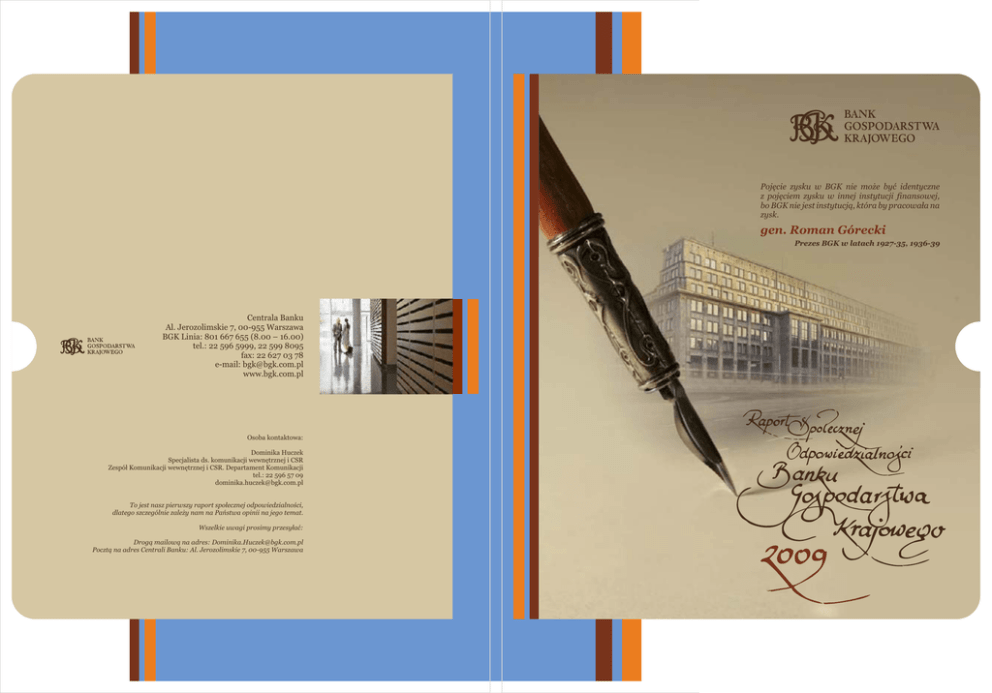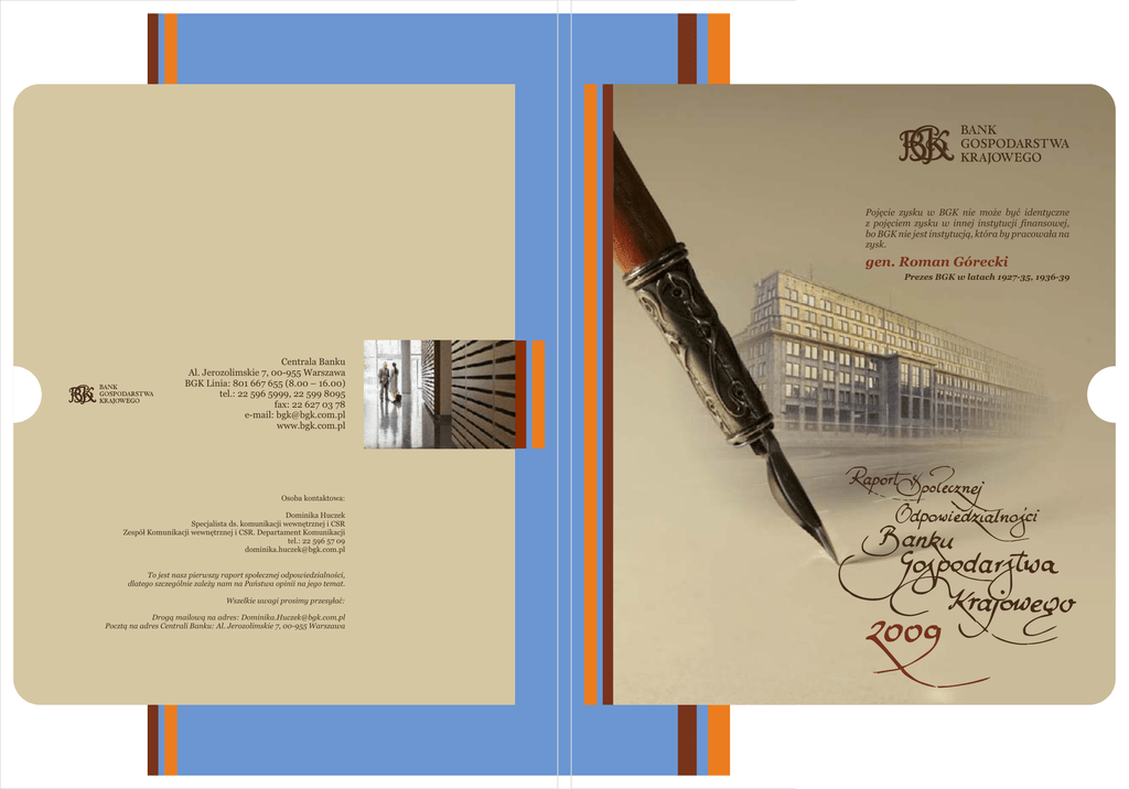 Pojęcie zysku w BGK nie może być identyczne z pojęciem zysku w innej instytucji finansowej, bo BGK nie jest instytucją, która by pracowała na zysk. gen. Roman Górecki Prezes BGK w latach 1927-35, 1936-39 Centrala Banku Al. Jerozolimskie 7, 00-955 Warszawa BGK Linia: 801 667 655 (8.00 – 16.00) tel.: 22 596 5999, 22 599 8095 fax: 22 627 03 78 e-mail: [email protected] www.bgk.com.pl Osoba kontaktowa: Dominika Huczek Specjalista ds. komunikacji wewnętrznej i CSR Zespół Komunikacji wewnętrznej i CSR. Departament Komunikacji tel.: 22 596 57 09 [email protected] To jest nasz pierwszy raport społecznej odpowiedzialności, dlatego szczególnie zależy nam na Państwa opinii na jego temat. Wszelkie uwagi prosimy przesyłać: Drogą mailową na adres: [email protected] Pocztą na adres Centrali Banku: Al. Jerozolimskie 7, 00-955 Warszawa Spis treści Mając na celu najwyższe, wspólne dobro, działamy: 03 List Prezesa Zarządu BGK 04 2. Profil BGK 05 3. O raporcie 06 4. Bank Gospodarstwa Krajowego 10 4.1 Tradycja i wartości BGK 11 4.2 Historia BGK 13 4.3 Władze Banku 16 4.4 Struktura organizacyjna Banku 18 sumienność pracowników w realizacji powierzonych im zadań to podstawa sukcesu, którym chętnie się dzielimy świadomie dążymy do umacniania relacji wybudowanych na zaufaniu, które owocuje już od prawie 90 lat 5. 19 5.1 Zaangażowanie Interesariuszy 22 5.2 Komunikacja z Interesariuszami 24 6. 6.1 Polityka zatrudnienia 25 6.2 Polityka wynagradzania 26 6.3 Praktyki i staże 27 6.4 Struktura zatrudnienia 33 6.5 Rozwój Pracowników 33 6.6 Reprezentacja Pracowników 6.7 Budowanie pozytywnych relacji w miejscu pracy 36 7. Pewny partner biznesowy 36 7.1 Relacje z Klientami 38 7.2 Relacje z Dostawcami 38 8. Wsparcie biznesu i rozwój przedsiębiorczości 38 8.1 Kredyt Technologiczny (KT) 39 8.2 Wsparcie polskiego eksportu 40 8.3 Rozwój przedsiębiorczości 42 9. 02 Rozwój regionalny i wsparcie samorządów 42 9.1 Wsparcie projektów unijnych 42 9.2 Rozwój obszarów wiejskich 43 9.3 Wsparcie dla inwestycji komunalnych 43 9.4 Wsparcie z Europejskiego Banku Inwestycyjnego (EBI) 45 9.5 Obszary miejskie – program na kolejne lata 47 10. Rozwój infrastruktury mieszkaniowej 47 10.1 Rodzina na swoim 48 10.2 Wsparcie budownictwa socjalnego 49 10.3 Program wspierania społecznego budownictwa czynszowego 50 11. Lepsza infrastruktura transportowa 50 11.1 Krajowy Fundusz Drogowy (KFD) 55 11.2 Fundusz Kolejowy (FK) 58 11.3 Fundusz Żeglugi Śródlądowej (FŻŚ) 59 nasze postępowanie odznacza się dbałością o zasady prawne, które rozszerzamy o wewnętrzny kodeks etyczny Stabilny pracodawca 24 34 otwartość na potrzeby innych to przede wszystkim wrażliwość w stosunku do najbliższego otoczenia Społeczna odpowiedzialność biznesu w BGK 12. Ochrona środowiska naturalnego 59 12.1 Segregacja odpadów 59 12.2 Zużycie energii przez BGK 62 12.3 Edukacja ekologiczna 63 12.4 Fundusz Termomodernizacji i Remontów (FTiR) 65 12.5 Program Efektywności Energetycznej (GEF) 65 12.6 Ochrona środowiska lokalnego 66 13. Fundacja im. Jana Kantego Steczkowskiego i zaangażowanie społeczne BGK 67 13.1 Program grantowy Na Dobry Początek! 71 13.2 Program Przyjazne Przedszkole 72 13.3 Program Stypendiów Pomostowych 72 13.4 Program Wolontariat jest super! 78 Indeks wskaźników Global Reporting Initiative 81 Spis tabel i wykresów 82 Słowniczek 83 Dane kontaktowe Wszelkie informacje zawarte w niniejszych materiałach nie mogą być kopiowane, duplikowane, reprodukowane, przetwarzane, wykorzystywane, publikowane w żadnej formie i w jakikolwiek sposób bez zgody Banku Gospodarstwa Krajowego. Spis treści Mając na celu najwyższe, wspólne dobro, działamy: 03 List Prezesa Zarządu BGK 04 2. Profil BGK 05 3. O raporcie 06 4. Bank Gospodarstwa Krajowego 10 4.1 Tradycja i wartości BGK 11 4.2 Historia BGK 13 4.3 Władze Banku 16 4.4 Struktura organizacyjna Banku 18 sumienność pracowników w realizacji powierzonych im zadań to podstawa sukcesu, którym chętnie się dzielimy świadomie dążymy do umacniania relacji wybudowanych na zaufaniu, które owocuje już od prawie 90 lat 5. 19 5.1 Zaangażowanie Interesariuszy 22 5.2 Komunikacja z Interesariuszami 24 6. 6.1 Polityka zatrudnienia 25 6.2 Polityka wynagradzania 26 6.3 Praktyki i staże 27 6.4 Struktura zatrudnienia 33 6.5 Rozwój Pracowników 33 6.6 Reprezentacja Pracowników 6.7 Budowanie pozytywnych relacji w miejscu pracy 36 7. Pewny partner biznesowy 36 7.1 Relacje z Klientami 38 7.2 Relacje z Dostawcami 38 8. Wsparcie biznesu i rozwój przedsiębiorczości 38 8.1 Kredyt Technologiczny (KT) 39 8.2 Wsparcie polskiego eksportu 40 8.3 Rozwój przedsiębiorczości 42 9. 02 Rozwój regionalny i wsparcie samorządów 42 9.1 Wsparcie projektów unijnych 42 9.2 Rozwój obszarów wiejskich 43 9.3 Wsparcie dla inwestycji komunalnych 43 9.4 Wsparcie z Europejskiego Banku Inwestycyjnego (EBI) 45 9.5 Obszary miejskie – program na kolejne lata 47 10. Rozwój infrastruktury mieszkaniowej 47 10.1 Rodzina na swoim 48 10.2 Wsparcie budownictwa socjalnego 49 10.3 Program wspierania społecznego budownictwa czynszowego 50 11. Lepsza infrastruktura transportowa 50 11.1 Krajowy Fundusz Drogowy (KFD) 55 11.2 Fundusz Kolejowy (FK) 58 11.3 Fundusz Żeglugi Śródlądowej (FŻŚ) 59 nasze postępowanie odznacza się dbałością o zasady prawne, które rozszerzamy o wewnętrzny kodeks etyczny Stabilny pracodawca 24 34 otwartość na potrzeby innych to przede wszystkim wrażliwość w stosunku do najbliższego otoczenia Społeczna odpowiedzialność biznesu w BGK 12. Ochrona środowiska naturalnego 59 12.1 Segregacja odpadów 59 12.2 Zużycie energii przez BGK 62 12.3 Edukacja ekologiczna 63 12.4 Fundusz Termomodernizacji i Remontów (FTiR) 65 12.5 Program Efektywności Energetycznej (GEF) 65 12.6 Ochrona środowiska lokalnego 66 13. Fundacja im. Jana Kantego Steczkowskiego i zaangażowanie społeczne BGK 67 13.1 Program grantowy Na Dobry Początek! 71 13.2 Pr