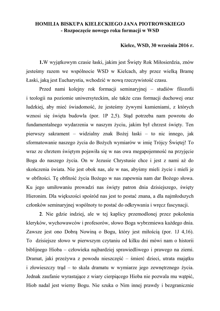 HOMILIA BISKUPA KIELECKIEGO JANA PIOTROWSKIEGO - Rozpoczęcie nowego roku formacji w WSD Kielce, WSD, 30 września 2016 r. 1.W wyjątkowym czasie łaski, jakim jest Święty Rok Miłosierdzia, znów jesteśmy razem we wspólnocie WSD w Kielcach, aby przez wielką Bramę Łaski, jaką jest Eucharystia, wchodzić w nową rzeczywistość czasu. Przed nami kolejny rok formacji seminaryjnej – studiów filozofii i teologii na poziomie uniwersyteckim, ale także czas formacji duchowej oraz ludzkiej, aby mieć świadomość, że jesteśmy żywymi kamieniami, z których wznosi się święta budowla (por. 1P 2,5). Stąd potrzeba nam powrotu do fundamentalnego wydarzenia w naszym życiu, jakim był chrzest święty. Ten pierwszy sakrament – widzialny znak Bożej łaski – to nic innego, jak sformatowanie naszego życia do Bożych wymiarów w imię Trójcy Świętej! To wraz ze chrztem świętym pojawiła się w nas owa megapojemność na przyjęcie Boga do naszego życia. On w Jezusie Chrystusie chce i jest z nami aż do skończenia świata. Nie jest obok nas, ale w nas, abyśmy mieli życie i mieli je w obfitości. Tę obfitość życia Bożego w nas zapewnia nam dar Bożego słowa. Ku jego umiłowaniu prowadzi nas święty patron dnia dzisiejszego, święty Hieronim. Dla większości spośród nas jest to postać znana, a dla najmłodszych członków seminaryjnej wspólnoty to postać do odkrywania i wręcz fascynacji. 2. Nie gdzie indziej, ale w tej kaplicy przemodlonej przez pokolenia kleryków, wychowawców i profesorów, słowo Boga wybrzmiewa każdego dnia. Zawsze jest ono Dobrą Nowiną o Bogu, który jest miłością (por. 1J 4,16). To dzisiejsze słowo w pierwszym czytaniu od kilku dni mówi nam o historii biblijnego Hioba – człowieka najbardziej sprawiedliwego i prawego na ziemi. Dramat, jaki przeżywa z powodu nieszczęść – śmierć dzieci, utrata majątku i złowieszczy trąd – to skala dramatu w wymiarze jego zewnętrznego życia. Jednak zaufanie wyrastające z wiary cierpiącego Hioba nie pozwala mu wątpić, Hiob nadal jest wierny Bogu. Nie szuka o Nim innej prawdy i bezgranicznie zdany jest na Jego wolę. Wierzę, że pieśnią Hiobowego serca były poniekąd słowa słyszane w Psalmie 139. Bóg nie oddala się od człowieka – zna jego drogi, a Boża pomocna ręka jest blisko człowieka. To, co było bolesnym doświadczeniem Bożego męża w niczym nie zmieniło Hioba, i nie zatwardziło rozpaczą jego serca. Życiowe niepowodzenia bardzo często zmieniają naszą relację do Boga, a nierzadko także do najbliższych. Być posłusznym Bogu i przyjmować Jego scenariusz na życie to wyraz absolutnie dojrzałej wiary. W przeciwnym razie nawet cuda nie mają znaczenia i nie będą przekonujące (por. Łk 10,13-16). Sceptycyzm, niewiara, a nade wszystko obojętność bolały także Jezusa, kiedy szedł przez Palestynę z darem Dobrej Nowiny. Wyrazem bólu Jego Boskiego serca było owe ewangeliczne biada! 3. Ufam, że pod naszym adresem Jezus chce skierować inne słowa – te mówiące o nadziei, pokoju, przebaczeniu i miłości. Darem swojego słowa – jak dłutem rzeźbiarza pragnie nas ociosać, abyśmy byli pięknymi kamieniami tej świętej, chociaż wciąż tylko ludzkiej budowli, jaką jest nasze kieleckie seminarium duchowne. Niech Pismo Święte – jak pisał w adhortacji „Verbum Domini” Ojciec Święty Benedykt XVI – będzie sercem i duszą formacji seminaryjnej, łącząc teologię, egzegezę, duchowość i misyjny wymiar kapłańskiego powołania (por. VD 82). Wzrost w codziennej świętości i prawdzie o sobie możliwy jest tam, gdzie jest źródło życia. Jest nim Jezus Chrystus – On sam, Wcielone Słowo. Żywym znakiem Jego obecności jest Eucharystia. Kochajcie eucharystyczne spotkanie z Jezusem i pozwalajcie, aby dotknięcie Ducha Świętego czyniło z was żywą świątynię wiary w drodze do Chrystusowego kapłaństwa. Seminarium to wielka rodzina, która jest wciąż w budowie, a którą się staje, jeśli ludzie pozwalają, aby Jezus Chrystus budował z nimi żywy dom (zob. J. Ratzinger, Głosiciele słowa i słudzy waszej radości, s. 408). Niechaj Maryja, Matka Kapłanów, Matka Miłosierdzia i Pani Łaskawa Kielecka, czuwa nad wami i wyprasza wam potrzebne łaski. Amen.