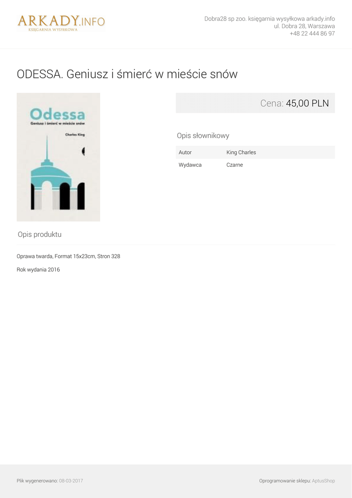 Dobra28 sp zoo. księgarnia wysyłkowa arkady.info ul. Dobra 28, Warszawa +48 22 444 86 97 ODESSA. Geniusz i śmierć w mieście snów Cena: 45,00 PLN Opis słownikowy Autor King Charles Wydawca Czarne Opis produktu Oprawa twarda, Format 15x23cm, Stron 328 Rok wydania 2016 Plik wygenerowano: 08-03-2017 Powered by TCPDF (www.tcpdf.org) Oprogramowanie sklepu: AptusShop
