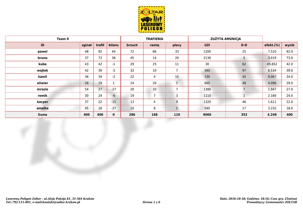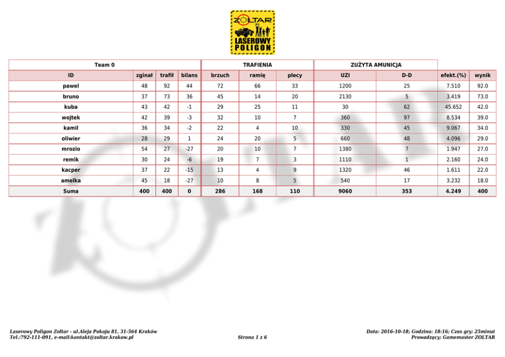 Team 0 TRAFIENIA ZUŻYTA AMUNICJA ID zginał trafił bilans brzuch ramię plecy UZI D-D efekt.(%) wynik pawel 48 92 44 72 66 33 1200 25 7.510 92.0 bruno 37 73 36 45 14 20 2130 5 3.419 73.0 kuba 43 42 -1 29 25 11 30 62 45.652 42.0 wojtek 42 39 -3 32 10 7 360 97 8.534 39.0 kamil 36 34 -2 22 4 10 330 45 9.067 34.0 oliwier 28 29 1 24 20 5 660 48 4.096 29.0 mrozio 54 27 -27 20 10 7 1380 7 1.947 27.0 remik 30 24 -6 19 7 3 1110 1 2.160 24.0 kacper 37 22 -15 13 4 9 1320 46 1.611 22.0 amelka 45 18 -27 10 8 5 540 17 3.232 18.0 Suma 400 400 0 286 168 110 9060 353 4.249 400 Laserowy Poligon Zoltar - ul.Aleja Pokoju 81, 31-564 Kraków Tel.:792-111-091, e-mail:[email protected] Strona 1 z 6 Data: 2016-10-18; Godzina: 18:16; Czas gry: 25minut Prowadzący: Gamemaster ZOLTAR 1 TRAFIENIA ZUŻYTA AMUNICJA ID zginał trafił bilans brzuch ramię plecy UZI D-D efekt.(%) wynik pawel 77 116 39 92 74 51 2100 9 5.500 116.0 oliwier 28 33 5 23 18 11 60 86 22.603 33.0 kamil 36 26 -10 25 6 1 0 124 20.968 26.0 kuba 54 23 -31 17 0 6 120 96 10.648 23.0 amelka 47 16 -31 13 3 2 1350 2 1.183 16.0 Suma 242 214 -28 170 101 71 3630 317 5.422 214 2 TRAFIENIA ZUŻYTA AMUNICJA ID zginał trafił bilans brzuch ramię plecy UZI D-D efekt.(%) wynik bruno 40 72 32 48 46 22 1350 88 5.007 72.0 mrozio 47 60 13 42 16 14 3300 4 1.816 60.0 wojtek 56 41 -15 35 17 9 1680 93 2.312 41.0 kacper 45 40 -5 25 27 18 1020 116 3.521 40.0 remik 26 29 3 16 13 10 930 45 2.974 29.0 Suma 214 242 28 166 119 73 8280 346 2.805 242 Laserowy Poligon Zoltar - ul.Aleja Pokoju 81, 31-564 Kraków Tel.:792-111-091, e-mail:[email protected] 2 1 242 214 Strona 2 z 6 Data: 2016-10-18; Godzina: 18:57; Czas gry: 25minut Prowadzący: Gamemaster ZOLTAR Drużyny Rozgrywki Miejsce Nazwa 1 Laserowy Poligon Zoltar - ul.Aleja Pokoju 81, 31-564 Kraków Tel.:792-111-091, e-mail:[email protected] 2 Suma 2 - 242 242 1 - 214 214 Strona 3 z 6 Data: 2016-10-18 Prowadzący: Gamemaster ZOLTAR Zestawienie wg wyniku Miejsce TRAFIENIA ZUŻYTA AMUNICJA ID zginał trafił bilans brzuch ramię plecy UZI D-D efekt.(%) wynik pawel 150.00 249.60 99.60 196.80 168.00 100.80 3960.00 40.80 6.239 249.60 bruno 92.40 174.00 81.60 111.60 72.00 50.40 4176.00 111.60 4.058 174.00 mrozio 121.20 104.40 -16.80 74.40 31.20 25.20 5616.00 13.20 1.855 104.40 4 wojtek 117.60 96.00 -21.60 80.40 32.40 19.20 2448.00 228.00 3.587 96.00 5 oliwier 67.20 79.20 12.00 55.20 43.20 26.40 144.00 206.40 22.603 79.20 6 kuba 116.40 78.00 -38.40 55.20 30.00 20.40 180.00 189.60 21.104 78.00 7 kacper 98.40 74.40 -24.00 45.60 37.20 32.40 2808.00 194.40 2.478 74.40 8 kamil 86.40 72.00 -14.40 56.40 12.00 13.20 396.00 202.80 12.024 72.00 9 oliwier 67.20 69.60 2.40 57.60 48.00 12.00 1584.00 115.20 4.096 69.60 10 remik 67.20 63.60 -3.60 42.00 24.00 15.60 2448.00 55.20 2.541 63.60 11 amelka 110.40 40.80 -69.60 27.60 13.20 8.40 2268.00 22.80 1.781 40.80 Laserowy Poligon Zoltar - ul.Aleja Pokoju 81, 31-564 Kraków Tel.:792-111-091, e-mail:[email protected] Strona 4 z 6 Data: 2016-10-18 Prowadzący: Gamemaster ZOLTAR Zestawienie wg bilansu Miejsce TRAFIENIA ZUŻYTA AMUNICJA ID zginał trafił bilans brzuch ramię plecy UZI D-D efekt.(%) wynik pawel 150.00 249.60 99.60 196.80 168.00 100.80 3960.00 40.80 6.239 249.60 bruno 92.40 174.00 81.60 111.60 72.00 50.40 4176.00 111.60 4.058 174.00 oliwier 67.20 79.20 12.00 55.20 43.20 26.40 144.00 206.40 22.603 79.20 4 oliwier 67.20 69.60 2.40 57.60 48.00 12.00 1584.00 115.20 4.096 69.60 5 remik 67.20 63.60 -3.60 42.00 24.00 15.60 2448.00 55.20 2.541 63.60 6 kamil 86.40 72.00 -14.40 56.40 12.00 13.20 396.00 202.80 12.024 72.00 7 mrozio 121.20 104.40 -16.80 74.40 31.20 25.20 5616.00 13.20 1.855 104.40 8 wojtek 117.60 96.00 -21.60 80.40 32.40 19.20 2448.00 228.00 3.587 96.00 9 kacper 98.40 74.40 -24.00 45.60 37.20 32.40 2808.00 194.40 2.478 74.40 10 kuba 116.40 78.00 -38.40 55.20 30.00 20.40 180.00 189.60 21.104 78.00 11 amelka 110.40 40.80 -69.60 27.60 13.20 8.40 2268.00 22.80 1.781 40.80 Laserowy Poligon Zoltar - ul.Aleja Pokoju 81, 31-564 Kraków Tel.:792-111-091, e-mail:[email protected] Strona 5 z 6 Data: 2016-10-18 Prowadzący: Gamemaster ZOLTAR Zestawienie wg efektywności Miejsce TRAFIENIA ZUŻYTA AMUNICJA ID zginał trafił bilans brzuch ramię plecy UZI D-D efekt.(%) wynik oliwier 67.20 79.20 12.00 55.20 43.20 26.40 144.00 206.40 22.603 79.20 kuba 116.40 78.00 -38.40 55.20 30.00 20.40 180.00 189.60 21.104 78.00 kamil 86.40 72.00 -14.40 56.40 12.00 13.20 396.00 202.80 12.024 72.00 4 pawel 150.00 249.60 99.60 196.80 168.00 100.80 3960.00 40.80 6.239 249.60 5 oliwier 67.20 69.60 2.40 57.60 48.00 12.00 1584.00 115.20 4.096 69.60 6 bruno 92.40 174.00 81.60 111.60 72.00 50.40 4176.00 111.60 4.058 174.00 7 wojtek 117.60 96.00 -21.60 80.40 32.40 19.20 2448.00 228.00 3.587 96.00 8 remik 67.20 63.60 -3.60 42.00 24.00 15.60 2448.00 55.20 2.541 63.60 9 kacper 98.40 74.40 -24.00 45.60 37.20 32.40 2808.00 194.40 2.478 74.40 10 mrozio 121.20 104.40 -16.80 74.40 31.20 25.20 5616.00 13.20 1.855 104.40 11 amelka 110.40 40.80 -69.60 27.60 13.20 8.40 2268.00 22.80 1.781 40.80 Laserowy Poligon Zoltar - ul.Aleja Pokoju 81, 31-564 Kraków Tel.:792-111-091, e-mail:[email protected] Strona 6 z 6 Data: 2016-10-18 Prowadzący: Gamemaster ZOLTAR