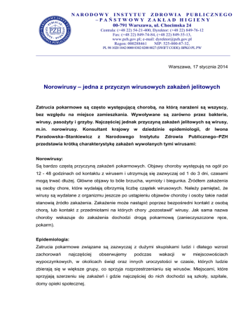 NARODOWY INSTYTUT ZDROWIA PUBLICZNEGO –PAŃSTWOWY ZAKŁAD HIGIENY 00-791 Warszawa, ul. Chocimska 24 Centrala: (+48 22) 54-21-400, Dyrektor: (+48 22) 849-76-12 Fax: (+48 22) 849-74-84, (+48 22) 849-35-13, www.pzh.gov.pl; e-mail: [email protected] Regon: 000288461 NIP: 525-000-87-32, PL 98 1020 1042 0000 8302 0200 8027 (SWIFT CODE): BPKO PL PW Warszawa, 17 stycznia 2014 Norowirusy – jedna z przyczyn wirusowych zakażeń jelitowych Zatrucia pokarmowe są często występującą chorobą, na którą narażeni są wszyscy, bez względu na miejsce zamieszkania. Wywoływane są zarówno przez bakterie, wirusy, pasożyty i grzyby. Najczęściej jednak przyczyną zakażeń jelitowych są wirusy, m.in. norowirusy. Konsultant Paradowska–Stankiewicz z krajowy w Narodowego dziedzinie Instytutu epidemiologii, Zdrowia dr Iwona Publicznego–PZH przedstawia krótką charakterystykę zakażeń wywołanych tymi wirusami: Norowirusy: Są bardzo częstą przyczyną zakażeń pokarmowych. Objawy choroby występują na ogół po 12 - 48 godzinach od kontaktu z wirusem i utrzymują się zazwyczaj od 1 do 3 dni, czasami mogą trwać dłużej. Główne objawy to bóle brzucha, wymioty i biegunka. Źródłem zakażenia są osoby chore, które wydalają olbrzymią liczbę cząstek wirusowych. Należy pamiętać, że wirusy są wydalane z organizmu jeszcze po ustąpieniu objawów choroby i osoby takie nadal stanowią źródło zakażenia. Zakażenie może nastąpić poprzez bezpośredni kontakt z osobą chorą, lub kontakt z przedmiotami na których chory „pozostawił” wirusy. Jak sama nazwa choroby wskazuje do zakażenia dochodzi drogą pokarmową (zanieczyszczone ręce, pokarm). Epidemiologia: Zatrucia pokarmowe związane są zazwyczaj z dużymi skupiskami ludzi i dlatego wzrost zachorowań najczęściej obserwujemy podczas wakacji w miejscowościach wypoczynkowych, w okolicach świąt oraz innych uroczystości w czasie, których ludzie zbierają się w większe grupy, co sprzyja rozprzestrzenianiu się wirusów. Miejscami, które sprzyjają szerzeniu się zakażeń i gdzie najczęściej do nich dochodzi są szkoły, szpitale, domy opieki społecznej. Należy pamiętać, że nieprzestrzeganie podstawowych zasad higieny sprzyja rozprzestrzenianiu się zakażeń! Walka z zakażeniem: Przestrzeganie zasad higieny osobistej oraz higieny przygotowywania posiłków jest najważniejszą, najtańszą i najskuteczniejszą metodą zapobiegania zakażeniom pokarmowym. Zalecane jest również stosowanie środków antyseptycznych (do rąk) oraz dezynfekcji powierzchni, które mogły zostać zanieczyszczone wirusem, czyli przede wszystkim toalet i umywalek. „Grypa żołądkowa” czy „grypa jelitowa” nie istnieje! Dość popularne stało się określenie „grypa żołądkowa”, które w medycynie nie występuje i jego używanie jest nieuzasadnione. Wiele mikroorganizmów może wywoływać zakażenia pokarmowe: bakterie, pasożyty, grzyby, a przede wszystkim wirusy: m.in. astrowirusy, adenowirusy, enterowirusy i oczywiście norowirusy. Należy jednak podkreślić, że przyczyną zakażeń pokarmowych nie są na pewno wirusy grypy. Kontakt dla mediów: Monika Wróbel Rzecznik Prasowy Narodowego Instytutu Zdrowia Publicznego-PZH (NIZP-PZH) Chocimska 24/ 00-791 Warszawa tel. +48 22 542 12 88, tel. kom. +48 696 498 578 [email protected] / www.pzh.gov.pl