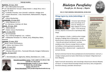 Intencje mszalne: Niedziela, 18 maja 2014 800 + 16r.ś. Mieczysław Gorczyński 930 o bł. dla Sławomira Turczyk z okazji imienin i z okazji 34r.ur. Ani o zdrowie i bł. Boże 1100 + Leokadia Usnarska, Leon Usnarski i rodziców z obojga stron 1230 + Antoni Brzeziński z rodz. Brzezińskich, Maliszewskich, Pazgrad, Andrukajtis 1800 + Maria Wardzyńska Poniedziałek, 19 maja 2014 700 + Zofia Filipowicz w 1r.ś. 1800 4r.ś. Marianna i Andrzej o bł. Boże Wtorek, 20 maja 2014 700 + Aldona Bocian 1800 + Beata i Janusz Hryniewieccy Środa 21 maja 2014 700 + Jan Strzyżewski 1800 + 6r.ś. Andrzej Sanigórski i zm. z rodziny 1800 + Władysław Ponieawż 7r.ś. Marek, Jerzy, Władysław, Adam, Wojciech Czwartek, 22 maja 2014 700 Beata i Janusz Hryniewieccy 1800 ++ Halina i Jan Gryta w 12r.ś. Piątek, 23 maja 2014 700 + Kazimiera Rajca 1800 + Wiesław Mroczek 10r.ś., Franciszek Mroczek, Grzegorz Stefanowicz Sobota, 24 maja 2014 700 + 1800 ++ Bronisława(k), ks. Zygmunta, Heleny, Stanisława zm. z rodz. Załęskicch, Mierzejewskich, Kobylińskich o życie wieczne Kancelaria parafialna czynna: środy i piątki od 15.30 do 17.00; czwartki od 7.30 do 9.00 Adres korespondencyjny: Parafia bł. Doroty z Mątów; ul. Rawska 16a; 82-300 Elbląg Telefon: (55) 235 32 73 Strona internetowa: www.parafia.blogoslawionadorota.org Biuletyn Parafialny Parafii pw. bł. Doroty z Mątów NR 117; PIĄTA NIEDZIELA WIELKANOCNA; 18 MAJ 2014 Kalendarz liturgiczny: Uroczysty ingres biskupa Jacka Jezierskiego do katedry Św. Mikołaja w Elblągu odbędzie 8 czerwca o godz. 17.00. Wcześniej, 28 maja, obejmie on kanonicznie urząd biskupa elbląskiego. – Jako ustępujący z Urzędu, z radością witam mojego Następcę, Drogiego Brata w Biskupstwie – napisał dotychczasowy ordynariusz diecezji biskup Jan Styrna. – Życzę Mu potrzebnych łask Bożych i życzliwej współpracy ludzi. Otoczmy naszego Pasterza serdeczną modlitwą i ochotną gotowością współpracy dla duchowego dobra i zbawienia ludzi – zaapelował do wiernych diecezji. ---------------------Cytat tygodnia: „Człowiek w takiej mierze ma się posługiwać stworzeniami, w jakiej mu one pomagają do osiągnięcia celu życia: czyli służby i chwały Bożej. W takiej zaś mierze ma się ich pozbywać, w jakiej są przeszkodą do tegoż celu. (Fragment Zasady i Fundamentu)” Ignacy Loyola Bp Styrna skierował również słowa podziękowania do duchowieństwa i wiernych, a swojego następcę powierzył opiece Matki Bożej oraz Świętych i Błogosławionych Ziemi Elbląskiej. Papież Franciszek mianował bp. Jacka Jezierskiego ordynariuszem diecezji elbląskiej 10 maja br. na miejsce dotychczasowego biskupa Jana Styrny, który zrezygnował z kierowania diecezją z powodów zdrowotnych. Biskup Jacek Jezierski urodził się 23 grudnia 1949 roku w Olsztynie. W latach 19671974 studiował w Seminarium Duchownym w Olsztynie. Święcenia kapłańskie przyjął w Olsztynie 16 czerwca 1974, w kościele parafialnym pw. Najświętszego Serca Pana Jezusa, z rąk biskupa Józefa Drzazgi. Jako wikariusz pracował w parafii Matki Bożej Nieustającej Pomocy w Malborku (1974-1976) i w parafii św. Mikołaja w Elblągu (1977-78), gdzie prowadził również duszpasterstwo głuchych i niewidomych. 19 lutego 1994 r. otrzymał od papieża Jana Pawła II nominację na biskupa pomocniczego archidiecezji warmińskiej. Święcenia biskupie przyjął 5 marca 1994 w konkatedrze pw. św. Jakuba w Olsztynie. Swoją dewizę biskupią - Veritas Christi Liberat (Prawda Chrystusa wyzwala) - wybrał dla upamiętnienia encykliki Jana Pawła II „Veritatis splendor”. Bp Jacek Jezierski jest teologiem dogmatykiem, specjalizuje się w historii teologii i ekumenizmie. Wykładał m.in. w Kolegium Teologicznym w Kaliningradzie. Z jego inicjatywy odbyły się poszukiwania szczątków doczesnych Mikołaja Kopernika w katedrze fromborskiej. W roku 2004 rozpoczęły się prace archeologiczne, kierowane przez prof. Jerzego Gąssowskiego. Znaleziono szczątki, które po przeprowadzeniu badań specjalistycznych zostały zidentyfikowane jako należące do Wielkiego Astronoma. Dotychczas był biskupem pomocniczym diecezji warmińskiej. Ma 65 lat. Święci znani… i nie znani Święty Adrian z Canterbury, opat Adrian (znany także jako Hadrian) urodził się w VII w. w północnej Afryce. W wieku ok. 10 lat przybył z rodziną do Neapolu, uciekając przed arabską inwazją. Wstąpił do klasztoru benedyktynów niedaleko Monte Cassino. Został z czasem opatem Niridanum, klasztoru na wyspie Nisida w Zatoce Neapolitańskiej. Papież św. Witalian (pontyfikat 657-672) nominował go dwukrotnie na arcybiskupa Canterbury. Adrian odmówił przyjęcia tego zaszczytu, gdyż uważał się za niegodnego. Na to miejsce zaproponował św. Teodora z Tarsu. Witalian zgodził się, ale mianował Adria- na asystentem nowego arcybiskupa Canterbury. Obaj przez Francję wyruszyli w 668 r. do Brytanii. Podczas podróży Adrian został uwięziony przez Ebroina, burmistrza Neustrii we Francji, który podejrzewał, że Święty udaje się do angielskich królów z tajną misją od cesarza Konstansa II. Teodor musiał pojechać dalej sam. Kiedy Adrian został uwolniony, pojechał do Brytanii i tam został mianowany opatem w klasztorze świętych Piotra i Pawła w Canterbury (późniejsze opactwo św. Augustyna z Canterbury). Adrian wspierał biskupa Teodora w umacnianiu rzymskiego Kościoła w Anglii. Jemu przypisuje się zasługę utrwalenia chorału gregoriańskiego w angielskich kościołach. Opat Adrian przekształcił szkołę klasztorną w Canterbury w prężny ośrodek naukowy, w którym wiedzę pobierało wielu studentów, także z zagranicy. Oprócz prowadzenia studiów biblijnych, nauczał tam greki i łaciny, matematyki, poezji i astronomii. Tłumaczył też na staroangielski. Zmarł 9 stycznia 710 roku i został pochowany w klasztornym kościele. Jego grób stał się miejscem licznych pielgrzymek za sprawą c