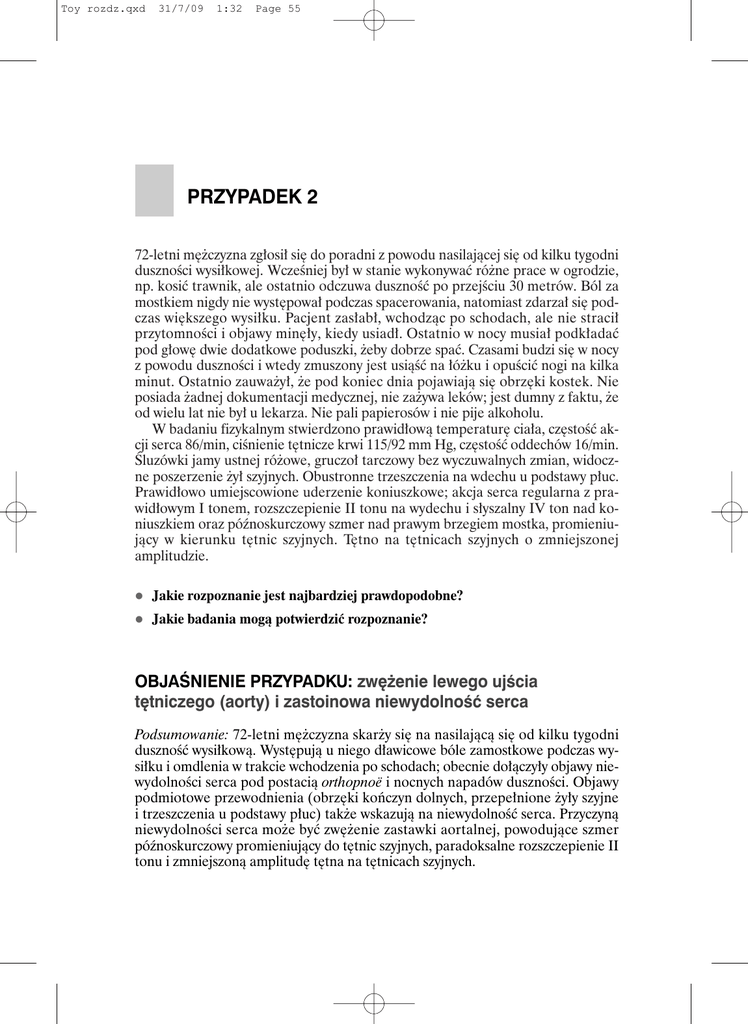 Toy rozdz.qxd 31/7/09 1:32 Page 55 PRZYPADEK 2 72-letni m´˝czyzna zg∏osi∏ si´ do poradni z powodu nasilajàcej si´ od kilku tygodni dusznoÊci wysi∏kowej. WczeÊniej by∏ w stanie wykonywaç ró˝ne prace w ogrodzie, np. kosiç trawnik, ale ostatnio odczuwa dusznoÊç po przejÊciu 30 metrów. Ból za mostkiem nigdy nie wyst´powa∏ podczas spacerowania, natomiast zdarza∏ si´ podczas wi´kszego wysi∏ku. Pacjent zas∏ab∏, wchodzàc po schodach, ale nie straci∏ przytomnoÊci i objawy min´∏y, kiedy usiad∏. Ostatnio w nocy musia∏ podk∏adaç pod g∏ow´ dwie dodatkowe poduszki, ˝eby dobrze spaç. Czasami budzi si´ w nocy z powodu dusznoÊci i wtedy zmuszony jest usiàÊç na ∏ó˝ku i opuÊciç nogi na kilka minut. Ostatnio zauwa˝y∏, ˝e pod koniec dnia pojawiajà si´ obrz´ki kostek. Nie posiada ˝adnej dokumentacji medycznej, nie za˝ywa leków; jest dumny z faktu, ˝e od wielu lat nie by∏ u lekarza. Nie pali papierosów i nie pije alkoholu. W badaniu fizykalnym stwierdzono prawid∏owà temperatur´ cia∏a, cz´stoÊç akcji serca 86/min, ciÊnienie t´tnicze krwi 115/92 mm Hg, cz´stoÊç oddechów 16/min. Âluzówki jamy ustnej ró˝owe, gruczo∏ tarczowy bez wyczuwalnych zmian, widoczne poszerzenie ˝y∏ szyjnych. Obustronne trzeszczenia na wdechu u podstawy p∏uc. Prawid∏owo umiejscowione uderzenie koniuszkowe; akcja serca regularna z prawid∏owym I tonem, rozszczepienie II tonu na wydechu i s∏yszalny IV ton nad koniuszkiem oraz póênoskurczowy szmer nad prawym brzegiem mostka, promieniujàcy w kierunku t´tnic szyjnych. T´tno na t´tnicach szyjnych o zmniejszonej amplitudzie. Jakie rozpoznanie jest najbardziej prawdopodobne? Jakie badania mogà potwierdziç rozpoznanie? OBJAÂNIENIE PRZYPADKU: zw´˝enie lewego ujÊcia t´tniczego (aorty) i zastoinowa niewydolnoÊç serca Podsumowanie: 72-letni m´˝czyzna skar˝y si´ na nasilajàcà si´ od kilku tygodni dusznoÊç wysi∏kowà. Wyst´pujà u niego d∏awicowe bóle zamostkowe podczas wysi∏ku i omdlenia w trakcie wchodzenia po schodach; obecnie do∏àczy∏y objawy niewydolnoÊci serca pod postacià orthopnoë i nocnych napadów dusznoÊci. Objawy podmiotowe przewodnienia (obrz´ki koƒczyn dolnych, przepe∏nione ˝y∏y szyjne i trzeszczenia u podstawy p∏uc) tak˝e wskazujà na niewydolnoÊç serca. Przyczynà niewydolnoÊci serca mo˝e byç zw´˝enie zastawki aortalnej, powodujàce szmer póênoskurczowy promieniujàcy do t´tnic szyjnych, paradoksalne rozszczepienie II tonu i zmniejszonà amplitud´ t´tna na t´tnicach szyjnych. Toy rozdz.qxd 31/7/09 1:32 Page 56 SzeÊçdziesiàt przypadków internistycznych 56 Najbardziej prawdopodobne rozpoznanie: nabyta zastoinowa niewydolnoÊç serca spowodowana zw´˝eniem lewego ujÊcia t´tniczego. Dalsze badania diagnostyczne: echokardiografia w celu oceny pola powierzchni zastawki aorty i funkcji skurczowej lewej komory. Analiza przypadku Cele 1. Poznaç przyczyny przewlek∏ej niewydolnoÊci serca (niedokrwienie, nadciÊnienie, wada zastawkowa, nadu˝ywanie alkoholu, za˝ywanie kokainy, tyreotoksykoza). 2. Odró˝niç niewydolnoÊç skurczowà od rozkurczowej. 3. Poznaç sposoby leczenia ostrej i przewlek∏ej niewydolnoÊci serca. 4. Poznaç mo˝liwe powik∏ania leczenia, jak hipokaliemia, hiperkaliemia, upoÊledzenie czynnoÊci nerek, zatrucie digoksynà. 5. Poznaç mo˝liwoÊci oceny zw´˝enia lewego ujÊcia t´tniczego (stenozy aortalnej) i wskazania do wymiany zastawki. Rozwa˝ania U opisywanego starszego pacjenta wyst´pujà przedmiotowe i podmiotowe objawy zw´˝enia zastawki aortalnej. Objawy zw´˝enia zastawki zaostrzy∏y si´ (od wyst´powania objawów dusznicowych i objawów poprzedzajàcych omdlenie, a˝ do niewydolnoÊci serca), co wskazuje na nasilenie zw´˝enia zastawki i pogorszenie rokowania. Nale˝y w trybie pilnym oceniç powierzchni´ zastawki i stan naczyƒ wieƒcowych, aby zakwalifikowaç chorego do ewentualnej wymiany zastawki. POST¢POWANIE W PRZYPADKU PODEJRZENIA NIEWYDOLNOÂCI SERCA Definicje Ostra niewydolnoÊç serca: nag∏e (w ciàgu kilku dni lub godzin) wystàpienie objawów niewydolnoÊci serca, takich jak obrz´k p∏uc lub zmniejszenie frakcji wyrzutowej, a w ci´˝szych przypadkach – wstrzàs kardiogenny. Przewlek∏a niewydolnoÊç serca: objawy niewydolnoÊci serca utrzymujàce si´ przewlekle (miesiàcami, latami), przy czym stopieƒ ich nasilenia mo˝e byç ró˝ny: od niezauwa˝alnych do ci´˝kich. UpoÊledzenie czynnoÊci rozkurczowej: zwi´kszenie ciÊnienia nape∏niania spowodowane upoÊledzeniem relaksacji i zmniejszeniem podatnoÊci Êcian komory na rozciàganie. Toy rozdz.qxd 31/7/09 1:32 Page 57 Przypadek 2 57 UpoÊledzenie czynnoÊci skurczowej: zmniejszenie frakcji wyrzutowej spowodowane upoÊledzeniem czynnoÊci skurczowej komory. PodejÊcie kliniczne Zastoinowa niewydolnoÊç serca to zespó∏ objawów, który pojawia si´ wtedy, gdy serce nie mo˝e pokryç potrzeb metabolicznych ustroju mimo prawid∏owego ciÊnienia nape∏niania komory. Odpowiedzià na taki stan sà liczne zmiany neurohormonalne, w tym aktywacja osi renina-angiotensyna-aldosteron i uk∏adu wspó∏czulnego, które poczàtkowo powodujà wyrównanie istniejàcej niewydolnoÊci serca, ale w póêniejszym okresie pogarszajà jego czynnoÊç. Objawy niewydolnoÊci serca mogà byç wynikiem skurczowej niewydolnoÊci serca (niewydolnoÊci rzutu – forward failure) (ma∏a frakcja wyrzutowa lub upoÊledzenie skurczu komór) lub rozkurczowej niewydolnoÊci serca (niewydolnoÊci wstecznej – backward failure) (zwi´kszone ciÊnienie nape∏niania lub upoÊledzenie rozkurczu komór). Do objawów skurczowej niewydolnoÊci serca zalicza si´: os∏abienie, sennoÊç i niskie ciÊnienie t´tnicze, a do objawów rozkurczowej niewydolnoÊci serca zalicza si´: dusznoÊç, obrz´ki obwodowe i wodobrzusze. U niektórych chorych upoÊledzona jest jedynie czynnoÊç rozkurczowa, a frakcja wyrzutowa pozostaje praw