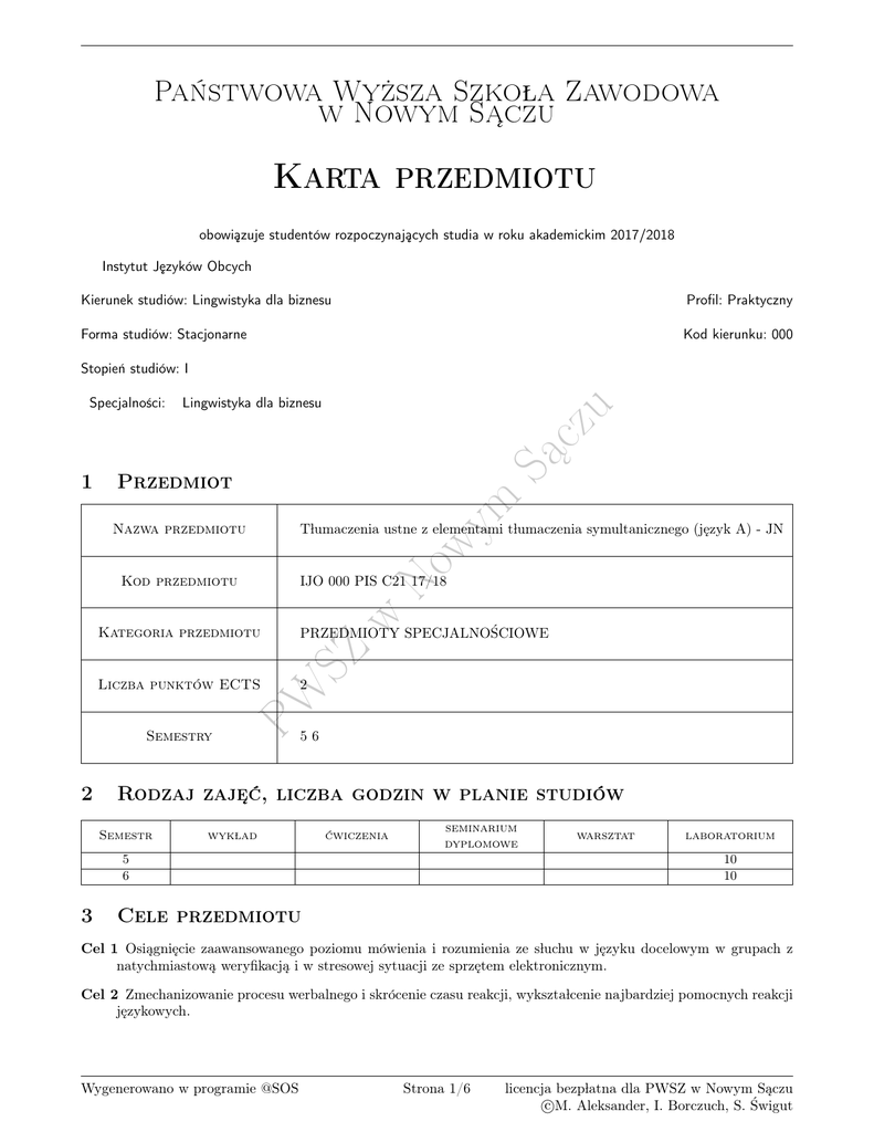 Państwowa Wyższa Szkola Zawodowa w Nowym Sa˛czu Karta przedmiotu obowia˛zuje studentów rozpoczynaja˛cych studia w roku akademickim 2017/2018 Instytut Je˛zyków Obcych Kierunek studiów: Lingwistyka dla biznesu Profil: Praktyczny Forma studiów: Stacjonarne Kod kierunku: 000 Stopień studiów: I Przedmiot Nazwa przedmiotu w 2 PW Liczba punktów ECTS PRZEDMIOTY SPECJALNOŚCIOWE SZ Kategoria przedmiotu 2 Tlumaczenia ustne z elementami tlumaczenia symultanicznego (je˛zyk A) - JN IJO 000 PIS C21 17/18 Kod przedmiotu Semestry No wy m 1 Lingwistyka dla biznesu Sa˛ cz u Specjalności: 56 Rodzaj zaje˛ć, liczba godzin w planie studiów Semestr wyklad ćwiczenia seminarium dyplomowe 5 6 3 warsztat laboratorium 10 10 Cele przedmiotu Cel 1 Osia˛gnie˛cie zaawansowanego poziomu mówienia i rozumienia ze sluchu w je˛zyku docelowym w grupach z natychmiastowa˛ weryfikacja˛ i w stresowej sytuacji ze sprze˛tem elektronicznym. Cel 2 Zmechanizowanie procesu werbalnego i skrócenie czasu reakcji, wyksztalcenie najbardziej pomocnych reakcji je˛zykowych. Wygenerowano w programie @SOS Strona 1/6 licencja bezplatna dla PWSZ w Nowym Sa˛czu c M. Aleksander, I. Borczuch, S. Świgut Państwowa Wyższa Szkola Zawodowa w Nowym Sa˛czu 4 Wymagania wste˛pne w zakresie wiedzy, umieje˛tności i innych kompetencji a poziom znajomości je˛zyka C1 Efekty ksztalcenia 5 EK1 Wiedza: Student zna i rozumie podstawowe mechanizmy metod tlumaczeniowych, w szczególowym odniesieniu do studiowanego je˛zyka i w porównawczym odniesieniu do je˛zyka polskiego EK2 Umieje˛tności: Student potrafi tlumaczyć technika˛ a vista latwe teksty specjalistyczne z je˛zyka niemieckiego na je˛zyk polski oraz teksty popularne z polskiego na niemiecki EK3 Umieje˛tności: Student umie przetlumaczyć teksty mówione z niewielkim opóźnieniem czasowym (tlumaczenie konsekutywne) EK4 Umieje˛tności: Student potrafi wykonać proste tlumaczenie symultaniczne po przygotowaniu tematyki 6 Sa˛ cz u EK5 Kompetencje spoleczne: Student ma świadomość poziomu swojej wiedzy i umieje˛tności, rozumie potrzebe˛ cia˛glego doksztalcania sie˛ Treści programowe L2 L3 No wy PW L4 w L1 Tematyka zaje˛ć Opis szczególowy bloków tematycznych Ćwiczenie technik tlumaczeniowych na podstawie prostych tekstów specjalistycznych i popularnych. Ćwiczenie szybkości reakcji w technice a vista. Tlumaczenie wypowiedzi rzeczywistych z niewielkim opóźnieniem czasowym. Ćwiczenie tlumaczeń symultanicznych w kabinach. Nauka obslugi sprze˛tu w pracowni symultanicznej. Podstawy teoretyczne: przygotowanie sie˛ do wykonania tlumaczenia, sluchanie i rozumienie tekstu, sporza˛dzanie notatek podczas tlumaczenia. Dyskusja panelowa. Symulacja roli przewodnika dla grup niemieckoje˛zycznych. Razem SZ Lp m laboratorium 7 Liczba godzin 10 2 4 4 20 Metody dydaktyczne M1 Ćwiczenia laboratoryjne M2 Ćwiczenia projektowe M3 Symulacja laboratoryjna M4 Metoda kombinowana Wygenerowano w programie @SOS Strona 2/6 licencja bezplatna dla PWSZ w Nowym Sa˛czu c M. Aleksander, I. Borczuch, S. Świgut Państwowa Wyższa Szkola Zawodowa w Nowym Sa˛czu 8 Obcia˛żenie praca˛ studenta Średnia liczba godzin na zrealizowanie aktywności Forma aktywności 9 Sa˛ cz u Godziny kontaktowe z nauczycielem akademickim, w tym: Godziny wynikaja˛ce z planu studiów 20 Konsultacje przedmiotowe 10 Egzaminy i zaliczenia w sesji 2 Godziny bez udzialu nauczyciela akademickiego wynikaja˛ce z nakladu pracy studenta, w tym: Przygotowanie sie˛ do zaje˛ć, w tym studiowanie zalecanej literatury 10 Opracowanie wyników 8 Przygotowanie raportu, projektu, prezentacji, dyskusji 0 Sumaryczna liczba godzin dla przedmiotu wynikaja˛ca z 50 calego nakladu pracy studenta Sumaryczna liczba punktów ECTS dla przedmiotu 2 Sposoby oceny Ocena formuja˛ca m F1 Odpowiedź ustna No wy F2 Aktywność na zaje˛ciach F3 Zaliczenie praktyczne w F4 Test Kryteria oceny PW 1 Ocena z ćwiczeń praktycznych SZ Ocena aktywności bez udzialu nauczyciela akademickiego Efekt ksztalcenia 1 Na ocene˛ 3 Na ocene˛ 4 Na ocene˛ 5 Na ocene˛ 3 Miejsce weryfikacji Opis weryfikacji EK 1 laboratorium test Miejsce weryfikacji Opis weryfikacji EK 2 Student zna metody tlumaczeniowe Student zna metody tlumaczeniowe, potrafi definiować podstawowe poje˛cia Student zna metody tlumaczeniowe, potrafi definiować podstawowe poje˛cia, zna zasady sporza˛dzania notatek, przygotowania do wykonania tlumaczenia Efekt ksztalcenia 2 Student czyta tekst źródlowy ze zrozumieniem i równocześnie tlumaczy go technika˛ a vista z je˛z. niem. na je˛z. polski zachowuja˛c sens tekstu wyjściowego Wygenerowano w programie @SOS laboratorium Strona 3/6 Średnia ważona z zaliczeń ustnych, odpowiadaja˛cych poszczególnym metodom tlumaczeń ustnych licencja bezplatna dla PWSZ w Nowym Sa˛czu c M. Aleksander, I. Borczuch, S. Świgut Państwowa Wyższa Szkola Zawodowa w Nowym Sa˛czu Na ocene˛ 3 Na ocene˛ 4 Na ocene˛ 5 Na ocene˛ 3 Na ocene˛ 4 Na ocene˛ 5 Student wykonuje proste tlumaczenia symultaniczne w obu kierunkach Student wykonuje proste tlumaczenia symultaniczne w obu kierunkach, plynnie tlumaczy teksty wcześniej przygotowane Student wykonuje proste tlumaczenia symultaniczne w obu kierunkach, plynnie tlumaczy teksty wcześniej przygotowane w sposób prawidlowy pod wzgle˛dem je˛zykowym i merytorycznym Efekt ksztalcenia 5 Średnia ważona z zaliczeń ustnych, odpowiadaja˛cych poszczególnym metodom tlumaczeń ustnych Sa˛ cz u laboratorium Opis weryfikacji EK 3 m Na ocene˛ 5 Miejsce weryfikacji No wy Na ocene˛ 4 Student potrafi przetlumaczyć technika˛ konsekutywna˛ proste i krótkie wypowiedzi na je˛zyk niemiecki oraz średniej dlugości teksty na je˛zyk polski Student potrafi przetlumaczyć technika˛ konsekutywna˛ krótkie wypowiedzi potrafi przetlumaczyć technika˛ konsekutywna˛ krótkie wypowiedzi o średnim stopniu trudności na je˛zyk niemiecki oraz dluższe teksty na je˛zyk polski Student potrafi przetlumaczy