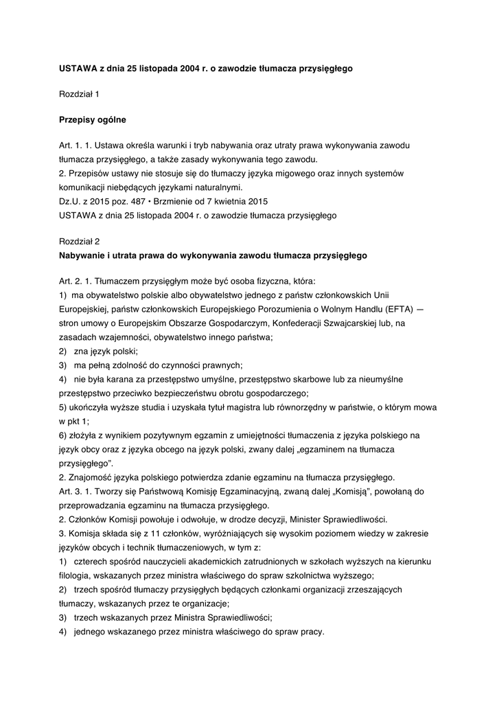 USTAWA z dnia 25 listopada 2004 r. o zawodzie tłumacza przysięgłego Rozdział 1 Przepisy ogólne Art. 1. 1. Ustawa określa warunki i tryb nabywania oraz utraty prawa wykonywania zawodu tłumacza przysięgłego, a także zasady wykonywania tego zawodu. 2. Przepisów ustawy nie stosuje się do tłumaczy języka migowego oraz innych systemów komunikacji niebędących językami naturalnymi. Dz.U. z 2015 poz. 487 • Brzmienie od 7 kwietnia 2015 USTAWA z dnia 25 listopada 2004 r. o zawodzie tłumacza przysięgłego Rozdział 2 Nabywanie i utrata prawa do wykonywania zawodu tłumacza przysięgłego Art. 2. 1. Tłumaczem przysięgłym może być osoba fizyczna, która: 1) ma obywatelstwo polskie albo obywatelstwo jednego z państw członkowskich Unii Europejskiej, państw członkowskich Europejskiego Porozumienia o Wolnym Handlu (EFTA) — stron umowy o Europejskim Obszarze Gospodarczym, Konfederacji Szwajcarskiej lub, na zasadach wzajemności, obywatelstwo innego państwa; 2) zna język polski; 3) ma pełną zdolność do czynności prawnych; 4) nie była karana za przestępstwo umyślne, przestępstwo skarbowe lub za nieumyślne przestępstwo przeciwko bezpieczeństwu obrotu gospodarczego; 5) ukończyła wyższe studia i uzyskała tytuł magistra lub równorzędny w państwie, o którym mowa w pkt 1; 6) złożyła z wynikiem pozytywnym egzamin z umiejętności tłumaczenia z języka polskiego na język obcy oraz z języka obcego na język polski, zwany dalej „egzaminem na tłumacza przysięgłego”. 2. Znajomość języka polskiego potwierdza zdanie egzaminu na tłumacza przysięgłego. Art. 3. 1. Tworzy się Państwową Komisję Egzaminacyjną, zwaną dalej „Komisją”, powołaną do przeprowadzania egzaminu na tłumacza przysięgłego. 2. Członków Komisji powołuje i odwołuje, w drodze decyzji, Minister Sprawiedliwości. 3. Komisja składa się z 11 członków, wyróżniających się wysokim poziomem wiedzy w zakresie języków obcych i technik tłumaczeniowych, w tym z: 1) czterech spośród nauczycieli akademickich zatrudnionych w szkołach wyższych na kierunku filologia, wskazanych przez ministra właściwego do spraw szkolnictwa wyższego; 2) trzech spośród tłumaczy przysięgłych będących członkami organizacji zrzeszających tłumaczy, wskazanych przez te organizacje; 3) trzech wskazanych przez Ministra Sprawiedliwości; 4) jednego wskazanego przez ministra właściwego do spraw pracy. 4. Kadencja Komisji trwa 4 lata. 5. Na wniosek Komisji, Minister Sprawiedliwości może powołać nie więcej niż dwóch konsultantów, spełniających wymagania określone dla członków Komisji, do udziału w przeprowadzeniu egzaminu z określonego języka. 6. Członkom Komisji oraz konsultantom, o których mowa w ust. 5, przysługuje wynagrodzenie za udział w pracach Komisji oraz zwrot kosztów podróży i noclegów na zasadach określonych w przepisach dotyczących należności przysługujących pracownikowi zatrudnionemu w państwowej lub samorządowej jednostce sfery budżetowej z tytułu podróży służbowej na obszarze kraju. 7. Przed upływem kadencji członek Komisji może być odwołany wskutek niewykonywania obowiązków członka, niezdolności do ich wykonywania albo zrzeczenia się członkostwa. 8. Obsługę biurową Komisji zapewnia Minister Sprawiedliwości. 9. Minister Sprawiedliwości określi, w drodze rozporządzenia, tryb działania Komisji oraz wysokość wynagrodzenia członków Komisji i konsultantów za udział w jej pracach, w sposób zapewniający sprawność działania Komisji oraz uwzględniając zakres i nakład ich pracy wynikający z przygotowania i przeprowadzenia egzaminu. Akty wykonawcze Art. 4. 1. Egzamin na tłumacza przysięgłego składa się z dwóch części: 1) tłumaczenia pisemnego, z języka polskiego na język obcy oraz z języka obcego na język polski; 2) tłumaczenia ustnego, z języka polskiego na język obcy oraz z języka obcego na język polski. 2. Egzamin na tłumacza przysięgłego uważa się za zdany w przypadku uzyskania pozytywnych ocen z obu części egzaminu wskazanych w ust. 1. 3. (uchylony) 4. Koszty egzaminu, w tym opłatę egzaminacyjną, ponosi kandydat na tłumacza przysięgłego. 5. Opłata egzaminacyjna stanowi dochód budżetu państwa. 6. Minister Sprawiedliwości określi, w drodze rozporządzenia, wysokość opłaty egzaminacyjnej ponoszonej przez kandydata na tłumacza przysięgłego, biorąc pod uwagę rzeczywiste koszty organizacji i przeprowadzenia egzaminu. 7. Minister Sprawiedliwości określi, w drodze rozporządzenia, szczegółowy sposób przeprowadzenia egzaminu w części pisemnej i ustnej, z uwzględnieniem obowiązku sprawdzenia umiejętności tłumaczenia pism sądowych i urzędowych oraz tekstów prawniczych. Akty wykonawcze Art. 5. 1. Uprawnienia do wykonywania zawodu tłumacza przysięgłego nabywa osoba, która zdała egzamin określony w art. 4 ust. 1. 2. Nabycie uprawnień do wykonywania zawodu tłumacza przysięgłego potwierdza świadectwo wydane przez Ministra Sprawiedliwości. Art. 6. 1. Osoba, która nabyła uprawnienia do wykonywania zawodu tłumacza przysięgłego, uzyskuje prawo do wykonywania tego zawodu po złożeniu ślubowania i wpisaniu na listę tłumaczy przysięgłych. 2. Osoba, która złożyła ślubowanie, o którym mowa w ust. 1, podlega z urzędu wpisowi na listę tłumaczy przysięgłych prowadzoną przez Ministra Sprawiedliwości. 3. Minister Sprawiedliwości określi, w drodze rozporządzenia, wzór świadectwa, o którym mowa w art. 5 ust. 2, oraz sposób prowadzenia listy tłumaczy przysięgłych, przy uwzględnieniu możliwości prowadzenia tej listy w formie elektronicznej. Akty wykonawcze Art. 7. 1. Tłumacz przysięgły składa wobec Ministra Sprawiedliwości ślubowanie według następującej roty: „Mając świadomość znaczenia moich słów i odpowiedzialności przed prawem, przyrzekam uroczyście, że powierzone mi zadania tłumacza przysięgłego będę
