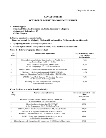 Głogów 04.07.2013 r. ZAWIADOMIENIE O WYBORZE OFERTY NAJKORZYSTNIEJSZEJ 1. Zamawiający: Miejska Biblioteka Publiczna im. Galla Anonima w Głogowie ul. Jedności Robotniczej 15 67-200 Głogów 2. Nazwa przedmiotu zamówienia: Dostawa książek do Miejskiej Biblioteki Publicznej im. Galla Anonima w Głogowie. 3. Tryb postępowania: przetarg nieograniczony 4. Wykaz wykonawców, którzy złożyli oferty, wraz ze streszczeniem ofert: Część 1 – Literatura piękna dla dorosłych Nr oferty Nazwa i adres wykonawcy Kryterium oceny ofert – cena – 100% Ilość punktów 1 Głowna Księgarnia Szkolna Gajewicz, Gawin, Widłak Sp. J. Al. Daszyńskiego 16, 31-534 Kraków 90,66 2 Firma Handlowo-Księgarska „STAŃCZYK” ul. Ks. Ściegiennego 32, 37-464 Stalowa Wola 94,67 3 PPPHU „VIKA” Renata Musielska Lubanów 28b, 98-235 Błaszki 100,00 4 Naukowa PL Księgarnia Prawnicza IURIS PRUDIENTA Katarzyna Glimasińska Plac M.C. Skłodowskiej 5 20-031 Lublin 91,74 5 LAND L Firma Dystrybucyjno- Wydawnicza Sp. z o.o. 80-298 Gdańsk Budowlanych 64 F 95,31 6 Platon Sp. z o.o. ul. Sławęcińska 16, Macierzysz, 05-850 Ożarów Mazowiecki 97,54 Część 2 – Literatura dla dzieci i młodziży Nr oferty Nazwa i adres wykonawcy Kryterium oceny ofert – cena – 100% Ilość punktów 1 Głowna Księgarnia Szkolna Gajewicz, Gawin, Widłak Sp. J. Al. Daszyńskiego 16, 31-534 Kraków 85,92 2 Firma Handlowo-Księgarska „STAŃCZYK” ul. Ks. Ściegiennego 32, 37-464 Stalowa Wola 85,31 3 PPPHU „VIKA” Renata Musielska Lubanów 28b, 98-235 Błaszki 100,00 4 Naukowa PL Księgarnia Prawnicza IURIS PRUDIENTA Katarzyna Glimasińska Plac M.C. Skłodowskiej 5 20-031 Lublin 84,18 5 LAND L Firma Dystrybucyjno- Wydawnicza Sp. z o.o. 80-298 Gdańsk Budowlanych 64 F 86,81 6 Platon Sp. z o.o. ul. Sławęcińska 16, Macierzysz, 05-850 Ożarów Mazowiecki 89,61 Część 3 – Literatura popularno - naukowa Nr oferty Nazwa i adres wykonawcy Kryterium oceny ofert – cena – 100% Ilość punktów 1 Głowna Księgarnia Szkolna Gajewicz, Gawin, Widłak Sp. J. Al. Daszyńskiego 16, 31-534 Kraków 91,50 2 Firma Handlowo-Księgarska „STAŃCZYK” ul. Ks. Ściegiennego 32, 37-464 Stalowa Wola 93,34 3 PPPHU „VIKA” Renata Musielska Lubanów 28b, 98-235 Błaszki 100,00 4 Naukowa PL Księgarnia Prawnicza IURIS PRUDIENTA Katarzyna Glimasińska Plac M.C. Skłodowskiej 5 20-031 Lublin 92,62 5 LAND L Firma Dystrybucyjno- Wydawnicza Sp. z o.o. 80-298 Gdańsk Budowlanych 64 F 94,93 5. Wybór ofert najkorzystniejszej a/ cześć 1 – Literatura piękna dla dorosłych - nazwa wykonawcy –PPPHU „VIKA” Renata Musielska Lubanów 28b, 98-235 Błaszki - adres: Lubanów 28b, 98-235 Błaszki - tel./fax tel. 661 545 270 fax 43 827 34 73 - cena wybranej oferty: 15.667,13 zł - uzasadnienie wyboru oferty: Oferta spełniła wszystkie warunki określone przez Zamawiającego w SIWZ oraz uzyskała najwyższą ilość punktów w ostatecznej ocenie. b/ cześć 2 – Literatura dla dzieci i młodzieży - nazwa wykonawcy –PPPHU „VIKA” Renata Musielska Lubanów 28b, 98-235 Błaszki - adres: Lubanów 28b, 98-235 Błaszki - tel./fax tel. 661 545 270 fax 43 827 34 73 - cena wybranej oferty: 1.178,79 zł - uzasadnienie wyboru oferty: Oferta spełniła wszystkie warunki określone przez Zamawiającego w SIWZ oraz uzyskała najwyższą ilość punktów w ostatecznej ocenie. c/ cześć 3 – Literatura popularno - naukowa - nazwa wykonawcy –PPPHU „VIKA” Renata Musielska Lubanów 28b, 98-235 Błaszki - adres: Lubanów 28b, 98-235 Błaszki - tel./fax tel. 661 545 270 fax 43 827 34 73 - cena wybranej oferty: 1.412,83 zł - uzasadnienie wyboru oferty: Oferta spełniła wszystkie warunki określone przez Zamawiającego w SIWZ oraz uzyskała najwyższą ilość punktów w ostatecznej ocenie. 6. Termin zawarcia umowy: Zamawiający informuje, iż zgodnie z dyspozycją art. 94 ust. 2 pkt. 3a ustawy Prawo zamówień publicznych, umowa w sprawie zamówienia publicznego może zostać zawarta w terminie krótszym niż 5 dni od dnia przesłania zawiadomienia o wyborze najkorzystniejszej oferty faxem/drogą elektroniczną. PODSTAWA PRAWNA: Art. 92 ustawy z dnia 29 stycznia 2004 r. Prawo zamówień publicznych (t.j. Dz. U. z 2010r. Nr 113, poz. 759 z późn. zm.