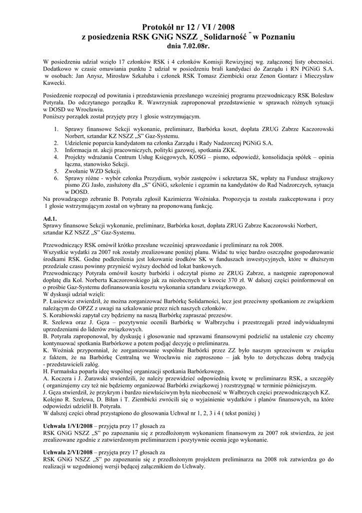 Protokół nr 12 / VI / 2008 z posiedzenia RSK GNiG NSZZ „ Solidarność ” w Poznaniu dnia 7.02.08r. W posiedzeniu udział wzięło 17 członków RSK i 4 członków Komisji Rewizyjnej wg. załączonej listy obecności. Dodatkowo w czasie omawiania punktu 2 udział w posiedzeniu brali kandydaci do Zarządu i RN PGNiG S.A. w osobach: Jan Anysz, Mirosław Szkałuba i członek RSK Tomasz Ziembicki oraz Zenon Gontarz i Mieczysław Kawecki. Posiedzenie rozpoczął od powitania i przedstawienia przesłanego wcześniej programu przewodniczący RSK Bolesław Potyrała. Do odczytanego porządku R. Wawrzyniak zaproponował przedstawienie w sprawach róŜnych sytuacji w DOSD we Wrocławiu. PoniŜszy porządek został przyjęty przy 1 głosie wstrzymującym. 1. Sprawy finansowe Sekcji wykonanie, preliminarz, Barbórka koszt, dopłata ZRUG Zabrze Kaczorowski Norbert, sztandar KZ NSZZ „S” Gaz-Systemu. 2. Udzielenie poparcia kandydatom na członka Zarządu i Rady Nadzorczej PGNiG S.A. 3. Informacja nt. akcji pracowniczych, polityki gazowej, spotkania ZKK. 4. Projekty wdraŜania Centrum Usług Księgowych, KOSG – pismo, odpowiedź, konsolidacja spółek – opinia łączna, stanowisko Sekcji. 5. Zwołanie WZD Sekcji. 6. Sprawy róŜne - wybór członka Prezydium, wybór zastępców i sekretarza SK, wpłaty na Fundusz strajkowy pismo ZG Jasło, zasłuŜony dla „S” GNiG, szkolenie i egzamin na kandydatów do Rad Nadzorczych, sytuacja w DOSD. Na prowadzącego zebranie B. Potyrała zgłosił Kazimierza Woźniaka. Propozycja ta została zaakceptowana i przy 1 głosie wstrzymującym został on wybrany na proponowaną funkcję. Ad.1. Sprawy finansowe Sekcji wykonanie, preliminarz, Barbórka koszt, dopłata ZRUG Zabrze Kaczorowski Norbert, sztandar KZ NSZZ „S” Gaz-Systemu. Przewodniczący RSK omówił krótko przesłane wcześniej sprawozdanie i preliminarz na rok 2008. Wszystkie wydatki za 2007 rok zostały zrealizowane poniŜej planu. Widać tu więc bardzo oszczędne gospodarowanie środkami RSK. Godne podkreślenia jest lokowanie środków SK w funduszach inwestycyjnych, które w dłuŜszym przedziale czasu powinny przynieść wyŜszy dochód od lokat bankowych. Przewodniczący Potyrała omówił koszty barbórki i odczytał pismo ze ZRUG Zabrze, a następnie zaproponował dopłatę dla Kol. Norberta Kaczorowskiego jak za nieobecnych w kwocie 370 zł. W dalszej części poinformował on o prośbie Gaz-Systemu dofinansowania kosztu wykonania sztandaru związkowego. W dyskusji udział wzięli: P. Łusiewicz stwierdził, Ŝe moŜna zorganizować Barbórkę Solidarności, lecz jest przeciwny spotkaniom ze związkiem naleŜącym do OPZZ z uwagi na szkalowanie przez nich naszych członków. S. Korabiowski zapytał czy będziemy na naszą Barbórkę zapraszać prezesów. R. Szelewa oraz J. Gęza – pozytywnie ocenili Barbórkę w Wałbrzychu i przestrzegali przed indywidualnymi uprzedzeniami do liderów związkowych. B. Potyrała zaproponował, by dyskusję i głosowanie nad sprawami finansowymi podzielić na ustalenie czy chcemy kontynuować spotkania Barbórkowe a potem podjąć decyzję o preliminarzu. K. Woźniak przypomniał, Ŝe zorganizowanie wspólnie Barbórki przez ZZ było naszym sprzeciwem w związku z faktem, Ŝe na Barbórkę Centralną we Wrocławiu nie zaproszono – jak było to dotychczas dobrą tradycją - przedstawicieli załóg. H. Furmańska poparła ideę wspólnej organizacji spotkania Barbórkowego. A. Koczera i J. śurawski stwierdzili, Ŝe naleŜy przewidzieć odpowiednią kwotę w preliminarzu RSK, a szczegóły ( organizujemy czy teŜ nie będziemy organizować Barbórki związkowej ) rozstrzygnąć w terminie późniejszym. J. Gęza stwierdził, Ŝe przykrym i bardzo niewłaściwym była nieobecność w Wałbrzych części przewodniczących KZ. Kolejno R. Szelewa, D. Biłan i T. Ziembicki zwrócili się o wyjaśnienie wydatków i planów finansowych, na które odpowiedzi udzielił B. Potyrała. W dalszej części obrad przystąpiono do głosowania Uchwał nr 1, 2, 3 i 4 ( tekst poniŜej ) Uchwała 1/VI/2008 – przyjęta przy 17 głosach za RSK GNiG NSZZ „S” po zapoznaniu się z przedłoŜonym wykonaniem finansowym za 2007 rok stwierdza, Ŝe jest zrealizowane zgodnie z zatwierdzonym preliminarzem i pozytywnie ocenia jego wykonanie. Uchwała 2/VI/2008 – przyjęta przy 17 głosach za RSK GNiG NSZZ „S” po zapoznaniu się z przedłoŜonym projektem preliminarza na 2008 rok zatwierdza go do realizacji w uzgodnionej wersji będącej załącznikiem do Uchwały. Uchwała 3/VI/2008 – przyjęta przy 17 głosach za RSK GNiG NSZZ „S” po zapoznaniu się z przesłanym pismem z KZ ZRUG Zabrze postanawia dofinansować udział przewodniczącego ww. KZ w Barbórce w Wałbrzychu w kwocie 370 złotych. Więcej emocji wzbudziło określenie skali dofinansowania sztandaru. Przewodniczący P.Łusiewicz poinformował, Ŝe wykonanie sztandaru kosztowało 6000 PLN, ich Komisja jest młodą organizacją i kaŜda pomoc będzie mile przyjęta. W dyskusji udział wzięli : K.Woźniak, A.Koczera, R.Wawrzyniak, D.Biłan, S.Korabiowski, R.Szelewa, A.Kokot a propozycje dofinansowania były zróŜnicowane : od 500 PLN do 25% kosztu wykonania, zgłaszano teŜ potrzebę przyjęcia ogólnej zasady dla ewentualnego dofinansowania innych sztandarów w przyszłości. Podczas ostrej dyskusji T.Ziembicki zgłosił wniosek o zmianę przewodniczącego, lecz nie uzyskał on poparcia ( 1 głos za, 16 przeciw ). Następnie przegłosowano czy przyjąć indywidualną – 8 za, czy uniwersalną zasadę dofinansowania – 7 za. Następnie kolejno sondaŜowo głosowano nad kwotą dofinansowania: 2000 zł – 9 za, 1500 zł – 2 za, 1000 zł -5 za. W związku z wynikiem głosowań sondaŜowych przystąpiono do przyjęcia Uchwały ( nr 4 ) Uchwała 4/VI/2008 – przyjęta przy 10 głosach za, 3 przeciwnych oraz 3 wstrzymujących się. RSK GNiG NSZZ „S” po dyskusji i przeprowadzonych głosowaniach son