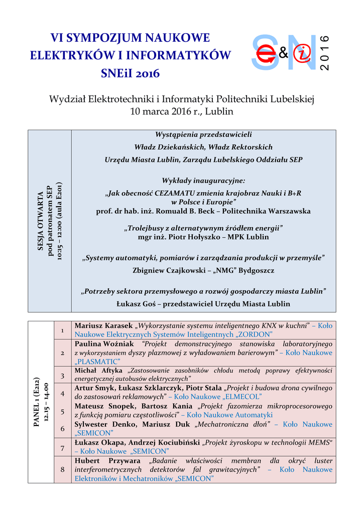 SN & 2016 VI SYMPOZJUM NAUKOWE ELEKTRYKÓW I INFORMATYKÓW SNEiI 2016 Wydział Elektrotechniki i Informatyki Politechniki Lubelskiej 10 marca 2016 r., Lublin Wystąpienia przedstawicieli Władz Dziekańskich, Władz Rektorskich SESJA OTWARTA pod patronatem SEP 10:15 – 12:00 (aula E201) Urzędu Miasta Lublin, Zarządu Lubelskiego Oddziału SEP Wykłady inauguracyjne: „Jak obecność CEZAMATU zmienia krajobraz Nauki i B+R w Polsce i Europie” prof. dr hab. inż. Romuald B. Beck – Politechnika Warszawska „Trolejbusy z alternatywnym źródłem energii” mgr inż. Piotr Hołyszko – MPK Lublin „Systemy automatyki, pomiarów i zarządzania produkcji w przemyśle” Zbigniew Czajkowski – „NMG” Bydgoszcz „Potrzeby sektora przemysłowego a rozwój gospodarczy miasta Lublin” Łukasz Goś – przedstawiciel Urzędu Miasta Lublin 1 PANEL 1 (E212) 12.15 – 14.00 2 3 4 5 6 7 8 Mariusz Karasek „Wykorzystanie systemu inteligentnego KNX w kuchni” – Koło Naukowe Elektrycznych Systemów Inteligentnych „ZORDON" Paulina Woźniak “Projekt demonstracyjnego stanowiska laboratoryjnego z wykorzystaniem dyszy plazmowej z wyładowaniem barierowym” – Koło Naukowe „PLASMATIC” Michał Aftyka „Zastosowanie zasobników chłodu metodą poprawy efektywności energetycznej autobusów elektrycznych” Artur Smyk, Łukasz Szklarczyk, Piotr Stala „Projekt i budowa drona cywilnego do zastosowań reklamowych” – Koło Naukowe „ELMECOL” Mateusz Snopek, Bartosz Kania „Projekt fazomierza mikroprocesorowego z funkcją pomiaru częstotliwości” – Koło Naukowe Automatyki Sylwester Denko, Mariusz Duk „Mechatroniczna dłoń” – Koło Naukowe „SEMICON” Łukasz Okapa, Andrzej Kociubiński „Projekt żyroskopu w technologii MEMS” – Koło Naukowe „SEMICON” Hubert Przywara „Badanie właściwości membran dla okryć luster interferometrycznych detektorów fal grawitacyjnych” – Koło Naukowe Elektroników i Mechatroników „SEMICON” 9 1 PANEL 2 (E212) 14.15 – 15.00 2 3 4 5 PANEL 2 (E214) 14.15 – 15.00 1 2 3 4 5 PANEL 3 (E212) 15.15 – 16.00 1 2 3 4 5 PANEL 3 (E214) 15.15 – 16.00 1 2 3 4 Mateusz Snopek, Oleksandr Boiko „Stanowisko do pomiaru właściwości elektrycznych nanokompozytów typu metal-dielektryk” – Koło Naukowe Materiałoznawstwa Elektrycznego i Techniki Wysokich Napięć „MELJON” Michał Wiśniewski, Maksymilian Zdunek „Koncepcja transformatora spełniającego wymogi zasilania reaktorów plazmowych” – Koło Naukowe Materiałoznawstwa Elektrycznego i Techniki Wysokich Napięć „MELJON” Jakub Drozd, Mariusz Duk „Zaawansowane metody sterowania silnikiem BLDC” – Koło Naukowe Elektroników i Mechatroników „SEMICON” Tomasz Lizak, Mateusz Gęca, Andrzej Kociubiński, Mariusz Duk, Michał Borecki „Technologia mikrogrzejnika z NiCr do lokalnego ogrzewania próbki cieczy o nanolitrowej objętości” – Koło Naukowe Elektroników i Mechatroników „SEMICON” Dawid Zarzeczny, Maciej Szypulski „Badanie wytrzymałości mechanicznych połączeń drutowych do warstwy z miedzi i aluminium wykonanych metodą ultratermokompresji” – Koło Naukowe Elektroników i Mechatroników „SEMICON” Konrad Jezior „Pomiary i analiza charakterystyk prądowo-napięciowych złączy p-n z węglika krzemu wykonanych metodą implantacyjną” – Koło Naukowe Elektroników i Mechatroników „SEMICON” Bartłomiej Matacz „Łazik marsjański "Orion” – Koło Naukowe „MICROCHIP” Szymon Oleszek „Sterowanie serwomechanizmami na przykładzie prostego manipulatora” – Koło Naukowe „MICROCHIP” Paweł Jeruzalski „Wykrywanie parametrów sygnału EKG w środowisku MATLAB” – Koło Naukowe „MICROCHIP” Tomasz Wawryszuk „Konstrukcja mechaniczna robota mobilnego „Orion”” – Koło Naukowe „MICROCHIP” Krzysztof Kruk „Projekt aplikacji mobilnej realizującej badanie audiometrii tonalnej” – Koło Naukowe „MICROCHIP” Arkadiusz Gita „Zastosowanie wolnego oprogramowania przy wspomaganiu prac inżynierskich” – Koło Naukowe Podstaw Inżynierii Produkcji Mateusz Tłuczek „Projekt automatycznej zgniatarki do puszek aluminiowych” Kamil Bukała „Stacja pogodowa- stanowisko dydaktyczne dla potrzeb instalacji OZE” – Koło Naukowe „ELMECOL” Dawid Krzyżanek „Inteligentne oświetlenie samochodu” – Koło Naukowe „MICROCHIP” Wojciech Olech „Raspberry Pi – podstawy, obsługa, sterowanie, zastosowania” – Koło Naukowe „MICROCHIP” Arkadiusz Gwizadł „Układ automatycznej regulacji temperatury powietrza oraz wilgotności powietrza i gleby” - Koło Naukowe „XENON” Stoczkowski Tomasz, Szajewski Piotr, Sposób Mateusz, Skiba Marcin „Podajnik taśmowy z automatyczną segregacja materiałów” – Koło Naukowe „NAPĘD I AUTOMATYKA” Żaklin Grądz „Analiza metod diagnostyki technicznej na przykładzie procesu spalania” Budzyński Daniel „Nowoczesne układy detekcji zagrożeń w systemach alarmowych” - Koło Naukowe Technik Zabezpieczenia Mienia „SABOTAŻ" 5 PANEL 4 (E212) 16.15 – 17.15 1 2 3 4 5 6 7 1 PANEL 4 (E214) 16.15 – 17.30 2 3 4 5 6 7 Buczak Paweł „Układ Arduino jako element decyzyjny w programowalnych, domowych systemach alarmowych” – Koło Naukowe Technik Zabezpieczenia Mienia „SABOTAŻ" Agata Huszaluk, Tomasz Klepka „Charakterystyka elementów z tworzyw stosowanych w kardiologii interwencyjnej” Wioleta Pluta „Charakterystyka barwnych układów hydrożelowych na bazie PVA” Michał Głos „Oddziaływanie endoprotezy na staw biodrowy” Piotr Bielecki „Numeryczna analiza obciążeń kręgosłupa przy leczeniu kręgozmyku za pomocą śrub transpedikularnych” Róża Dzierżak „Redukcja szumu w sygnałach EKG” Katarzyna Ciemny, Jarosław Zubrzycki „Opracowanie metody komputerowego wspomagania doboru protezy stawu biodrowego człowieka” Adam Piasecki „Projekt strzykawkowej pompy infuzyjnej sterowanej mikropr