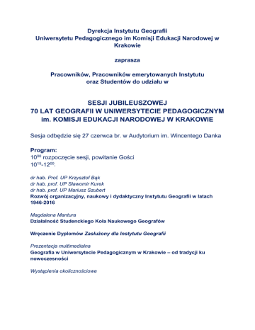 Dyrekcja Instytutu Geografii Uniwersytetu Pedagogicznego im Komisji Edukacji Narodowej w Krakowie zaprasza Pracowników, Pracowników emerytowanych Instytutu oraz Studentów do udziału w SESJI JUBILEUSZOWEJ 70 LAT GEOGRAFII W UNIWERSYTECIE PEDAGOGICZNYM im. KOMISJI EDUKACJI NARODOWEJ W KRAKOWIE Sesja odbędzie się 27 czerwca br. w Audytorium im. Wincentego Danka Program: 1000 rozpoczęcie sesji, powitanie Gości 1015-1200: dr hab. Prof. UP Krzysztof Bąk dr hab. prof. UP Sławomir Kurek dr hab. prof. UP Mariusz Szubert Rozwój organizacyjny, naukowy i dydaktyczny Instytutu Geografii w latach 1946-2016 Magdalena Mantura Działalność Studenckiego Koła Naukowego Geografów Wręczenie Dyplomów Zasłużony dla Instytutu Geografii Prezentacja multimedialna Geografia w Uniwersytecie Pedagogicznym w Krakowie – od tradycji ku nowoczesności Wystąpienia okolicznościowe