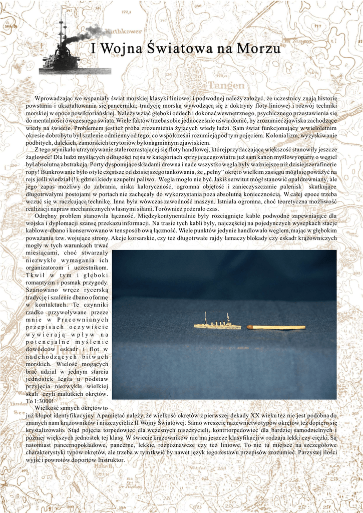 I Wojna Œwiatowa na Morzu Wprowadzaj¹c we wspania³y œwiat morskiej klasyki liniowej i podwodnej nale¿y za³o¿yæ, ¿e uczestnicy znaj¹ historiê powstania i ukszta³towania siê pancernika; tradycjê morsk¹ wywodz¹c¹ siê z doktryny floty liniowej i rozwój techniki morskiej w epoce powiktoriañskiej. Nale¿y wzi¹æ g³êboki oddech i dokonaæ wewnêtrznego, psychicznego przestawienia siê do mentalnoœci ówczesnego œwiata. Wiele faktów trzeba sobie jednoczeœnie uœwiadomiæ, by zrozumieæ zjawiska zachodz¹ce wtedy na œwiecie. Problemem jest te¿ próba zrozumienia ¿yj¹cych wtedy ludzi. Sam œwiat funkcjonuj¹cy w wieloletnim okresie dobrobytu by³ szalenie odmienny od tego, co wspó³czeœni rozumiej¹ pod tym pojêciem. Kolonializm, wyzyskiwanie podbitych, dalekich, zamorskich terytoriów by³o nagminnym zjawiskiem. Z tego wynika³o utrzymywanie stale rozrastaj¹cej siê floty handlowej, której przyt³aczaj¹c¹ wiêkszoœæ stanowi³y jeszcze ¿aglowce! Dla ludzi myœl¹cych o d³ugoœci rejsu w kategoriach sprzyjaj¹cego wiatru ju¿ sam kanon myœlowy oparty o wêgiel by³ absolutn¹ abstrakcj¹. Porty dysponuj¹ce sk³adami drewna i nade wszystko wêgla by³y wa¿niejsze ni¿ dzisiejsze rafinerie ropy! Bunkrowanie by³o o tyle czêstsze od dzisiejszego tankowania, ¿e „pe³ny” okrêt o wielkim zasiêgu móg³ siê powa¿yæ na rejs jeœli wiedzia³ (!), gdzie i kiedy uzupe³ni paliwo. Wêgla mog³o nie byæ. Jakiœ serwitut móg³ stanowiæ opa³ drewniany, ale jego zapas mo¿liwy do zabrania, niska kalorycznoœæ, ogromna objêtoœæ i zanieczyszczanie palenisk skutkuj¹ce d³ugotrwa³ymi postojami w portach nie zachêca³y do wykorzystania poza absolutn¹ koniecznoœci¹. W ca³ej epoce trzeba wczuæ siê w raczkuj¹c¹ technikê. Inna by³a wówczas zawodnoœæ maszyn. Istnia³a ogromna, choæ teoretyczna mo¿liwoœæ realizacji napraw mechanicznych w³asnymi si³ami. To równie¿ po¿era³o czas. Odrêbny problem stanowi³a ³¹cznoœæ. Miêdzykontynentalnie by³y rozci¹gniête kable podwodne zapewniaj¹ce dla wojska i dyplomacji szansê przekazu informacji. Na trasie tych kabli by³y, najczêœciej na pojedynczych wysepkach stacje kablowe-dbano i konserwowano w ten sposób ow¹ ³¹cznoœæ. Wiele punktów jedynie handlowa³o wêglem, maj¹c w g³êbokim powa¿aniu tzw. wojuj¹ce strony. Akcje korsarskie, czy te¿ d³ugotrwa³e rajdy ³amaczy blokady czy eskadr kr¹¿owniczych mog³y w tych warunkach trwaæ miesi¹cami, choæ stwarza³y niezwyk³e wymagania ich organizatorom i uczestnikom. Tkwi³ w tym i g³êboki romantyzm i posmak przygody. Szanowano wrêcz rycersk¹ tradycjê i szalenie dbano o formê w kontaktach. Te czynniki rzadko przywo³ywane przeze mnie w Pracownianych przepisach oczywiœcie wywieraj¹ wp³yw na potencjalne myœlenie dowódców eskadr i flot w nadchodz¹cych bitwach morskich. Wieloœæ mog¹cych braæ udzia³ w jednym starciu jednostek leg³a u podstaw przyjêcia niezwykle wielkiej skali czyli malutkich okrêtów. To 1:3000! Wielkoœæ samych okrêtów to ju¿ k³opot identyfikacyjny. A pamiêtaæ nale¿y, ¿e wielkoœæ okrêtów z pierwszej dekady XX wieku te¿ nie jest podobna do znanych nam kr¹¿owników i niszczycieli z II Wojny Œwiatowej. Samo wreszcie nazewnictwo typów okrêtów te¿ dopiero siê krystalizowa³o. St¹d pojêcia torpedowiec dla wczesnych niszczycieli, kontrtorpedowiec dla bardziej samodzielnych i póŸniej wiêkszych jednostek tej klasy. W œwiecie kr¹¿owników nie ma jeszcze klasyfikacji w rodzaju lekki czy ciê¿ki. S¹ natomiast pancernopok³adowe, pancerne, lekkie, rozpoznawcze czy te¿ liniowe. To nie tu miejsce na szczegó³owe charakterystyki typów okrêtów, ale trzeba w tym tkwiæ by nawet jêzyk tego zestawu przepisów zrozumieæ. Parzystej iloœci wyjœæ i powrotów do portów Instruktor.