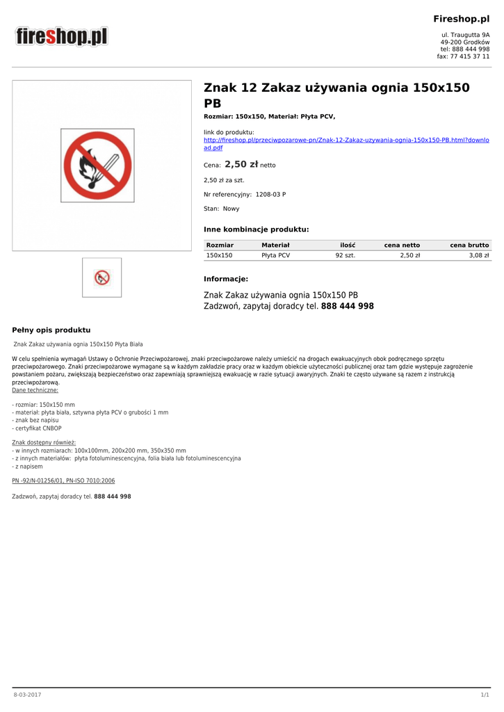 Fireshop.pl ul. Traugutta 9A 49-200 Grodków tel: 888 444 998 fax: 77 415 37 11 Znak 12 Zakaz używania ognia 150x150 PB Rozmiar: 150x150, Materiał: Płyta PCV, link do produktu: http://fireshop.pl/przeciwpozarowe-pn/Znak-12-Zakaz-uzywania-ognia-150x150-PB.html?downlo ad.pdf Cena: 2,50 zł netto 2,50 zł za szt. Nr referencyjny: 1208-03 P Stan: Nowy Inne kombinacje produktu: Rozmiar Materiał ilość cena netto cena brutto 150x150 Płyta PCV 92 szt. 2,50 zł 3,08 zł Informacje: Znak Zakaz używania ognia 150x150 PB Zadzwoń, zapytaj doradcy tel. 888 444 998 Pełny opis produktu Znak Zakaz używania ognia 150x150 Płyta Biała W celu spełnienia wymagań Ustawy o Ochronie Przeciwpożarowej, znaki przeciwpożarowe należy umieścić na drogach ewakuacyjnych obok podręcznego sprzętu przeciwpożarowego. Znaki przeciwpożarowe wymagane są w każdym zakładzie pracy oraz w każdym obiekcie użyteczności publicznej oraz tam gdzie występuje zagrożenie powstaniem pożaru, zwiększają bezpieczeństwo oraz zapewniają sprawniejszą ewakuację w razie sytuacji awaryjnych. Znaki te często używane są razem z instrukcją przeciwpożarową. Dane techniczne: - rozmiar: 150x150 mm - materiał: płyta biała, sztywna płyta PCV o grubości 1 mm - znak bez napisu - certyfikat CNBOP Znak dostępny również: - w innych rozmiarach: 100x100mm, 200x200 mm, 350x350 mm - z innych materiałów: płyta fotoluminescencyjna, folia biała lub fotoluminescencyjna - z napisem PN -92/N-01256/01, PN-ISO 7010:2006 Zadzwoń, zapytaj doradcy tel. 888 444 998 8-03-2017 1/1