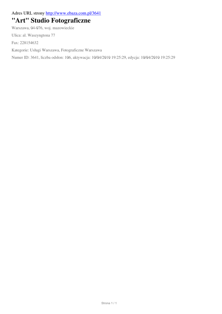 Adres URL strony http://www.ebaza.com.pl/3641 "Art" Studio Fotograficzne Warszawa, 04-076, woj. mazowieckie Ulica: al. Waszyngtona 77 Fax: 228154632 Kategorie: Usługi Warszawa, Fotograficzne Warszawa Numer ID: 3641, liczba odsłon: 106, aktywacja: 10/04/2010 19:25:29, edycja: 10/04/2010 19:25:29 Strona 1 / 1