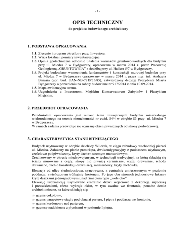 -1- OPIS TECHNICZNY do projektu budowlanego architektury 1. PODSTAWA OPRACOWANIA 1.1. Zlecenie i program określony przez Inwestora. 1.2. Wizja lokalna i pomiary inwentaryzacyjne. 1.3. Opinia geotechniczna odnośnie ustalenia warunków gruntowo-wodnych dla budynku przy ul. Miedza 7 w Bydgoszczy, opracowana w marcu 2014 r. przez Pracownię Geologiczną „GRUNTOWNIA” z siedzibą przy ul. Hallera 5/7 w Bydgoszczy. 1.4. Projekt budowlany wzmocnienia fundamentów i konstrukcji murowej budynku przy ul. Miedza 7 w Bydgoszczy opracowany w marcu 2014 r. przez mgr. inż. Andrzeja Banasia (upr. bud. UAN-NB-7210/35/85), zatwierdzony decyzją Prezydenta Miasta Bydgoszczy o pozwoleniu na roboty budowlane nr 917/2014 z dnia 10.09.2014. 1.5. Mapa ewidencyjna terenu. 1.6. Uzgodnienia z Inwestorem, Miejskim Konserwatorem Zabytków i Plastykiem Miejskim. 2. PRZEDMIOT OPRACOWANIA Przedmiotem opracowania jest remont ścian zewnętrznych budynku mieszkalnego wielorodzinnego na terenie nieruchomości nr ewid. 84/4 w obrębie 83 przy ul. Miedza 7 w Bydgoszczy. W ramach zadania przewiduje się wymianę okien piwnicznych od strony podwórzowej. 3. CHARAKTERYSTYKA STANU ISTNIEJĄCEGO Budynek usytuowany w obrębie dzielnicy Wilczak, w ciągu zabudowy wschodniej pierzei ul. Miedza. Założony na planie prostokąta, dwukondygnacyjny z poddaszem użytkowym, częściowo podpiwniczony, kryty dachem stromym mansardowym. Zrealizowany w okresie międzywojennym, w technologii tradycyjnej, na którą składają się ściany murowane z cegły, stropy nad piwnicą ceramiczne, wyżej drewniane, schody drewniane, dach o konstrukcji drewnianej, mansardowy, kryty dachówką. Elewacja od ulicy siedmioosiowa, symetryczna, z centralnie umieszczonym w poziomie poddasza, zwieńczonym trójkątnie frontonem. Po jego obu stronach jednoosiowe lukarny kryte daszkami jednospadowymi, nad nimi okna typu „wole oko”. Elewację urozmaicają usytuowane centralnie drzwi wejściowe z dekoracją snycerską i przeszkleniami, różne wykroje okien, w tym owalne we frontonie, ponadto detale architektoniczne, na które składają się: • • • • gzyms cokołowy, gzyms parapetowy ciągły pod oknami parteru, I piętra i poddasza we frontonie, gzyms kordonowy nad parterem, gzymsy nadokienne z płycinami w poziomie I piętra, -2- • • • • • skrzynkowe gzymsy okapowe po bokach frontonu, gzyms wieńczący po obwodzie frontonu, płyciny prostokątne między oknami poddasza, opaski okienne, w tym w poziomie parteru spięte zwornikiem, półopaska o motywie roślinnym przy oknie okrągłym frontonu. Elewacja zapleczowa o zbliżonym charakterze do przyulicznej jest skromniejsza, wzbogacona detalem architektonicznym w postaci gzymsów parapetowych oraz opasek okiennych i drzwiowych ze zwornikiem. Ma układ siedmioosiowy, symetryczny, z zadaszonym wejściem do klatki schodowej w osi centralnej. W poziomie dachu (po obu stronach klatki) po dwie jednoosiowe lukarny. Budynek był poddawany interwencyjnym robotom remontowym, w ramach których m.in. naprawiono pasma dachu, wymieniono część stolarki okiennej. Niezależnie od wykonanych robót ogólny stan elewacji jest niezadowalający. Wykazują znaczny stopień zniszczenia. Stwierdzono uszkodzenia nadproży, spękania i zarysowania, których charakter wskazuje m.in. na osiadanie budynku i niewystarczającą nośność fundamentów, ponadto znaczne ubytki tynków, złą jakość oryginalnych opierzeń. Pace naprawcze układu nośnego budynku, związane ze wzmocnieniem fundamentów i konstrukcji murowej, były przedmiotem projektu budowlanego z marca 2014 r. opracowanego przez mgr. inż. Andrzeja Banasia, zatwierdzonego decyzją Prezydenta Miasta Bydgoszczy o pozwoleniu na roboty budowlane nr 917/2014 z dnia 10.09.2014. Dla zapewnienia dalszej bezpiecznej eksploatacji obiektu konieczne jest wdrożenie prac ujętych w ww. projekcie. Ich przeprowadzenie jest jednocześnie warunkiem wykonania robót remontowych elewacji objętych niniejszym opracowaniem. 4. STAN PRAWNY Budynek stanowi własność Wspólnoty Mieszkaniowej MIEDZA 7 w Bydgoszczy. 5. ZAKRES OGÓLNY PRAC • remont tympanonu elewacji frontowej, • remont konserwatorski ścian cokołowych i nadziemia, w tym odtworzenie detali architektonicznych, • wymiana okien piwnicznych od strony podwórzowej, • remont drzwi wejściowych i progów, • wszelkie prace uzupełniające wynikające z zadania, jak przebudowa rozprowadzeń instalacyjnych, wymiana blacharki, konserwacja elementów drewnianych, uzbrojenie rur deszczowych w rewizje, wykonanie opasek przyściennych, wymiana akcesoriów elewacyjnych, itp. 6. WARUNKI OCHRONY PRZECIWPOŻAROWEJ Program robót objętych projektem sprowadzający się do remontu elewacji nie zmienia istniejących uwarunkowań w zakresie wymogów przeciwpożarowych. -3- 7. INFORMACJA DOT. BEZPIECZEŃSTWA I OCHRONY ZDROWIA (BIOZ) Zgodnie z art. 21a ust. 1a Prawa Budowlanego inwestycja zalicza się do przedsięwzięć wymagających sporządzenia planu BIOZ, z uwagi na: • przewidywany czas trwania robót powyżej 30 dni i liczbę pracowników, • charakter robót, organizację i miejsce prowadzenia stwarzające ryzyko powstania zagrożenia bezpieczeństwa i zdrowia ludzi w szczególności: – – – – przygniecenia lub uderzenia przedmiotem spadającym, upadku z wysokości, uszkodzenia ciała (złamania, skaleczenia, zachlapania oczu, itp.), porażenia prądem. Potencjalnymi źródłami zagrożeń związanymi z inwestycją są: • • • • • • • • • • • • transport i rozładunek materiałów, roboty z użyciem maszyn budowlanych, roboty w czynnym obiekcie, roboty w pasie dróg komunikacji publicznej, roboty na granicach z nieruchomościami sąsiadów, roboty na wysokości (na dachach, rusztowaniach i drabinach), roboty rozbiórkowe (demontaż blacharki, skuwanie tynku , demontaż stolarki), roboty naprawcze murów, montaż stolarki okiennej, roboty tynkarskie i malarskie, roboty związane z