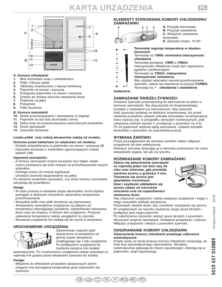 KARTA URZĄDZENIA PL ELEMENTY STEROWANIA KOMORY CHŁODZIARKI/ ZAMRAŻARKI A. Pokrętło termostatu B. Przycisk oświetlenia C. Wskaźnik ustawienia termostatu D. Żarówka (maks. 15 W) Termostat reguluje temperaturę w obydwu komorach. Termostat na 1/MIN: minimalna intensywność chłodzenia Termostat pomiędzy 1/MIN a 7/MAX: intensywność chłodzenia może być regulowana zgodnie z preferencjami. Termostat na 7/MAX: maksymalna intensywność chłodzenia. Aby uzyskać optymalne warunki przechowywania żywności, zaleca się ustawienie na pozycji 3-5/MED. Termostat na • : chłodzenie i oświetlenie A. Komora chłodziarki 1. Blok termostatu wraz z oświetleniem 2. Półki / Obszar półek 3. Tabliczka znamionowa z nazwą handlową 4. Pojemnik na owoce i warzywa 5. Przegroda pojemnika na owoce i warzywa 6. Zestaw do zmiany kierunku otwierania drzwi 7. Pojemnik na jajka 8. Przegroda 9. Półki drzwiowe wyłączone. Liczba półek oraz rodzaj akcesoriów zależą od modelu. WYMIANA ŻARÓWKI Ochrona przed bakteriami (w zależności od modelu): - Dodatki antybakteryjne w pojemniku na owoce i warzywa (4) - Uszczelki drzwiowe z materiałów ograniczających rozwój bakterii (14). Przed przystąpieniem do wymiany żarówki należy odłączyć urządzenie od sieci elektrycznej. Wykręcić żarówkę obracając ją w kierunku przeciwnym do ruchu wskazówek zegara, tak jak na rysunku. Używanie zamrażarki: - Z komory zamrażarki można korzystać bez klapki, dzięki czemu powiększa się ilość miejsca na przechowywanie dużych artykułów. - Dolnego kosza nie można wyjmować. - Umieścić żywność bezpośrednio na półce. Po włożeniu produktów sprawdzić, czy drzwi komory zamrażarki zamykają się prawidłowo. ROZMRAŻANIE KOMORY ZAMRAŻARKI URUCHOMIENIE URZĄDZENIA Zamontować rozpórki (jeśli dostarczono w komplecie) na górnej części skraplacza znajdującego się z tyłu urządzenia. Po podłączeniu urządzenia do zasilania zaczyna ono działać automatycznie. Po uruchomieniu urządzenia należy odczekać co najmniej 4-6 godzin przed włożeniem żywności do środka. ODSZRANIANIE KOMORY CHŁODZIARKI Odszranianie komory chłodziarki przebiega całkowicie automatycznie. Krople wody na tylnej ściance komory chłodziarki oznaczają, że trwa faza automatycznego odszraniania. Skropliny automatycznie spływają do otworu spustowego i zbierają się w pojemniku, skąd wyparowują. Uwaga: - Włożenie do chłodziarki produktów spożywczych zanim osiągnie ona wymaganą temperaturę grozi zepsuciem się żywności. GB PL CZ SK H RUS BG RO 5019 637 010889 Uwagi: - W razie przerwy w dostawie prądu akumulator zimna będzie pomagać w dłuższym utrzymaniu optymalnej temperatury przechowywania. - Wszystkie półki oraz półki drzwiowe są wyjmowane. - Temperatury wewnętrzne urządzenia są zależne od temperatury otaczającego powietrza, częstotliwości otwierania drzwi oraz od miejsca, w którym stoi urządzenie. Podczas ustawiania temperatury należy uwzględnić te czynniki. - Akcesoria urządzenia nie nadają się do mycia w zmywarce. Zaleca się odszranianie zamrażarki co najmniej jeden lub dwa razy do roku oraz wówczas, gdy powstała warstwa szronu o grubości 3 mm. Tworzenie się szronu jest zjawiskiem normalnym. Ilość i szybkość odkładania się szronu zależy od warunków otoczenia oraz od częstotliwości otwierania drzwi. Aby odszronić urządzenie, należy wyłączyć urządzenie i wyjąć z niego wszystkie artykuły spożywcze. Pozostawić otwarte drzwi, aby umożliwić roztopienie się szronu. W urządzeniach na rysunku wystarczy wyjąć spust skroplin i podłączyć pod niego pojemnik. Po zakończeniu czynności włożyć spust skroplin z powrotem. Wyczyścić wnętrze zamrażarki. Dokładnie przepłukać i wytrzeć. Włączyć urządzenie i włożyć z powrotem żywność. Printed in Poland B. Komora zamrażarki 10. Strefa przechowywania i zamrażania (z klapką) 11. Pojemnik na lód i/lub akumulator zimna 12. Dolny kosz do przechowywania zamrożonych produktów 13. Drzwi zamrażarki 14. Uszczelki drzwiowe Umieścić żywność przeznaczoną do zamrożenia na półce w komorze zamrażarki. Nie dopuszczać do bezpośredniego kontaktu z artykułami już zamrożonymi. Aby zamrozić ilość żywności podanej na tabliczce znamionowej, tuż przed włożenie produktów ustawić pokrętło termostatu na temperaturę nieco wyższą (np. w przypadku oznaczeń numerycznych, jeśli ustawiona wartość wynosi 4, przełączyć z powrotem na 3,5). Po 24 godzinach artykuły będą zamrożone. Ustawić pokrętło termostatu z powrotem na poprzedniej pozycji. 07/10 ZAMRAŻANIE ŚWIEŻEJ ŻYWNOŚCI
