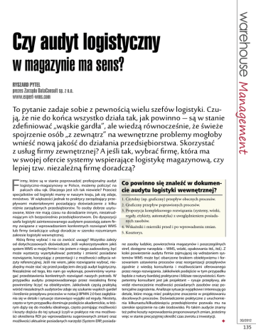 Czy audyt logistyczny w magazynie ma sens? To pytanie zadaje sobie z pewnością wielu szefów logistyki. Czują, że nie do końca wszystko działa tak, jak powinno – są w stanie zdefiniować „wąskie gardła”, ale wiedzą równocześnie, że świeże spojrzenie osób „z zewnątrz” na wewnętrzne problemy mogłoby wnieść nową jakość do działania przedsiębiorstwa. Skorzystać z usług firmy zewnętrznej? A jeśli tak, wybrać firmę, która ma w swojej ofercie systemy wspierające logistykę magazynową, czy lepiej tzw. niezależną firmę doradczą? F irmy, które są w stanie poprowadzić profesjonalny audyt logistyczno-magazynowy w Polsce, możemy policzyć na palcach obu rąk. Dlaczego jest ich tak niewiele? Przecież specjalistów od logistyki mamy w naszym kraju, jak się zdaje, mnóstwo. W większości jednak to praktycy zarządzający przepływami materiałowymi posiadający doświadczenie z kilku różnie zarządzanych przedsiębiorstw. To osoby dobrze usytuowane, które nie mają czasu na doradzanie innym, niezatrudniającym ich bezpośrednio przedsiębiorstwom. Do dyspozycji szefa logistyki zainteresowanego audytem pozostają zatem firmy związane z wprowadzaniem konkretnych rozwiązań WMS lub firmy świadczące usługi doradcze w szeroko rozumianym zakresie logistyki wewnętrznej. Którą firmę wybrać i na co zwrócić uwagę? Wszystko zależy od dotychczasowych doświadczeń. Jeśli wykorzystywałem jakiś system WMS w mojej firmie i nie jestem z niego zadowolony, być może wystarczy wyartykułować potrzeby i zmienić posiadane rozwiązanie, korzystając z prezentacji i z możliwości odbycia wizyty referencyjnej. Jeśli nie wiem, jakie rozwiązanie wybrać, niezbędny może stać się przed podjęciem decyzji audyt logistyczny. Niezależnie od tego, kto nam go wykonuje, powinniśmy wymagać przedstawienia konkretnych rozwiązań naszych potrzeb. W przypadku audytu przeprowadzanego przez niezależną firmę powinniśmy liczyć na obiektywizm. Jakkolwiek częstą praktyką wśród niezależnych audytorów zdaje się szukanie wąskich gardeł i kreślenie przepływu procesów w notacji BPMN 2.0 bez zagłębiania się w detale i sytuacje stanowiące wyjątki od reguły. Niestety, często w tym przypadku dominuje podejście akademickie, w którym dąży się do modelu idealnego, często pomijając możliwości i koszty dojścia do tej sytuacji (czyli w praktyce nie ma możliwości określenia ROI po wprowadzeniu sugerowanych zmian) oraz możliwości aktualnie posiadanych narzędzi (System ERP, posiada- Management Ryszard Pytel prezes Zarządu DataConsult sp. z o.o. www.expert-wms.com Co powinno się znaleźć w dokumencie audytu logistyki wewnętrznej? 1. Czytelny (np. graficzny) przepływ obecnych procesów. 2. Graficzny przepływ poprawionych procesów. 3. Propozycja kompleksowego rozwiązania (systemy, wózki, regały, etykiety, automatyka) z uwzględnieniem posiadanych zasobów. 4. Wskaźniki i mierniki przed i po wprowadzeniu zmian. 5. Kosztorys. ne zasoby ludzkie, powierzchnia magazynów i poszczególnych stref, dostępne narzędzia – WMS, wózki, opakowania itd., itd.). Z kolei powierzenie audytu firmie zajmującej się wdrażaniem systemów WMS może być obarczone brakiem obiektywizmu i forsowaniem ustawienia procesów oraz reorganizacji przepływów zgodnie z wiedzą konsultanta i możliwościami oferowanego przez niego rozwiązania. Jakkolwiek podejście w tym przypadku będzie z natury bardziej praktyczne i bliższe rzeczywistości. Kompetentny konsultant jest jak projektant – rysuje przepływy, ale widzi równocześnie możliwości posiadanych zasobów oraz potencjalne zagrożenia. Analizuje sytuacje wyjątkowe i interesują go detale, które mogą mieć praktyczne znaczenie w projektowaniu docelowych procesów. Doświadczenie praktyczne z uruchomienia kilkunastu/kilkudziesięciu przedsiębiorstw pozwala mu na szerokie spojrzenie na całe środowisko. Po takim audycie znamy też pełne koszty wprowadzenia proponowanych zmian, jesteśmy więc w stanie precyzyjniej określić czas zwrotu z inwestycji. + 3Q/2012 135