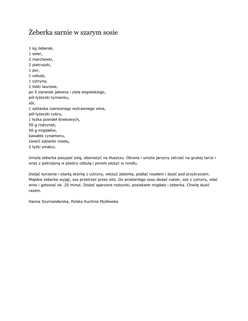 Żeberka sarnie w szarym sosie 1 kg żeberek, 1 seler, 2 marchewki, 2 pietruszki, 1 por, 1 cebula, 1 cytryna, 2 listki laurowe, po 5 ziarenek jałowca i ziela angielskiego, pół łyżeczki tymianku, sól, 1 szklanka czerwonego wytrawnego wina, pół łyżeczki cukru, 1 łyżka powideł śliwkowych, 50 g rodzynek, 50 g migdałów, kawałek cynamonu, ćwierć szklanki rosołu, 2 łyżki smalcu. Umyte żeberka posypać solą, obsmażyć na tłuszczu. Obrane i umyte jarzyny zetrzeć na grubej tarce i wraz z pokrojoną w plastry cebulą i porem ułożyć w rondlu. Dodać korzenie i otartą skórkę z cytryny, włożyć żeberka, podlać rosołem i dusić pod przykryciem. Miękkie żeberka wyjąć, sos przetrzeć przez sito. Do przetartego sosu dodać cukier, sok z cytryny, wlać wino i gotować ok. 20 minut. Dodać sparzone rodzynki, posiekane migdały i żeberka. Chwilę dusić razem. Hanna Szymanderska, Polska Kuchnia Myśliwska