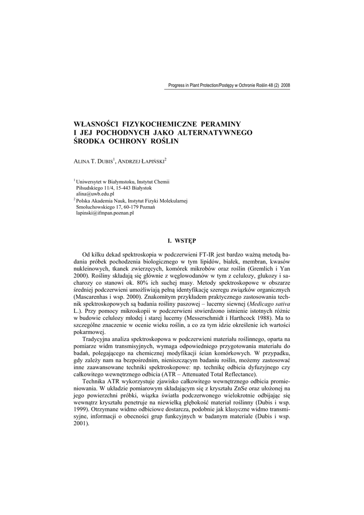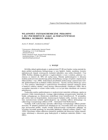Progress in Plant Protection/Postępy w Ochronie Roślin 48 (2) 2008 WŁASNOŚCI FIZYKOCHEMICZNE PERAMINY I JEJ POCHODNYCH JAKO ALTERNATYWNEGO ŚRODKA OCHRONY ROŚLIN ALINA T. DUBIS1, ANDRZEJ ŁAPIŃSKI2 1 Uniwersytet w Białymstoku, Instytut Chemii Piłsudskiego 11/4, 15-443 Białystok [email protected] 2 Polska Akademia Nauk, Instytut Fizyki Molekularnej Smoluchowskiego 17, 60-179 Poznań [email protected] I. WSTĘP Od kilku dekad spektroskopia w podczerwieni FT-IR jest bardzo ważną metodą badania próbek pochodzenia biologicznego w tym lipidów, białek, membran, kwasów nukleinowych, tkanek zwierzęcych, komórek mikrobów oraz roślin (Gremlich i Yan 2000). Rośliny składają się głównie z węglowodanów w tym z celulozy, glukozy i sacharozy co stanowi ok. 80% ich suchej masy. Metody spektroskopowe w obszarze średniej podczerwieni umożliwiają pełną identyfikację szeregu związków organicznych (Mascarenhas i wsp. 2000). Znakomitym przykładem praktycznego zastosowania technik spektroskopowych są badania rośliny paszowej – lucerny siewnej (Medicago sativa L.). Przy pomocy mikroskopii w podczerwieni stwierdzono istnienie istotnych różnic w budowie celulozy młodej i starej lucerny (Messerschmidt i Harthcock 1988). Ma to szczególne znaczenie w ocenie wieku roślin, a co za tym idzie określenie ich wartości pokarmowej. Tradycyjna analiza spektroskopowa w podczerwieni materiału roślinnego, oparta na pomiarze widm transmisyjnych, wymaga odpowiedniego przygotowania materiału do badań, polegającego na chemicznej modyfikacji ścian komórkowych. W przypadku, gdy zależy nam na bezpośrednim, nieniszczącym badaniu roślin, możemy zastosować inne zaawansowane techniki spektroskopowe: np. technikę odbicia dyfuzyjnego czy całkowitego wewnętrznego odbicia (ATR – Attenuated Total Reflectance). Technika ATR wykorzystuje zjawisko całkowitego wewnętrznego odbicia promieniowania. W układzie pomiarowym składającym się z kryształu ZnSe oraz ułożonej na jego powierzchni próbki, wiązka światła podczerwonego wielokrotnie odbijając się wewnątrz kryształu penetruje na niewielką głębokość materiał roślinny (Dubis i wsp. 1999). Otrzymane widmo odbiciowe dostarcza, podobnie jak klasyczne widmo transmisyjne, informacji o obecności grup funkcyjnych w badanym materiale (Dubis i wsp. 2001). 716 Progress in Plant Protection/Postępy w Ochronie Roślin 48 (2) 2008 Celem badań jest wykorzystanie techniki ATR do detekcji antyfidantu peraminy (Rowan i wsp. 1986) na podłożu biologicznym. Charakterystyczne pasma analityczne badanej substancji zostały zidentyfikowane przez autorów tej pracy z wykorzystaniem licznych eksperymentalnych technik pomiarowych oraz analizy teoretycznej opartej na metodach chemii kwantowej (Łapiński i Dubis 2008). II. MATERIAŁ I METODY Obiektem badań jest pirolopirazynowy alkaloid – peramina, wykazujący działanie antyfidantne w stosunku do owadów trawożernych oraz w stosunku do niektórych szkodników magazynowych. Ze względu na potencjalnie duże znaczenie peraminy jako nowoczesnego, ekologicznego środka ochrony roślin podjęto próbę bezpośredniej analizy spektroskopowej peraminy na podłożu roślinnym. W pracy zastosowano technikę całkowitego wewnętrznego odbicia w zakresie średniej podczerwieni (ATR FT-IR). Wykorzystano do tego celu spektrometry: FT-IR Bruker Equinox 55 (od 400 do 9 000 1/cm) oraz Nicolet Magna IR 550 Series II (od 400 do 4 000 1/cm). Interpretacja widm IR została oparta na teoretycznie obliczonych widmach w podczerwieni metodą DFT (B3LYP) przy zastosowaniu bazy obliczeniowej 6-311++ G(d,p) (Łapiński i Dubis 2008). III. WYNIKI I ICH OMÓWIENIE Charakterystycznymi elementami struktury antyfidantu peraminy przedstawionej na rysunku 1. jest nienasycony pierścieniowy układ pirolopirazynowy z ugrupowaniem karbonylowym oraz łańcuchem bocznym zakończonym polarną grupą guanidynową. Rys. 1. Struktura chemiczna peraminy Fig. 1. Chemical structure of peramine W pracy zastosowano metodykę analityczną polegają na porównaniu widma czystej peraminy z widmem peraminy na podłożu biologicznym. Takie podejście pozwala na ocenę obecności substancji aktywnej na roślinie, którą chcemy chronić przed szkodnikami. Rysunek 2. przedstawia widma odbiciowe peraminy, liścia trawy jako podłoża roślinnego oraz peraminy znajdującej się na liściu. W widmie peraminy najbardziej intensywne pasma oscylacyjne zaobserwowano przy liczbach falowych 1 667 1/cm oraz 1 607 1/cm (5 999 nm oraz 6 223 nm). Sygnały te leżą blisko siebie tworząc dublet związany z drganiami wiązania podwójnego C=C i grupy karbonylowej C=O. Powyższe pasma ze względu na znaczną intensywność Własności fizykochemiczne peraminy... 717 Intensywność – Intensity mogą być wykorzystane jako wskaźniki obecności peraminy na roślinie. Ponadto w widmie występuje pasmo o średniej intensywności leżące przy 1 363 1/cm pochodzące od drgań rozciągających C-N w pierścieniu pirolowym. Jest ono charakterystyczne dla związków zawierających atomy azotu w cząsteczce. W widmie odbiciowym liścia trawy obserwuje się bardzo intensywne, o dużej szerokości połówkowej pasma absorpcyjne położone przy 3 300 1/cm i 1 637 1/cm pochodzące od wody oraz cukrów i protein (Stuart 2004). Najbardziej charakterystyczne pasma protein zwane I pasmem amidowym występuje w obszarze liczb falowych 1 700–1 600 1/cm. Ze względu na duże możliwości tworzenia wiązań wodorowych oraz przyjmowania różnych konformacji przez cząsteczki protein, pasma amidowe mają zazwyczaj dość złożoną strukturę będącą wypadkową nakładających się pasm. Należy podkreślić, że ten obszar absorpcji protein pokrywa się z silną absorpcją wody, która jest nieodłącznym składnikiem komórek roślinnych. Ponadto widoczne są również dwa charakterystyczne pasma o małej intensywności przy 2 917 1/cm oraz 2 848 1/cm pochodzące o