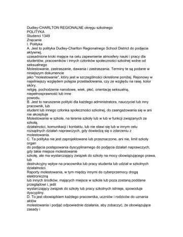 Dudley-CHARLTON REGIONALNE okręgu szkolnego POLITYKA Studenci 1349 Znęcanie I. Polityka A. Jest to polityka Dudley-Charlton Regionalnego School District do podjęcia aktywnej, uzasadnione kroki mające na celu zapewnienie atmosfery nauki i pracy dla studentów, pracowników i innych członków społeczności szkolnej wolne od seksualnego Molestowanie, zastraszanie, dawania i zastraszania. Terminy te są podane w niniejszym dokumencie jako "molestowanie", który jest w szczególności określone poniżej. Rejonowy w najsilniejszy względem potępia prześladowania, czy ze względu na rasę, kolor skóry, religię, pochodzenie narodowe, wiek, płeć, orientację seksualną, niepełnosprawność lub inne powodu. B. Jest to naruszenie polityki dla każdego administratora, nauczyciel lub inny pracownik, lub student lub innego członka społeczności szkolnej, do zaangażowania się w ani nie akceptuje Molestowanie w szkole, na terenie szkoły lub w lub w funkcji związanych ze szkołą, działalności, komunikacji i kontaktu, lub nie stawi się lub w innym celu rozsądnych działań naprawczych, gdy dowiedzą się o zdarzeniu z molestowania. C. Ta polityka nie jest zaprojektowane lub przeznaczone, ani nie, limit szkoły organ do podjęcia postępowania dyscyplinarnego do podjęcia działań naprawczych, gdy takie miejsce molestowanie szkołę, ale ma wystarczający związek do szkoły na mocy obowiązującego prawa, lub destrukcyjny wpływ na pracownika lub pracy studenta lub udział w szkolnych działalności. Raporty molestowania, w tym między innymi do cyberprzemocy drogą elektroniczną lub innych środków, mających miejsce w szkole lub poza zostaną poddane przeglądowi i, jeśli wystarczający związek do szkoły lub pracy szkolnych istnieje, spowoduje dyscypliny. D. To jest obowiązkiem każdego pracownika, uczniów i rodziców do uznania aktów molestowania i podjąć odpowiednie działania, aby zobaczyć, że obowiązujące zasady i procedury tego okręgu szkolnego wykonania. Wszyscy członkowie szkoły społeczności i musi działać jako partnerzy w takich działań, jeżeli chcemy mieć rozsądną szansę powodzenia w zapobieganie lub zmniejszanie działalności tego rodzaju, , która jest szkodliwa zarówno dla ofiary jak i sprawcy. Dzieci uczęszczających do Nasze szkoły są w stanie krytycznym, etapy kształtowania swojego życia. Do tego stopnia, że my, Pracując razem, są w stanie pokazać im lepszy sposób, będą czerpać niezmierną, przez całe życie korzyści. -2E. Każdy pracownik lub student, który uważa, że on lub ona została poddana Molestowanie ma prawo do złożenia skargi i otrzymać szybką i rozsądnie odpowiedniej obsługi reklamacji. Podczas właściwego stosowania tej polityki przewidzenia może wymagać ujawnienia lub wszystkich otrzymanych informacji, wszystkie starań, będzie do zachowania tajemnicy w zakresie zgodnym z egzekwowaniem prawa. F. głównym budynku / wyznaczone są odpowiedzialne za udzielanie pomocy pracownikom i studentów poszukujących wskazówek lub pomocy w rozwiązywaniu spraw odnoszących się do wszelkich form molestowania. II. Zakaz i definicje Molestowanie, zastraszanie, w tym, może przybierać różne formy. To jest zupełnie nie do przyjęcia w środowiska szkoły lub pracy. W rezultacie, nie każdy student, ani pracownik, ani inne członek społeczności szkolnej poddaje się prześladowania, zastraszanie, zastraszanie, lub cyberprzemocy w każdym instytut edukacji. A. "molestowanie", w tym "Bullying", to w tym między innymi do "cyberprzemocy", użyte w tym polityki oznacza niepożądane formie pisemnej, elektronicznej, werbalne lub fizycznej komunikacji, działań lub gest, który: (1) uzasadnione przyczyny studenta lub pracownik czuć przymus, zastraszenie, prześladowani lub zagrożone (2) w ramach przewidzenia okoliczności może spowodować: (a) rozsądnej osoby fizyczne lub cierpieć emocjonalnej krzywdy, lub (b) uszkodzenia ucznia lub pracownika własności, lub (c) uciążliwy lub wrogie środowisku szkolnym. Zachowanie może zakłócać zdolności pracownika do wykonywania swoich obowiązków lub studenta w nauce lub zdolność do uczenia się, lub zakłócać umiejętność uczestniczenia i korzystania z usług, działalności lub przywileje: 1. , które są oferowane przez lub za pośrednictwem okręgu szkolnego, lub 2. w każdej dzielnicy związane z programem edukacyjnym lub działalności, lub 3. podczas gdy w szkole, na lub za pomocą własności okręgu szkolnego lub urządzenia w pojazd szkole, w autobusie szkolnym, w szkole, wyznaczone przystanki, na schoolsponsored działania, w imprezach sankcjonowanych szkoły lub 4. poprzez wykorzystanie danych, telefon lub oprogramowania komputerowego, które są udostępniane za pośrednictwem komputera, systemu komputerowego lub sieci komputerowej lub innego publicznego instytut edukacji związane lub dostarczone lub ułatwione przez powiat lub 5. w sytuacji, poza tym ma wystarczający związek ze szkołą dzielnicy. B. "Komunikacja elektroniczna", użyte w tym polityki oznacza każdy komunikat przez urządzenie elektroniczne, w tym między innymi do telefonu, telefonu komórkowego, komputera lub pager.