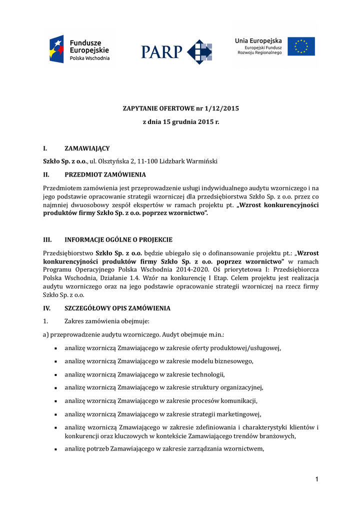 ZAPYTANIEOFERTOWEnr1/12/2015 zdnia15grudnia2015r. I. ZAMAWIAJĄCY SzkłoSp.zo.o.,ul.Olsztyń ska2,11-100LidzbarkWarmiń ski II. PRZEDMIOTZAMÓWIENIA Przedmiotemzamó wieniajestprzeprowadzenieusługiindywidualnegoaudytuwzorniczegoina jegopodstawieopracowaniestrategiiwzorniczejdlaprzedsiębiorstwaSzkłoSp.zo.o.przezco najmniej dwuosobowy zespó ł ekspertó w w ramach projektu pt. „Wzrost konkurencyjności produktówQirmySzkłoSp.zo.o.poprzezwzornictwo”. III. INFORMACJEOGÓLNEOPROJEKCIE Przedsiębiorstwo Szkło Sp. z o.o. będzie ubiegało się o doFinansowanie projektu pt.: „Wzrost konkurencyjności produktów Qirmy Szkło Sp. z o.o. poprzez wzornictwo” w ramach Programu Operacyjnego Polska Wschodnia 2014-2020. Oś priorytetowa I: Przedsiębiorcza Polska Wschodnia, Działanie 1.4. Wzó r na konkurencję I Etap. Celem projektu jest realizacja audytu wzorniczego oraz na jego podstawie opracowanie strategii wzorniczej na rzecz Firmy SzkłoSp.zo.o. IV. SZCZEGÓŁOWYOPISZAMÓWIENIA 1. Zakreszamó wieniaobejmuje: a)przeprowadzenieaudytuwzorniczego.Audytobejmujem.in.: ▪ analizęwzornicząZmawiającegowzakresieofertyproduktowej/usługowej, ▪ analizęwzornicząZmawiającegowzakresiemodelubiznesowego, ▪ analizęwzornicząZmawiającegowzakresietechnologii, ▪ analizęwzornicząZmawiającegowzakresiestrukturyorganizacyjnej, ▪ analizęwzornicząZmawiającegowzakresieprocesó wkomunikacji, ▪ analizęwzornicząZmawiającegowzakresiestrategiimarketingowej, ▪ analizę wzorniczą Zmawiającego w zakresie zdeFiniowania i charakterystyki klientó w i konkurencjiorazkluczowychwkontekś cieZamawiającegotrendó wbranż owych, ▪ analizępotrzebZamawiającegowzakresiezarządzaniawzornictwem, 1 ▪ analizę oferty pod kątem wykorzystania wzornictwa i potencjału rynkowego Zamawiającego. b) opracowanie strategii wzorniczej, w postaci raportu z przeprowadzonego audytu wzorniczego,zawierającegoconajmniejnastępująceelementy: ▪ ogó lnącharakterystykęZamawiającegozawierającąanalizęwzornicząprzedsiębiorstwa w zakresie produktó w, technologii, struktury organizacyjnej, procesó w komunikacji, strategiimarketingowej, ▪ ogó lnyopisotoczeniaZamawiającegowzakresiedesignuzawierającegoconajmniej informacjeodnoś niecharakterystykiklientó w,opisgłó wnychkonkurentó witrendó w rynkowych, ▪ okreś leniekluczowychwkontekś cieZamawiającegotrendó wbranż owych,społecznych itechnologicznychoduż ympotencjalewpływunarynekZamawiającego. ▪ ocenępoziomuwykorzystaniawzornictwaprzezZamawiającegoorazjegopotencjałuw tymzakresie, ▪ zdeFiniowanieproblemó wwzorniczychZamawiającego,przyczymproblemytemogą dotyczyć zaró wnoproduktu,jakiinnychprocesó wbiznesowychwprzedsiębiorstwie, ▪ rekomendacjedalszychszczegó łowychdziałań dlaZamawiającego. 2.KodCPVusługi:79212000-3Usługiaudytu. 3.Przedmiotdziałalnoś ciZamawiającegoobejmuje:produkcja,obró bkaszkłapłaskiegoiluster 4. Po zakoń czeniu postępowania ofertowego zamawiający zawrze z wyłonionym Wykonawcą Zamó wienia warunkową umowę na realizację audytu wzorniczego wraz ze strategią, któ ra będziewszczegó lnoś cizawierała: a) opisdziałań planowanychdorealizacjiwramachaudytuwzorniczegozuwzględnieniem harmonogramuimiejscaichrealizacji, b) planowany termin rozpoczęcia i zakoń czenia audytu wzorniczego oraz opracowania strategiiwzorniczej, c) informację o zespole Wykonawcy realizującym audyt oraz opracowującym strategię wzornicząwrazzprzypisaniemosó bdoposzczegó lnychdziałań , d) informacjęoosobachwyznaczonychzestronyZamawiającegodowspó łpracyprzy realizacjiaudytuiopracowaniastrategiiwzorniczej, e) wynagrodzenie przysługujące Wykonawcy za realizację działań związanych z przeprowadzeniemaudytuorazopracowaniemstrategiiwzorniczej, f) kwestieprzeniesienianaZamawiającegoautorskichprawmajątkowychipraw 2 zależ nychdowszelkichutworó wpowstałychwzwiązkuzprzeprowadzeniemaudytu wzorniczegoiopracowaniemstrategiiwzorniczej, g) zobowiązanieWykonawcydoudziałujegoprzedstawicielawposiedzeniuPanelu Ekspertó wwterminiewyznaczonymprzezPARP,zgodniezRegulaminemkonkursu doEtapuIdziałania1.4„Wzó rnakonkurencję”POPW h) zobowiązanie Wykonawcy do opracowania strategii wzorniczej zgodnie z wymogami okreś lonymi w Regulaminie konkursu do Etapu I działania 1.4 „Wzó r na konkurencję” POPW, i) zobowiązanie Wykonawcy do uzgodnienia ostatecznej wersji strategii wzorniczej z Zamawiającym, j) zobowiązanie Wykonawcy do uwzględnienia uwag do strategii wzorniczej zgłoszonych przezPARP, k) warunek uzależ niający obowiązywanie umowy od otrzymania przez Zamawiającego informacjiodPARPoprzyznaniudoFinansowaniadorealizacjiProjektu, l) zobowiązanie Wykonawcy do realizacji usługi doradczej zgodnie z zasadami działania 1.4„Wzó rnakonkurencję”POPW. 5.ObowiązywanieumowywarunkowejnarealizacjęaudytuwzorniczegoZamawiającyuzależ nia od otrzymania informacji od PARP przyznaniu dotacji do realizacji projektu „Wzrost konkurencyjności produktów Qirmy Szkło Sp. z o.o. poprzez wzornictwo” w ramach Działania 1.4 „Wzó r na konkurencję", I Osi priorytetowej: „Przedsiębiorcza Polska Wschodnia", ProgramuOperacyjnegoPolskaWschodnia2014–2020. V.TERMIN,MIEJSCEIZASADYREALIZACJIUSŁUGI 1. Usługazostaniezrealizowanawsiedzibieprzedsiębiorstwa: SzkłoSp.zo.o.,ul.Olsztyń ska2,11-100LidzbarkWarmiń ski 2. Realizacja usługi zostanie rozpoczęta najpó ź niej w terminie jednego miesiąca od dnia zawarcia umowy o doFinansowanie w ramach Programu Operacyjnego Polska Wschodnia,Działanie1.4„Wzó rnakonkurencję”-etapIibędzietrwałamaksymalnie5 miesięcy. 3. W przypadku skierowania wniosku o doFinansowanie do oceny merytorycznej, przedstawiciel wybranego przez Zamawiającego Wykonawcy weź mie udział w Panelu Ekspertó w,októ rymmowaw§10regulaminuKonkursuProgramuOperacyjnegoPolska Wschodnia 2014-2020, Oś priorytetowa I, w terminie wyznaczonym przez Polską Agencję Rozwoju Przedsiębiorczo