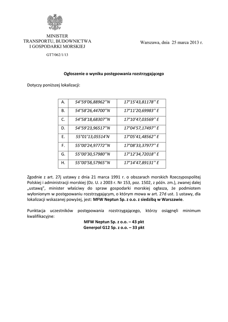 MINISTER TRANSPORTU, BUDOWNICTWA I GOSPODARKI MORSKIEJ Warszawa, dnia 25 marca 2013 r. GT7/062/1/13 Ogłoszenie o wyniku postępowania rozstrzygającego Dotyczy poniższej lokalizacji: A. 54°59’06,88962’’N 17°15’43,81178’' E B. 54°58’26,44700’’N 17°11’20,69983’' E C. 54°58’18,68307’’N 17°10’47,03569’' E D. 54°59’23,96517’’N 17°04’57,17497’' E E. 55°01’13,05514’N 17°05’41,48562’' E F. 55°00’24,97772’’N 17°08’33,37977’' E G. 55°00’30,57980’’N 17°12’34,72018’' E H. 55°00’58,57965’’N 17°14’47,89131’' E Zgodnie z art. 27j ustawy z dnia 21 marca 1991 r. o obszarach morskich Rzeczypospolitej Polskiej i administracji morskiej (Dz. U. z 2003 r. Nr 153, poz. 1502, z późn. zm.), zwanej dalej „ustawą”, minister właściwy do spraw gospodarki morskiej ogłasza, że podmiotem wyłonionym w postępowaniu rozstrzygającym, o którym mowa w art. 27d ust. 1 ustawy, dla lokalizacji wskazanej powyżej, jest: MFW Neptun Sp. z o.o. z siedzibą w Warszawie. Punktacja uczestników postępowania rozstrzygającego, którzy osiągnęli kwalifikacyjne: MFW Neptun Sp. z o.o. – 43 pkt Generpol G12 Sp. z o.o. – 33 pkt minimum
