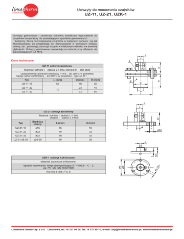 Uchwyty do mocowania czujników SENSOR UZ-11, UZ-21, UZK-1 Uchwyty gwintowane i zaciskowe stanowią dodatkowe wyposażenie do czujników temperatury nie posiadających łączników gwintowanych i kołnierzy. Służą do instalowania czujników w miejscach pomiaru i są tak skonstruowane, że umożliwiaja ich zamocowanie w dowolnym miejscu osłony, tzn., pozwalają zanurzyć czujnik w mierzonym ośrodku na dowolną głębokość. Uchwyty gwintowane zapewniają szczelność przy ciśnieniu nie przekraczającym 0,1 MPa. d Dane techniczne l 32 UZ-11 uchwyt zaciskowy Materiał: kołnierz I – staliwo L II 600, kołnierz II – stal St3S Typ L (mm) d (mm) D (mm) UZ-11-15 55 16 35 UZ-11-22 70 UZ-11-32 23 40 33 50 ll 40 Uszczelnienie: pierścień teflonowy PTFE – do 200°C w powietrzu Opcja: sznur ceramiczny – do 650°C w powietrzu – typ UZ-11T D L d UZ-21 uchwyt zaciskowy 32 Materiał: kołnierz – staliwo L II 600 obejma – staliwo L II 600 L (mm) d (mm) UZ-21-15 ø15 55 16 UZ-21-22 ø22 70 23 UZ-21-32 ø32 70 33 UZ-21-26-29 ø26-29 70 29 ø9.5 d 5 Średnica osłony UZK-1 uchwyt kołnierzowy 16.5 Typ (3× ø49 ø4 .7 Na rurę d [mm] = 6, 8 ø38 Sposób mocowania: wkręt samogwintujący ST 4,8x9,5 – C – Z wg PN–EN ISO 7049:1999 ) Materiał: aluminium (niklowane) Limatherm Sensor Sp. z o.o. Limanowa, tel. 18 337 99 00, fax 18 337 99 10, e-mail: [email protected], www.limathermsensor.pl Uchwyty do mocowania czujników SENSOR UZ-11, UZ-21, UZK-1 Kod wyrobu Typ uchwytu 1 UZ-21, UZ-11, UZ-11T zaciskowy UZK-1 kołnierzowy (tylko d [mm]: 6-10) Średnica rury d 22 2 22 mm inne parametry wg uzgodnień 2 1 UZ – – Przykład zamówienia: UZ-11–22 Limatherm Sensor Sp. z o.o. Limanowa, tel. 18 337 99 00, fax 18 337 99 10, e-mail: [email protected], www.limathermsensor.pl