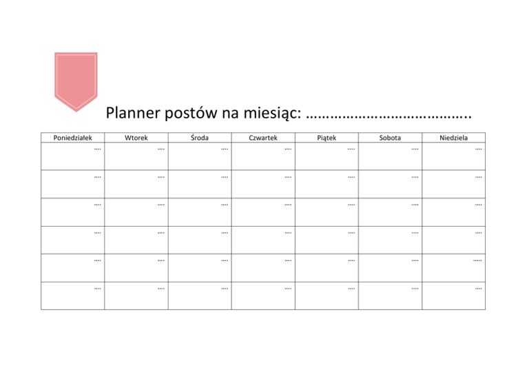 Planner postów na miesiąc: ………………………………….. Poniedziałek Wtorek Środa Czwartek Piątek Sobota Niedziela …. …. …. …. .... …. …. …. …. …. …. …. …. …. …. …. …. …. …. …. …. …. …. …. …. …. …. …. …. …. …. …. …. …. ….. …. …. …. …. …. …. ….