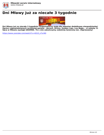 Mławski serwis internetowy www.mlawa.pl Dni Mławy już za niecałe 3 tygodnie Dni Mławy już za niecałe 3 tygodnie! Organizatorzy mają dla mławian dodatkową niespodziankę! Oprócz zapowiedzianych wcześniej gwiazd - Akcent, Mrozu, Golden Lips, Lou Bega... w sobotę 11 lipca w Mławie wystąpi GROMEE. To z nim zakończymy sobotnią taneczną noc. Zapraszamy! https://www.youtube.com/watch?v=4ZcD_n7xrN0 Strona 1/1