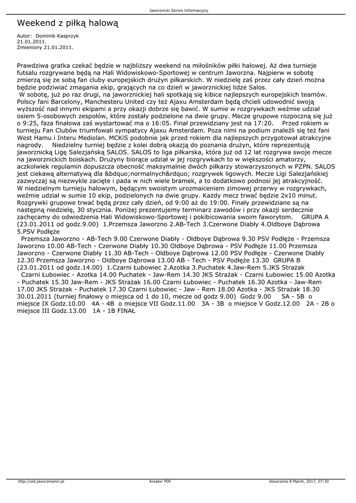 Jaworznicki Serwis Informacyjny Weekend z piłką halową Autor: Dominik Kasprzyk 21.01.2011. Zmieniony 21.01.2011. Prawdziwa gratka czekać będzie w najbliższy weekend na miłośników piłki halowej. Aż dwa turnieje futsalu rozgrywane będą na Hali Widowiskowo-Sportowej w centrum Jaworzna. Najpierw w sobotę zmierzą się ze sobą fan cluby europejskich drużyn piłkarskich. W niedzielę zaś przez cały dzień można będzie podziwiać zmagania ekip, grających na co dzień w jaworznickiej lidze Salos. W sobotę, już po raz drugi, na jaworznickiej hali spotkają się kibice najlepszych europejskich teamów. Polscy fani Barcelony, Manchesteru United czy też Ajaxu Amsterdam będą chcieli udowodnić swoją wyższość nad innymi ekipami a przy okazji dobrze się bawić. W sumie w rozgrywkach weźmie udział osiem 5-osobowych zespołów, które zostały podzielone na dwie grupy. Mecze grupowe rozpoczną się już o 9:25, faza finałowa zaś wystartować ma o 16:05. Finał przewidziany jest na 17:20. Przed rokiem w turnieju Fan Clubów triumfowali sympatycy Ajaxu Amsterdam. Poza nimi na podium znaleźli się też fani West Hamu i Interu Mediolan. MCKiS podobnie jak przed rokiem dla najlepszych przygotował atrakcyjne nagrody. Niedzielny turniej będzie z kolei dobrą okazją do poznania drużyn, które reprezentują jaworznicką Ligę Salezjańską SALOS. SALOS to liga piłkarska, która już od 12 lat rozgrywa swoje mecze na jaworznickich boiskach. Drużyny biorące udział w jej rozgrywkach to w większości amatorzy, aczkolwiek regulamin dopuszcza obecność maksymalnie dwóch piłkarzy stowarzyszonych w PZPN. SALOS jest ciekawą alternatywą dla „normalnych” rozgrywek ligowych. Mecze Ligi Salezjańskiej zazwyczaj są niezwykle zacięte i pada w nich wiele bramek, a to dodatkowo podnosi jej atrakcyjność. W niedzielnym turnieju halowym, będącym swoistym urozmaiceniem zimowej przerwy w rozgrywkach, weźmie udział w sumie 10 ekip, podzielonych na dwie grupy. Każdy mecz trwać będzie 2x10 minut. Rozgrywki grupowe trwać będą przez cały dzień, od 9:00 aż do 19:00. Finały przewidziane są na następną niedzielę, 30 stycznia. Poniżej prezentujemy terminarz zawodów i przy okazji serdecznie zachęcamy do odwiedzenia Hali Widowiskowo-Sportowej i pokibicowania swoim faworytom. GRUPA A (23.01.2011 od godz.9.00) 1.Przemsza Jaworzno 2.AB-Tech 3.Czerwone Diabły 4.Oldboye Dąbrowa 5.PSV Podłęże Przemsza Jaworzno - AB-Tech 9.00 Czerwone Diabły - Oldboye Dąbrowa 9.30 PSV Podłęże - Przemsza Jaworzno 10.00 AB-Tech - Czerwone Diabły 10.30 Oldboye Dąbrowa - PSV Podłęże 11.00 Przemsza Jaworzno - Czerwone Diabły 11.30 AB-Tech - Oldboye Dąbrowa 12.00 PSV Podłęże - Czerwone Diabły 12.30 Przemsza Jaworzno - Oldboye Dąbrowa 13.00 AB - Tech - PSV Podłęże 13.30 GRUPA B (23.01.2011 od godz.14.00) 1.Czarni Łubowiec 2.Azotka 3.Puchatek 4.Jaw-Rem 5.JKS Strażak Czarni Łubowiec - Azotka 14.00 Puchatek - Jaw-Rem 14.30 JKS Strażak - Czarni Łubowiec 15.00 Azotka - Puchatek 15.30 Jaw-Rem - JKS Strażak 16.00 Czarni Łubowiec - Puchatek 16.30 Azotka - Jaw-Rem 17.00 JKS Strażak - Puchatek 17.30 Czarni Łubowiec - Jaw - Rem 18.00 Azotka - JKS Strażak 18.30 30.01.2011 (turniej finałowy o miejsca od 1 do 10, mecze od godz 9.00) Godz 9.00 5A - 5B o miejsce IX Godz.10.00 4A - 4B o miejsce VII Godz.11.00 3A - 3B o miejsce V Godz.12.00 2A - 2B o miejsce III Godz.13.00 1A - 1B FINAŁ http://old.jaworznianin.pl Kreator PDF Utworzono 8 March, 2017, 07:30