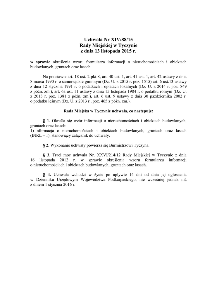 Uchwała Nr XIV/88/15 Rady Miejskiej w Tyczynie z dnia 13