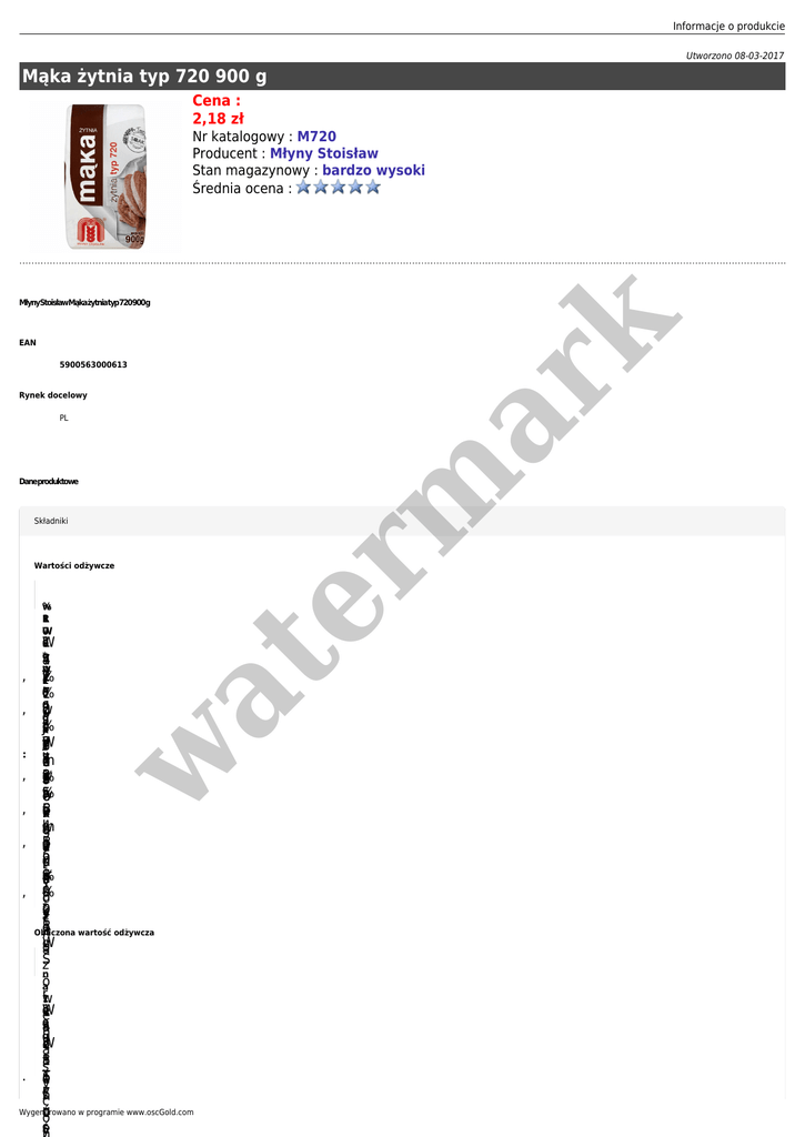 Informacje o produkcie Utworzono 08-03-2017 Mąka żytnia typ 720 900 g Cena : 2,18 zł Nr katalogowy : M720 Producent : Młyny Stoisław Stan magazynowy : bardzo wysoki Średnia ocena : er m ar k MłynyStoisławMąkażytniatyp720900g EAN 5900563000613 Rynek docelowy PL Daneproduktowe Składniki , : w , % w 1 R 0 W W 1 0 S *g a 4 7 p w T 1 r % r2 1 o 0 ł1 7 % t d 0 w 0 2 u g o k u g tsJś 4 % k t2 W 7 y g z/ć u at Wartości odżywcze 7 ę 1 m c3 e w 2 3 g % k z3 n tlw 5 % e 6 , 6 B y g o a r k łm 4 w scg , 1 B 5 o g cy e a in 9 2 u d tl S < 0 a g % n k ły , % ó 0 łirn u c *0 lk y sz R 1 o zn Obliczona wartość odżywcza W g ca S z n -o a rw 1 W 1 0 e e 0 a 4 fn g W 3 re 2 a a 3 trs 1 . 1 T ro 6 e y łtśn 7 c u Wygenerowano w programie www.oscGold.com o ćco sśe y , . . )) ) ) Mąka żytnia typ 720 Marketing Company Name er m ar k . at . 7 W y ę 1 m w 2 g k tlw 5 B 6 y o a łm 4 w s B 5 o cy in 9 u d t S < a n k ł ó 0 łirn u lk 0 y s (o 1 (z Opis g (g c produktu g z o Marka w e Stoisław Młyny n Cechy a s Twój smak y c Marka standaryzowana o n Marka - Młyny Stoisław e ( Nazwa produktu uregulowana prawnie g Przedsiębiorstwo Zbożowo-Młynarskie "PZZ" w Stoisławiu S.A. w . n a 1 w 0 0 0 t 4 g Adres firmy Stoisław 11 76-031 Mścice O producencie Posiadamy certyfikat jakości ISO 9001:2008 ISO 2200:2005 Przechowywanie i stosowanie Rodzaj przechowywania T y p P r z Informacje o produkcie Przechowywanie Przechowywać w suchym, przewiewnym miejscu. Opakowanie Rozmiar opakowania 900g Wymiar liczbowy Wymiar liczbowy - 900 at W y m 1 7 a g 0 7 a 9 7 n a (Zasady Wymiarowania Opakowań GS1) w s g Rodzaj opakowania y łz s e ę ro b Typ - Torba papierowa k o o k ś o Waga ć ś n ć Waga a brutto - 945 n p a ó p ł ó EAN 5900563000613 łc e c ( e (m ) Składniki m ) m er m ar k Wymiar w Wartości odżywcze 100 g produktu: %RWS* w 100 g Wartość energetyczna 1421 kJ/336 kcal 17% Tłuszcz 1,7 g 2% w tym kwasy tłuszczowe nasycone 0,36 g 2% Węglowodany 71 g 27% w tym cukry 2,5 g 3% Białko 5,9 g 12% Sól <0,01 g 0% * RWS - referencyjna wartość spożycia dla przeciętnej osoby dorosłej (8400 kJ/2000 kcal). Opis produktu Marka Młyny Stoisław Wygenerowano w programie www.oscGold.com Marketing O producencie Certyfikat Jakości ISO 9001:2009 i ISO 22000:2006 Pozostałe informacje Masa netto 900 g przy wilgotności 15% er m ar k Przechowywanie Przechowywać w suchym, przewiewnym miejscu. Rodzaj opakowania Typ - Torba papierowa Obsługa klienta Adres producenta Adres zwrotny at Przedsiębiorstwo Zbożowo-Młynarskie "PZZ" w Stoisławiu S.A. Stoisław 11 76-031 Mścice w Przedsiębiorstwo Zbożowo-Młynarskie "PZZ" w Stoisławiu S.A. Stoisław 11 76-031 Mścice tel.: +48/ 94 34 55 900 fax: +48/ 94 34 55 992 www.stoislaw.com.pl