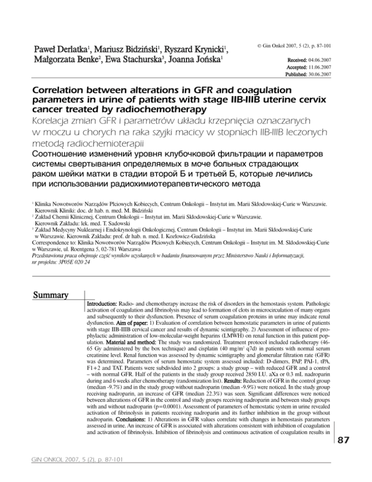 Pawe³ Derlatka1, Mariusz Bidziñski1, Ryszard Krynicki1, Ma³gorzata Benke2, Ewa Stachurska3, Joanna Joñska1 © Gin Onkol 2007, 5 (2), p. 87-101 Received: 04.06.2007 Accepted: 11.06.2007 Published: 30.06.2007 Correlation between alterations in GFR and coagulation parameters in urine of patients with stage IIB-IIIB uterine cervix cancer treated by radiochemotherapy Korelacja zmian GFR i parametrów uk³adu krzepniêcia oznaczanych w moczu u chorych na raka szyjki macicy w stopniach IIB-IIIB leczonych metod¹ radiochemioterapii Соотношение изменений уровня клубочковой фильтрации и параметров системы свертывания определяемых в моче больных страдающих раком шейки матки в стадии второй Б и третьей Б, которые лечились при использовании радиохимиотерапевтического метода 1 Klinika Nowotworów Narz¹dów P³ciowych Kobiecych, Centrum Onkologii – Instytut im. Marii Sk³odowskiej-Curie w Warszawie. Kierownik Kliniki: doc. dr hab. n. med. M. Bidziñski 2 Zak³ad Chemii Klinicznej, Centrum Onkologii – Instytut im. Marii Sk³odowskiej-Curie w Warszawie. Kierownik Zak³adu: lek. med. T. Sadowski 3 Zak³ad Medycyny Nuklearnej i Endokrynologii Onkologicznej, Centrum Onkologii – Instytut im. Marii Sk³odowskiej-Curie w Warszawie. Kierownik Zak³adu: prof. dr hab. n. med. I. Koz³owicz-Gudziñska Correspondence to: Klinika Nowotworów Narz¹dów P³ciowych Kobiecych, Centrum Onkologii – Instytut im. M. Sk³odowskiej-Curie w Warszawie, ul. Roentgena 5, 02-781 Warszawa Przedstawiona praca obejmuje czêœæ wyników uzyskanych w badaniu finansowanym przez Ministerstwo Nauki i Informatyzacji, nr projektu: 3P05E 020 24 Summary Introduction: Radio- and chemotherapy increase the risk of disorders in the hemostasis system. Pathologic activation of coagulation and fibrinolysis may lead to formation of clots in microcirculation of many organs and subsequently to their dysfunction. Presence of serum coagulation proteins in urine may indicate renal dysfunction. Aim of paper: 1) Evaluation of correlation between hemostatic parameters in urine of patients with stage IIB-IIIB cervical cancer and results of dynamic scintigraphy. 2) Assessment of influence of prophylactic administration of low-molecular-weight heparins (LMWH) on renal function in this patient population. Material and method: The study was randomized. Treatment protocol included radiotherapy (4665 Gy administered by the box technique) and cisplatin (40 mg/m2 q7d) in patients with normal serum creatinine level. Renal function was assessed by dynamic scintigraphy and glomerular filtration rate (GFR) was determined. Parameters of serum hemostatic system assessed included: D-dimers, PAP, PAI-1, tPA, F1+2 and TAT. Patients were subdivided into 2 groups: a study group – with reduced GFR and a control – with normal GFR. Half of the patients in the study group received 2850 I.U. aXa or 0.3 mL nadroparin during and 6 weeks after chemotherapy (randomization list). Results: Reduction of GFR in the control group (median -9.7%) and in the study group without nadroparin (median -9.9%) were noticed. In the study group receiving nadroparin, an increase of GFR (median 22.3%) was seen. Significant differences were noticed between alterations of GFR in the control and study groups receiving nadroparin and between study groups with and without nadroparin (p=0.0001). Assessment of parameters of hemostatic system in urine revealed activation of fibrinolysis in patients receiving nadroparin and its further inhibition in the group without nadroparin. Conclusions: 1) Alterations in GFR values correlate with changes in hemostasis parameters assessed in urine. An increase of GFR is associated with alterations consistent with inhibition of coagulation and activation of fibrinolysis. Inhibition of fibrinolysis and continuous activation of coagulation results in 87 GIN ONKOL 2007, 5 (2), p. 87-101 ORIGINAL CONTRIBUTIONS/PRACE ORYGINALNE I POGL¥DOWE reduction of GFR values. 2) Prophylactic administration of LMWH enhance activation of fibrinolysis, resulting in an improvement of GFR values in this patient population. Key words: cervical cancer, radiochemotherapy, renal failure, hemostatic parameters in urine, glomerular filtration rate (GFR) Streszczenie Wstêp: Radioterapia i chemioterapia zwiêkszaj¹ prawdopodobieñstwo zaburzeñ w uk³adzie hemostazy. Patologiczna aktywacja krzepniêcia i ograniczenie fibrynolizy mog¹ prowadziæ do powstania zakrzepów w mikrokr¹¿eniu wielu narz¹dów, upoœledzaj¹c ich czynnoœæ. Pojawienie siê osoczowych bia³ek uk³adu krzepniêcia w moczu œwiadczy o nieprawid³owej czynnoœci nerek. Cele pracy: 1) Ocena korelacji wartoœci parametrów uk³adu hemostazy oznaczanych w moczu chorych na raka szyjki macicy w stopniu IIB-IIIB z wynikami scyntygrafii dynamicznej. 2) Ocena wp³ywu profilaktyki heparynami drobnocz¹steczkowymi na czynnoœæ nerek w badanej grupie chorych. Materia³ i metoda: Badanie mia³o charakter randomizowany. Leczenie zak³ada³o podanie dawki 46-65 Gy technik¹ box i cisplatyny w dawce 40 mg/m2 co 7 dni u chorych z prawid³owymi wartoœciami kreatyniny we krwi. Czynnoœæ nerek oceniano za pomoc¹ scyntygrafii dynamicznej, oznaczaj¹c filtracjê k³êbkow¹ (GFR). W osoczowym uk³adzie hemostazy oznaczano stê¿enia D-dimerów, PAP, PAI-1, tPA, F1+2 i TAT. Pacjentki podzielono na dwie grupy: badan¹ – z obni¿onym GFR i kontroln¹ – z prawid³owym GFR. W grupie badanej po³owa pacjentek otrzymywa³a 2850 j.m. aXa/0,3 ml nadroparyny w trakcie i 6 tygodni po leczeniu (lista randomizacyjna). Wyniki: Stwierdzono spadki GFR w grupie kontrolnej (mediana -9,7%) i grupie badanej bez nadroparyny (mediana -9,9%). W grupie badanej otrzymuj¹cej nadroparynê zaobserwowano wzrost wartoœci GFR (mediana 22,3%). Stw