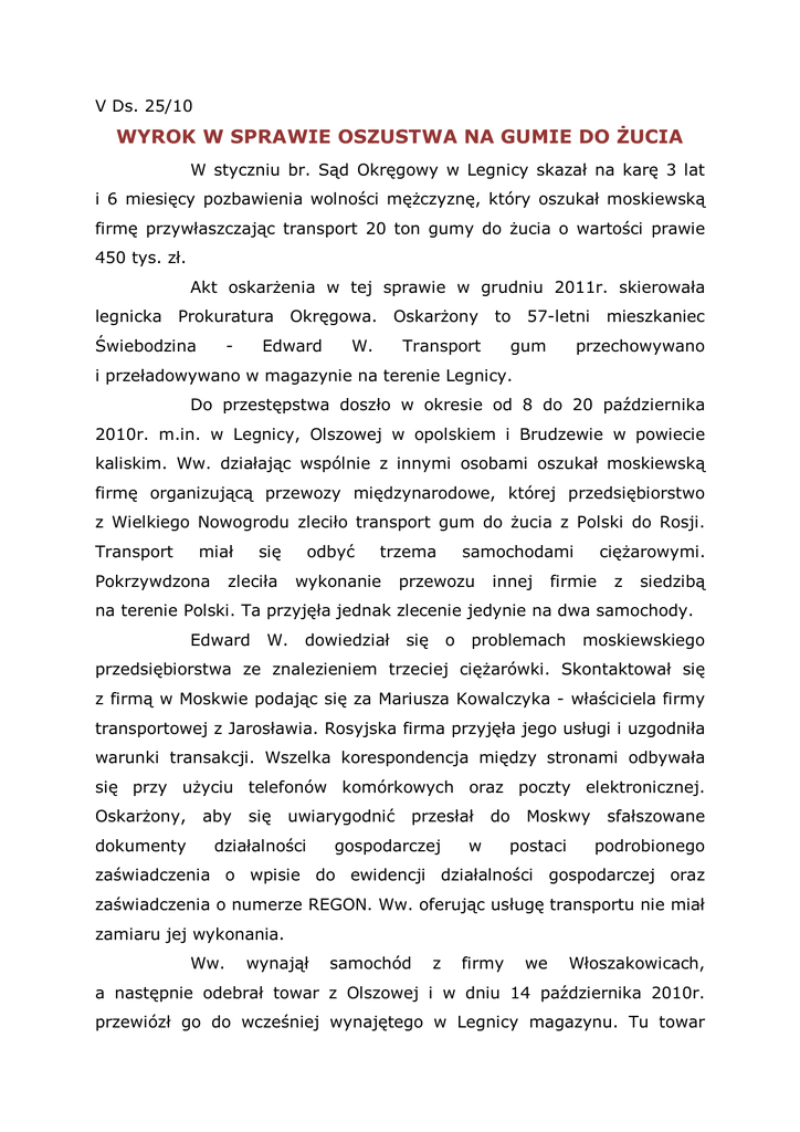 V Ds. 25/10 WYROK W SPRAWIE OSZUSTWA NA GUMIE DO ŻUCIA W styczniu br. Sąd Okręgowy w Legnicy skazał na karę 3 lat i 6 miesięcy pozbawienia wolności mężczyznę, który oszukał moskiewską firmę przywłaszczając transport 20 ton gumy do żucia o wartości prawie 450 tys. zł. Akt oskarżenia w tej sprawie w grudniu 2011r. skierowała legnicka Prokuratura Okręgowa. Oskarżony Świebodzina - Edward W. to 57-letni Transport gum mieszkaniec przechowywano i przeładowywano w magazynie na terenie Legnicy. Do przestępstwa doszło w okresie od 8 do 20 października 2010r. m.in. w Legnicy, Olszowej w opolskiem i Brudzewie w powiecie kaliskim. Ww. działając wspólnie z innymi osobami oszukał moskiewską firmę organizującą przewozy międzynarodowe, której przedsiębiorstwo z Wielkiego Nowogrodu zleciło transport gum do żucia z Polski do Rosji. Transport miał Pokrzywdzona się odbyć zleciła trzema wykonanie samochodami przewozu innej ciężarowymi. firmie z siedzibą na terenie Polski. Ta przyjęła jednak zlecenie jedynie na dwa samochody. Edward W. dowiedział się o problemach moskiewskiego przedsiębiorstwa ze znalezieniem trzeciej ciężarówki. Skontaktował się z firmą w Moskwie podając się za Mariusza Kowalczyka - właściciela firmy transportowej z Jarosławia. Rosyjska firma przyjęła jego usługi i uzgodniła warunki transakcji. Wszelka korespondencja między stronami odbywała się przy użyciu telefonów komórkowych oraz poczty elektronicznej. Oskarżony, dokumenty aby się uwiarygodnić działalności przesłał gospodarczej do w Moskwy postaci sfałszowane podrobionego zaświadczenia o wpisie do ewidencji działalności gospodarczej oraz zaświadczenia o numerze REGON. Ww. oferując usługę transportu nie miał zamiaru jej wykonania. Ww. wynajął samochód z firmy we Włoszakowicach, a następnie odebrał towar z Olszowej i w dniu 14 października 2010r. przewiózł go do wcześniej wynajętego w Legnicy magazynu. Tu towar 2 został rozładowany. Za transport oskarżony zapłacił 3.000 zł. Za wynajęcie magazynu zaliczkę w kwocie 2.000 zł. 15 października 2010r. oskarżony wraz z innym mężczyzną pojawili się w legnickim magazynie i załadowali gumy do żucia na inną wynajętą ciężarówkę. Transport wykonano na posesję w miejscowości Brudzew w powiecie kaliskim. Na podstawie portretów pamięciowych sporządzonych w oparciu o zeznania świadków oraz dzięki wnikliwej analizie bilingów telefonicznych i sprawdzeniu hoteli ustalono, iż jednym ze sprawców przestępstwa i organizatorów procederu był Edward W. Ww. zatrzymano 8 listopada 2011r. Edwardowi W. przedstawiono zarzut popełnienia oszustwa w stosunku do mienia znacznej wartości, którego kwota w roku 2010r. musiała przekraczać 263.400 zł. Szkoda wyrządzona przestępstwem wyniosła 447.391,09 zł. Przesłuchany w charakterze podejrzanego Edward W. nie przyznał się do popełnienia zarzuconego mu czynu. Ww. groziła kara od roku do lat 10 pozbawienia wolności. 17 stycznia br. Sąd Okręgowy w Legnicy skazał ww. na karę 3 lat i 6 miesięcy pozbawienia wolności. Sąd orzekł też wobec ww. środek karny w postaci obowiązku naprawienia połowy szkody poprzez zapłatę na rzecz pokrzywdzonego kwoty 223.695,54 zł. Ww. musi też zwrócić 7.500 zł tyłem kosztów sądowych.