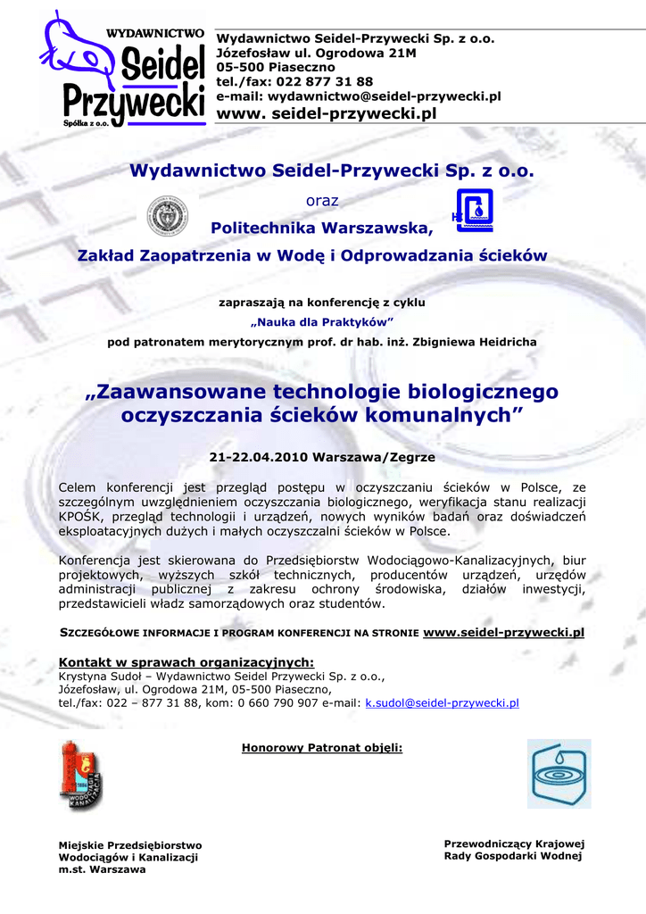 Wydawnictwo Seidel-Przywecki Sp. z o.o. Józefosław ul. Ogrodowa 21M 05-500 Piaseczno tel./fax: 022 877 31 88 e-mail: [email protected] www. seidel-przywecki.pl Wydawnictwo Seidel-Przywecki Sp. z o.o. oraz Politechnika Warszawska, Zakład Zaopatrzenia w Wodę i Odprowadzania ścieków zapraszają na konferencję z cyklu „Nauka dla Praktyków” pod patronatem merytorycznym prof. dr hab. inż. Zbigniewa Heidricha „Zaawansowane technologie biologicznego oczyszczania ścieków komunalnych” 21-22.04.2010 Warszawa/Zegrze Celem konferencji jest przegląd postępu w oczyszczaniu ścieków w Polsce, ze szczególnym uwzględnieniem oczyszczania biologicznego, weryfikacja stanu realizacji KPOŚK, przegląd technologii i urządzeń, nowych wyników badań oraz doświadczeń eksploatacyjnych dużych i małych oczyszczalni ścieków w Polsce. Konferencja jest skierowana do Przedsiębiorstw Wodociągowo-Kanalizacyjnych, biur projektowych, wyższych szkół technicznych, producentów urządzeń, urzędów administracji publicznej z zakresu ochrony środowiska, działów inwestycji, przedstawicieli władz samorządowych oraz studentów. SZCZEGÓŁOWE INFORMACJE I PROGRAM KONFERENCJI NA STRONIE www.seidel-przywecki.pl Kontakt w sprawach organizacyjnych: Krystyna Sudoł – Wydawnictwo Seidel Przywecki Sp. z o.o., Józefosław, ul. Ogrodowa 21M, 05-500 Piaseczno, tel./fax: 022 – 877 31 88, kom: 0 660 790 907 e-mail: [email protected] Honorowy Patronat objęli: Miejskie Przedsiębiorstwo Wodociągów i Kanalizacji m.st. Warszawa Przewodniczący Krajowej Rady Gospodarki Wodnej TERMIN KONFERENCJI: 21-22 kwietnia 2010 r. Konferencja rozpocznie się 21 kwietnia o godz. 10.00 a zakończy się 22 kwietnia ok. godz. 16.00. W drugim dniu konferencji przewidziana jest wycieczka do oczyszczalni ścieków Czajka MIEJSCE KONFERENCJI: Hotel 500 Zegrze Południowe, ul. Warszawska 31, 05-091 Zegrze Południowe WARUNKI UCZESTNICTWA: Warunkiem uczestnictwa w konferencji jest nadesłanie wypełnionej karty zgłoszenia oraz wniesienie opłaty uczestnictwa. TERMIN NADSYŁANIA ZGŁOSZEŃ: do dnia 31.03.2010 r. KOSZT KONFERENCJI: Całkowity koszt uczestnictwa w konferencji wynosi 790,00 zł + 22% VAT = 963,80 zł RABAT dla uczestników pozostałych konferencji z cyklu „Nauka dla Praktyków”: „Nowe kierunki przeróbki i zagospodarowania osadów ściekowych” (22-23.06.2010) „Kierunki zaopatrzenia w wodę do picia” (2-3.09.2010) „Mechaniczne oczyszczanie ścieków” (22-23.09.2010) Proszę zaznaczyć konferencje w których chcą Państwo wziąć udział -szczegóły wszystkich konferencji na www.seidel-przywecki.pl • • • Uczestnictwo w 2 konferencjach – RABAT 5% Uczestnictwo w 3 konferencjach – RABAT 7% Uczestnictwo w 4 konferencjach – RABAT 10% W ramach opłaty zapewniamy m.in. udział w konferencji, wycieczka do oczyszczalni ścieków Czajka, wyżywienie podczas trwania konferencji, materiały konferencyjne, oraz udział w uroczystej kolacji. UWAGA!!! OPŁATA ZA KONFERENCJĘ NIE OBEJMUJE KOSZTÓW NOCLEGU. W Hotelu 500 zarezerwowane są dla uczestników konferencji miejsca hotelowe w pokojach 1 i 2 osobowych. Ilość pokoi 1 osobowych jest ograniczona. Koszt noclegu w pokoju 2 osobowym wynosi 200 zł brutto (100 zł od osoby). Hotel 500 kontakt: tel. (22) 774 66 66, faks (22) 774 22 44, e-mail: [email protected] W PRZYPADKU REZYGNACJI Z UDZIAŁU W KONFERENCJI WYDAWNICTWO NIE ZWRACA PONIESIONYCH KOSZTÓW ---------------------------------------------------------------------------------------------------------------------------------KARTA ZGŁOSZENIA UDZIAŁU W SEMINARIUM „Zaawansowane technologie biologicznego oczyszczania ścieków komunalnych” 21-22 kwietnia 2010 Uczestnik 1 Uczestnik 2 Uczestnik 3 Nazwisko i imię Tytuł, stopień Stanowisko Adres e-mail uczestnika Nazwa instytucji (do faktury) Adres do korespondencji ulica kod miejscowość nr tel nr faksu Jesteśmy zainteresowani wycieczką do oczyszczalni ścieków Czajka Należność z tytułu uczestnictwa prosimy wpłacić przelewem na konto Wydawnictwa Seidel-Przywecki w WBK Bank Zachodni S.A. 80 1090 1056 0000 0000 0601 8037 z dopiskiem „Seminarium Warszawa kwiecień 2010”. Wydawnictwo wystawi fakturę VAT po uregulowaniu opłaty za seminarium. Nasz numer NIP: ........................................................................................ Oświadczenie: Upoważniamy Wydawnictwo „Seidel-Przywecki” do wystawienia faktury VAT bez naszego podpisu. ..................................................... Podpis/y uczestnika/ów seminarium .......................................... Podpis kierownika jednostki ......................................... Data Kartę zgłoszenia prosimy przesłać na adres zwrotny: Wydawnictwo „Seidel-Przywecki” Sp. z o.o., Józefosław, ul. Ogrodowa 21M, 05-500 Piaseczno lub faksem na numer: 022 / 877-31-88, tel. kom. 0660 790 907; mailto: [email protected]
