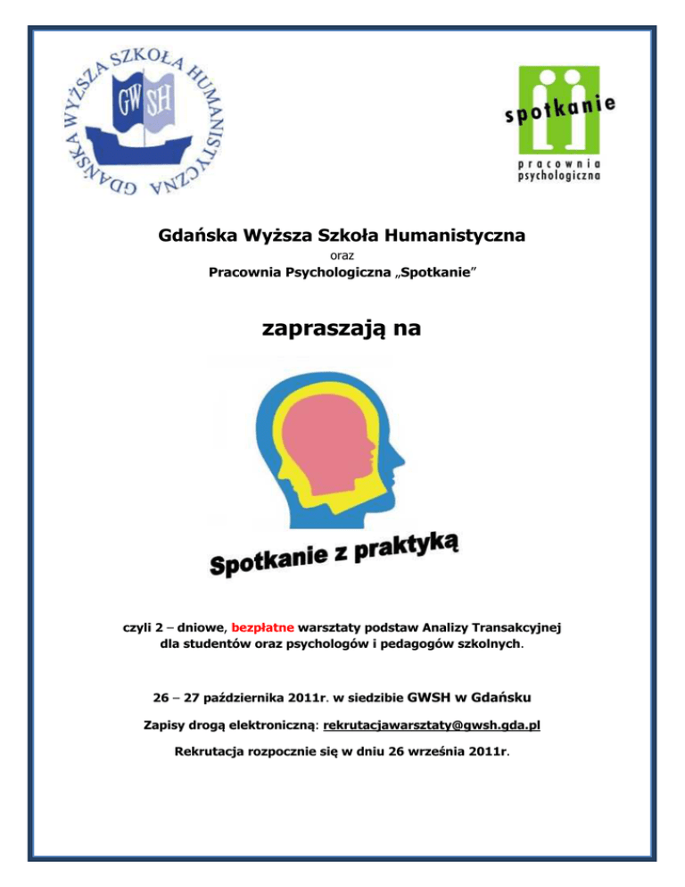 Gdańska Wyższa Szkoła Humanistyczna oraz Pracownia Psychologiczna „Spotkanie” zapraszają na czyli 2 – dniowe, bezpłatne warsztaty podstaw Analizy Transakcyjnej dla studentów oraz psychologów i pedagogów szkolnych. 26 – 27 października 2011r. w siedzibie GWSH w Gdańsku Zapisy drogą elektroniczną: [email protected] Rekrutacja rozpocznie się w dniu 26 września 2011r. Skąd pomysł: Pomysł zorganizowania „Spotkania z praktyką” zrodził się z obserwacji trudności, jakie mają młode osoby trafiające do pracy w szkole tuż po studiach. Przeżywają one ogromny stres związany z koniecznością przełożenia tego co wiedzą na praktyczne działanie, co okazuje się zadaniem trudnym i czasochłonnym. Obserwujemy jednocześnie, że psycholodzy i pedagodzy szkolni – jako grupa zawodowa – nie mają miejsc, w których mogą się dokształcać i uczyć tak regularnie i tak profesjonalnie, jak np. nauczyciele i dyrektorzy szkół. Z różnych doświadczeń szkoleniowych wiemy, że w proces wspólnego uczenia się studenci wnoszą świeże pomysły i entuzjazm, a praktycy cenne informacje o tym, jaka jest rzeczywistość zawodowa danej profesji. „Spotkanie z praktyką” jest pomysłem na wspólne uczenie się, które bazuje na mocnych stronach studentów i praktyków. Kilka słów o proponowanym „Spotkaniu z praktyką” Dla Ciebie, jeśli: 1. 2. 3. 4. 5. jesteś studentem kierunków pedagogicznych, jesteś psychologiem lub pedagogiem szkolnym, jesteś otwarty na spotkanie i wymianę, lubisz uczyć się w grupie, chcesz poznać wybrane narzędzia Analizy Transakcyjnej i ich zastosowanie w obszarze edukacji, 6. zawrzeć nowe znajomości na gruncie zawodowym. Metody pracy: Skoncentrujemy się na poznaniu narzędzi, które są możliwe do zastosowania w praktyce szkolnej. Będziemy ćwiczyć diagnozowanie i interweniowanie. Będziemy się uczyć metodą warsztatową, czyli poprzez wspólną pracę w grupie. Organizacja: Termin: 26 – 27 października 2011r. Miejsce: GWSH, ul. Biskupia 24 B Grupy 16. osobowe składające się w połowie ze studentów GWSH i zaproszonych praktykujących pedagogów i psychologów szkolnych. Zajęcia będą się odbywać równolegle w 4 grupach w dwóch sesjach: przedpołudniowej (od 9.00 do 13.00) i popołudniowej (od 15.00 do 19.00). Dzień 1 – 26 października 2011r. Sesja przedpołudniowa – od 9.00 do 13.00 Warsztat 1a Warsztat 2a Sesja popołudniowa – od 15.00 do 19.00 Warsztat 3a Warsztat 4a Warsztat 1b Warsztat 2b Dzień 2 – 27 października 2011r. Sesja przedpołudniowa – od 9.00 do 13.00 Warsztat 3b Warsztat 4b Warsztat 1c Warsztat 2c Sesja popołudniowa – od 15.00 do 19.00 Warsztat 3c Warsztat 4c Warsztat 3d Warsztat 4d Warsztat 1d Warsztat 2d Cykliczne powtórzenie zajęć umożliwi uczestnikom skorzystanie z więcej niż jednego warsztatu. Warsztat Nr 1 „Mówić czy nie mówić, czyli o tym, co jawne i niejawne w komunikacji” – koncepcja transakcji prostych i ukrytych jako narzędzie prawidłowej i efektywnej komunikacji w sytuacji pomagania. Prowadzący: mgr Krzysztof Juchacz Warsztat Nr 2 „O tym, jak uzyskać wolność od wewnętrznych przymusów” – funkcje i działanie nakazów i driverów – diagnoza przymusowych zachowań skryptowych i metody pracy z driverami. Prowadzący: mgr Katarzyna Balcerkiewicz Warsztat Nr 3 „Męczący obowiązek czy praktyczne narzędzie” – zasady budowania kontraktów w sytuacji pomagania – na co i w jaki sposób zawrzeć kontrakt z uczniem, rodzicem, nauczycielem, dyrektorem. Prowadzący: mgr Natalia Jurys Warsztat Nr 4 „Nowe szaty cesarza – rzecz o nierozpoznaniach” – próba wyjaśnienia zachowań pasywnych wśród uczniów, rodziców i nauczycieli. Prowadzący: mgr Anna Pezacka – Gumna i mgr Ewa Urbanowicz Więcej o Analizie Transakcyjnej i zawartości merytorycznej proponowanych warsztatów można przeczytać na stronie www.spotkanie.edu.pl.