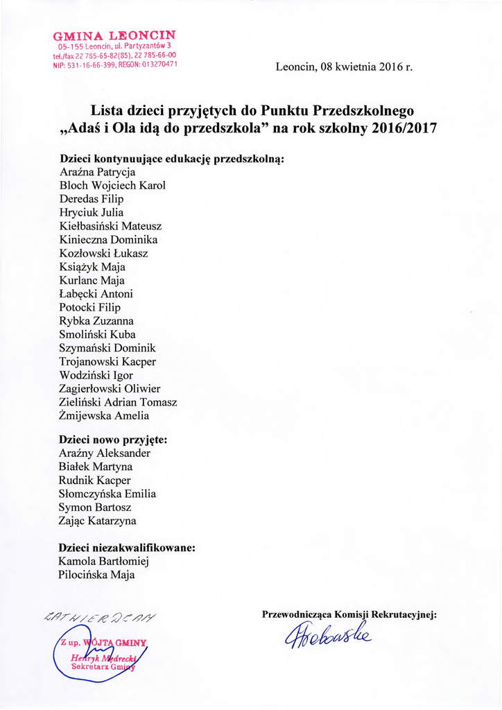 Lista dzieci przyjętych na rok szkolny 2016/2017