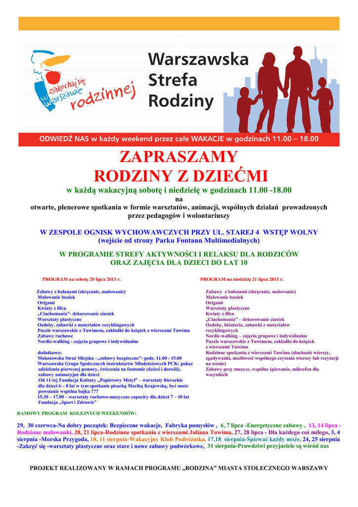 ZAPRASZAMY RODZINY Z DZIEĆMI w każdą wakacyjną sobotę i niedzielę w godzinach 11.00 -18.00 na otwarte, plenerowe spotkania w formie warsztatów, animacji, wspólnych działań prowadzonych przez pedagogów i wolontariuszy W ZESPOLE OGNISK WYCHOWAWCZYCH PRZY UL. STAREJ 4 WSTĘP WOLNY (wejście od strony Parku Fontann Multimedialnych) W PROGRAMIE STREFY AKTYWNOŚCI I RELAKSU DLA RODZICÓW ORAZ ZAJĘCIA DLA DZIECI DO LAT 10 PROGRAM na sobotę 20 lipca 2013 r. Zabawy z balonami (skręcanie, malowanie) Malowanie buziek Origami Kwiaty z filcu „Ciachomania”- dekorowanie ciastek Warsztaty plastyczne Ozdoby, zabawki z materiałów recyklingowych Puzzle warszawskie z Tuwimem, zakładki do książek z wierszami Tuwima Zabawy ruchowe Nordic-walking - zajęcia grupowe i indywidualne dodatkowo: Mokotowska Straż Miejska –„zabawy bezpieczne”- godz. 11.00 - 15.00 Warszawska Grupa Społecznych instruktorów Młodzieżowych PCK: pokaz udzielania pierwszej pomocy, ćwiczenia na fantomie (dzieci i dorośli), zabawy animacyjne dla dzieci Od 11-tej Fundacja Kultury „Papierowy Motyl” – warsztaty literackie dla dzieci 6 – 8 lat w tym spotkanie pisarką Mariką Krajewską, być może powstanie wspólna bajka ??? 15.30 – 17.00 – warsztaty ruchowo-muzyczne capoeiry dla dzieci 7 – 10 lat Fundacja „Sport i Zdrowie” PROGRAM na niedzielę 21 lipca 2013 r. Zabawy z balonami (skręcanie, malowanie) Malowanie buziek Origami Warsztaty plastyczne Kwiaty z filcu „Ciachomania” – dekorowanie ciastek Ozdoby, biżuteria, zabawki z materiałów recyklingowych Nordic-walking – zajęcia grupowe i indywidualne Puzzle warszawskie z Tuwimem, zakładki do książek z wierszami Tuwima Rodzinne spotkania z wierszami Tuwima (słuchanie wierszy, zgadywanki, możliwość wspólnego czytania wierszy lub recytacji na scenie) Zabawy przy muzyce, wspólne śpiewanie, mikrofon dla wszystkich RAMOWY PROGRAM KOLEJNYCH WEEKENDÓW: 29, 30 czerwca-Na dobry początek: Bezpieczne wakacje, Fabryka pomysłów , 6, 7 lipca -Energetyczne zabawy , 13, 14 lipca Rodzinne malowanki, 20, 21 lipca-Rodzinne spotkania z wierszami Juliana Tuwima, 27, 28 lipca - Dla każdego coś miłego, 3, 4 sierpnia -Morska Przygoda, 10, 11 sierpnia-Wakacyjny Klub Podróżnika, 17,18 sierpnia-Śpiewać każdy może, 24, 25 sierpnia -Zakręć się -warsztaty plastyczne oraz stare i nowe zabawy podwórkowe, 31 sierpnia-Prawdziwi przyjaciele są wśród nas PROJEKT REALIZOWANY W RAMACH PROGRAMU „RODZINA” MIASTA STOŁECZNEGO WARSZAWY