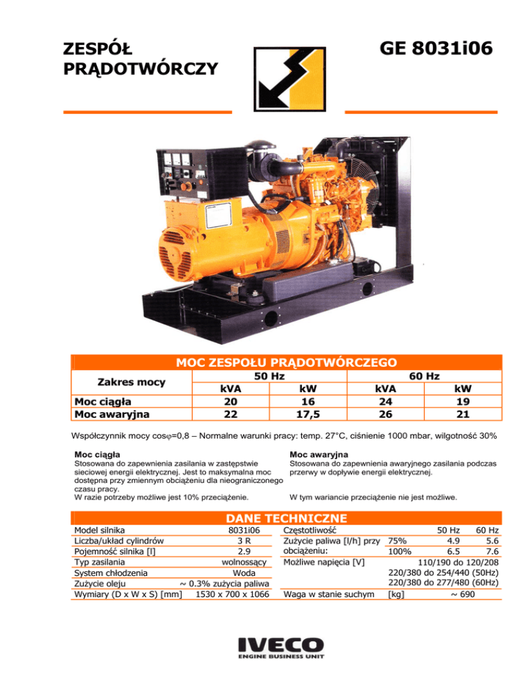 GE 8031i06 ZESPÓŁ PRĄDOTWÓRCZY MOC ZESPOŁU PRĄDOTWÓRCZEGO Zakres mocy Moc ciągła Moc awaryjna 50 Hz kVA 20 22 60 Hz kW 16 17,5 kVA 24 26 kW 19 21 Współczynnik mocy cosϕ=0,8 – Normalne warunki pracy: temp. 27°C, ciśnienie 1000 mbar, wilgotność 30% Moc ciągła Moc awaryjna Stosowana do zapewnienia zasilania w zastępstwie Stosowana do zapewnienia awaryjnego zasilania podczas sieciowej energii elektrycznej. Jest to maksymalna moc przerwy w dopływie energii elektrycznej. dostępna przy zmiennym obciążeniu dla nieograniczonego czasu pracy. W razie potrzeby możliwe jest 10% przeciążenie. W tym wariancie przeciążenie nie jest możliwe. DANE TECHNICZNE Model silnika 8031i06 Liczba/układ cylindrów 3R Pojemność silnika [l] 2.9 Typ zasilania wolnossący System chłodzenia Woda Zużycie oleju ~ 0.3% zużycia paliwa Wymiary (D x W x S) [mm] 1530 x 700 x 1066 Częstotliwość 50 Hz 60 Hz Zużycie paliwa [l/h] przy 75% 4.9 5.6 obciążeniu: 100% 6.5 7.6 Możliwe napięcia [V] 110/190 do 120/208 220/380 do 254/440 (50Hz) 220/380 do 277/480 (60Hz) Waga w stanie suchym [kg] ~ 690 STANDARDOWA KOMPLETACJA ZESPOŁU PRĄDOTWÓRCZEGO 1. Silnik IVECO przeznaczony do pracy ciągłej 1.1.Regulator obrotów Mechaniczny, zgodny z normą ISO 8528, klasa G2 2. Układ chłodzenia Zespół jest wyposażony w chłodnicę powietrza z wentylatorem umożliwiającym pracę w klimacie tropikalnym. Chłodnica zamontowana jest na ramie agregatu. Jest wyizolowana od drgań silnika oraz w odpowiedni sposób zabezpieczona przed przypadkowym uszkodzeniem 3. Filtry Silnik jest wyposażony w suchy filtr powietrza, filtr paliwa i oleju. Wszystkie wkłady filtrujące są wymienne 4. Układ wydechowy W przemysłowych zastosowaniach tłumik układu wydechowego dostarczany jest na zamówienie i montowany na agregacie 5. Układ elektryczny Układ 12 [V] wraz z alternatorem i rozrusznikiem. Podstawa pod akumulatory zamontowana w ramie agregatu. Na zamówienie akumulatory bezkwasowe 6. Generator Jednołożyskowalna prądnica synchroniczna, czterobiegunowa, stopień ochrony IP21 klasa izolacji H. Standardowe połączenie: 12 końcówek – 9 żyłowe przewody. Zabezpieczenie przed pracą w wysokich temperaturach, na zamówienie ochrona przed korozją i pracą środowiskach wilgotnych. Wszystkie prądnice wyposażone są w elektroniczny regulator obrotów 7. Elementy zabudowy 7.1. Rama Kompletny zespół prądotwórczy umieszczony jest w nowocześnie zaprojektowanej ramie wykonanej z wysokiej jakości stali. Rama jest zabezpieczona farba antykorozyjną i wykonana bez użycia spawów. W niej znajduje się zbiornik paliwa i akumulatory. Silnik połączony z generatorem usytuowane są na antywibracyjnych poduszkach zapewniających izolację od drgań wywołanych przez elementy wirujące 7.2. Połączenie Silnik jest połączony bezpośrednio z prądnicą. Koło zamachowe silnika jest połączone z prądnicą za pomocą elastycznego łącznika. 8. System paliwowy Urządzenie wyposażone jest w wykonany z tworzywa sztucznego zbiornik paliwa o pojemności 80 [l] Zbiornik umieszczony jest w ramie. Istnieje możliwość wzrokowego odczytu poziomu paliwa. Większy 500 [l] zbiornik jest przewidziany jako opcja. 9. Panel sterowania Ręczne lub automatyczne, dostępne w różnych konfiguracjach. 10. Opcje Zespół prądotwórczy może być dostarczony z różnymi dodatkowymi elementami wyposażenia zgodnie z zapotrzebowaniem klienta 11. Dokumentacja Cała dokumentacja technicznoruchowa dostarczana jest z każdym agregatem 12. Testy fabryczne Każdy agregat jest sprawdzony przed dostarczeniem do klienta. 13. Standardy jakości Wszystkie zespoły prądotwórcze spełniają następujące normy: 73/23/CE, 89/392/EE, 89/336/CE, ISO 8528, IEC 34.1. Generatory stosowane w naszych zespołach spełniają: ISO 8528, IEC34.1, CEI 2.3, VDE 0530, BS 4999-5000, NF 51-100. Wszystkie zespoły wyciszone spełniają dyrektywę 84/563 CE odnośnie emisji hałasu. Wszystkie wyroby VECO AIFO i 2HE spełniają normę ISO 9001 14. Gwarancja Standardowy okres gwarancji wynosi 12 miesięcy. Istnieje możliwość wydłużenia tego okresu po spełnieniu pewnych warunków