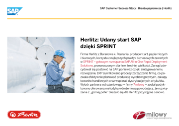 SAP Customer Success Story | Branża papiernicza | Herlitz Herlitz: Udany start SAP dzięki SPRINT Firma Herlitz z Baranowa k. Poznania, producent art. papierniczych i biurowych, korzysta z najlepszych praktyk biznesowych zawartych w SPRINT – gotowym rozwiązaniu SAP All-in-One Rapid Deployment Solutions, przeznaczonym dla firm średniej wielkości. Zarząd zdecydował się postawić na SAP, ponieważ dzięki zintegrowanemu rozwiązaniu ERP zunifikowano procesy zarządzania firmą, co pozwala efektywnie planować produkcję wyrobów gotowych, zakupy towarów handlowych oraz wspierać dystrybucję tych artykułów. Wybór partnera wdrożeniowego – firmy 7milowy – został podyktowany oferowaną metodyką wdrożeniową powodującą, że rozwiązanie z „górnej półki” okazało się dla Herlitz przystępne cenowo. SAP Customer Success Story | Branża papiernicza | Herlitz Herlitz zintegrował zarządzanie dzięki SAP RDS Gotowe rozwiązania SAP dostępne dla firm średniej wielkości Opis firmy •• Herlitz Sp. z o.o. to część międzynarodowej grupy, lidera na rynku artykułów papierniczych i biurowych. Zakład w Baranowie k. Poznania produkuje i dystrybuuje ponad 6 tys. artykułów (zeszyty, bruliony, notatniki, segregatory, karty okolicznościowe) •• Przed wdrożeniem SAP firma posiadała rozproszone środowisko IT (system Baan wspomagający zarządzanie produkcją oraz własny system dedykowany wspomagający zarządzanie sprzedażą i magazynem) •• Istniała potrzeba wsparcia wszystkich procesów biznesowych firmy (produkcja, zakupy, sprzedaż, procesy magazynowe, finanse, controlling, planowanie) w ramach jednego systemu IT Co zdecydowało o wyborze rozwiązań SAP? •• Ocena zarządu firma Herlitz, według której z dostępnych na rynku rozwiązań tylko SAP gwarantuje kompleksowe zarządzanie przedsiębiorstwem oraz dobrze wspiera obsługę wszystkich kluczowych procesów biznesowych •• Możliwość skorzystania z gotowych praktyk zawartych w SAP All-in-One Rapid Deployment Solutions (wstępnie zamodelowane procesy biznesowe, bez konieczności wdrożenia „od podstaw”) •• Szeroki zakres projektu: finanse, controling, sprzedaż i dystrybucja, gospodarka materiałowa i zaopatrzenie, planowanie produkcji Co zdecydowało o wyborze firmy 7milowy? •• SPRINT - oferowane przez firmę 7milowy gotowe rozwiązanie SAP All-in-One Rapid Deployment Solutions, dostępne cenowo dla firm średniej wielkości •• Bezpieczeństwo wdrożenia - sprawdzona metodyka wdrożeniowa i doświadczenie 7milowego •• Możliwość skorzystania z kompleksowego wsparcia po zakończonym wdrożeniu SAP (od wsparcia aplikacyjnego użytkowników po wsparcie techniczne, z opcją pełnego outsourcingu) Korzyści •• Unifikacja i zintegrowanie firmy - jednolite procedury i organizacja pracy wpływają na wyższą wydajność i efektywność •• Możliwość szybkiego wykrywania nieprawidłowości (np. nieprawidłowości w funkcjonowaniu procesów planistycznych wykrywane podczas generowania raportów) •• Oszczędność czasu i pracy podczas wdrażania systemu dzięki realizacji projektu w oparciu o doświadczenia 7milowego z poprzednich wdrożeń “Na pewno dla firmy średniej wielkości, jaką jest Herlitz, jest to bardzo dobre rozwiązanie, bo nie siadamy do „pustej kartki”, co ma miejsce w przypadku wdrożenia SAP metodą klasyczną. Równie ważne jest to, że metodyka SPRINT pozwoliła ograniczyć zaangażowanie czasowe pracowników w prace związane z wdrożeniem systemu. U nas ludzie, którzy brali udział we wdrożeniu, wykonywali swoje normalne obowiązki zawodowe, które zajmują im cały etat pracy. Mimo tego - byli w stanie z sukcesem wdrożyć system, co jest dużą zaletą wdrożenia metodą SPRINT.” Dominik Zakrzewski, Kierownik Działu Informatyki, Herlitz Nazwa firmy Herlitz Sp. z o.o. Lokalizacja Baranowo k. Poznania, Polska Branża Papiernicza Produkty/ Usługi Artykuły papiernicze i biurowe Zatrudnienie/ Obroty 200 / 73 mln zł Strona internetowa www.herlitz.pl Partner 7milowy www.7milowy.pl