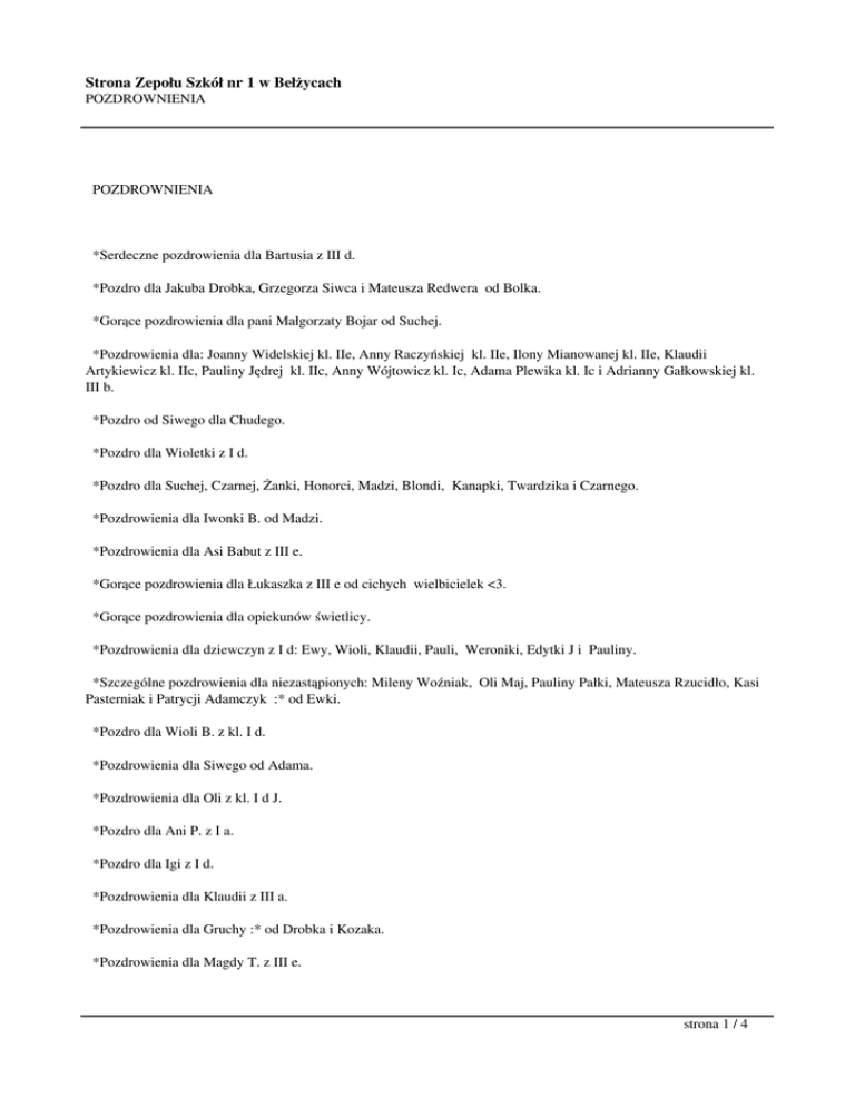 Strona Zepołu Szkół nr 1 w Bełżycach POZDROWNIENIA POZDROWNIENIA *Serdeczne pozdrowienia dla Bartusia z III d. *Pozdro dla Jakuba Drobka, Grzegorza Siwca i Mateusza Redwera od Bolka. *Gorące pozdrowienia dla pani Małgorzaty Bojar od Suchej. *Pozdrowienia dla: Joanny Widelskiej kl. IIe, Anny Raczyńskiej kl. IIe, Ilony Mianowanej kl. IIe, Klaudii Artykiewicz kl. IIc, Pauliny Jędrej kl. IIc, Anny Wójtowicz kl. Ic, Adama Plewika kl. Ic i Adrianny Gałkowskiej kl. III b. *Pozdro od Siwego dla Chudego. *Pozdro dla Wioletki z I d. *Pozdro dla Suchej, Czarnej, Żanki, Honorci, Madzi, Blondi, Kanapki, Twardzika i Czarnego. *Pozdrowienia dla Iwonki B. od Madzi. *Pozdrowienia dla Asi Babut z III e. *Gorące pozdrowienia dla Łukaszka z III e od cichych wielbicielek <3. *Gorące pozdrowienia dla opiekunów świetlicy. *Pozdrowienia dla dziewczyn z I d: Ewy, Wioli, Klaudii, Pauli, Weroniki, Edytki J i Pauliny. *Szczególne pozdrowienia dla niezastąpionych: Mileny Woźniak, Oli Maj, Pauliny Pałki, Mateusza Rzucidło, Kasi Pasterniak i Patrycji Adamczyk :* od Ewki. *Pozdro dla Wioli B. z kl. I d. *Pozdrowienia dla Siwego od Adama. *Pozdrowienia dla Oli z kl. I d J. *Pozdro dla Ani P. z I a. *Pozdro dla Igi z I d. *Pozdrowienia dla Klaudii z III a. *Pozdrowienia dla Gruchy :* od Drobka i Kozaka. *Pozdrowienia dla Magdy T. z III e. strona 1 / 4 Strona Zepołu Szkół nr 1 w Bełżycach POZDROWNIENIA *Pozdro dla kl. I d. *Gorące pozdrowienia dla najlepszej kl. II c :* od Klaudii i Pauli J. *Serdeczne pozdrowienia dla Justyny Ć. Z kl. I a K. *Serdeczne pozdrowienia dla Ewci M. z I d. *Pozdrowionka dla dziewczyn z III e oraz dla naj-koleżanki z ławki od Klaudynka Gotyckiego. *Pozdrowienia dla Bartosza z kl. II c J. *Pozdrowienia dla: Karoliny Kucaby kl. II e, Mateusza Goliszka i Jakuba Torunia z kl. III b, Mileny Sokołowskiej z kl. I a, Adama Wieczorkiewicza z kl. III d i Łukasza Matyska z kl. II e. *Pozdrowienia dla Mileny i Kasi z III d oraz dla mega dziewczyn z II e ! *Dla Was ;* Kochamy Was wariatki ! J Bombowym dziewczynom z kl. II c A&I J. *Pozdrowienia dla Piotrusia B. vel. Barbie od Dorotki B. Love ya ! ;p. *Serdeczne pozdrowienia dla Anety Z. z kl. I c od K. *Pozdrowienia dla Ani W. z III e. *PosTrAfiAmY NaSzOm KoFFaNoM DoruśŚ. <3^ xD ;] cOoL^^ ;dd od Tffoich FrieNdówW <3. *Serdeczne pozdrowienia dla pana Zbigniewa Dygusia od kl. III e. *Pozdro dla Izki z I d. *Pozdrowienia dla Szwajcara ;* od Doruś B. <3 ^^. *Gorące pozdrowienia dla Grzesia i Adasia z III e od Cichych Wielbicielek. *Pozdro dla Szwajcara od tajemniczej fanki Biebera J. *Pozdro dla ks. Tomasza Niedziałka od kl. III e. *Pozdrawiam Cię Iwonko z kl. III d. K.C. *Pozdro dla Klaudii z I d. *Pozdro dla Weroniki B z kl. I d. *Pozdrowienia dla całej kl. II e! · Pozdrowienia dla: Agaty, Ani i Ilony z kl. II e ! – Asia · Pozdrowienia dla: Klaudii, Ani, Pauliny i Moniki z kl. II c ! – Asia. strona 2 / 4 Strona Zepołu Szkół nr 1 w Bełżycach POZDROWNIENIA *Serdeczne pozdrowienia dla uroczej i ładniej koleżanki Martyny Ruty z kl. III b Gim. od anonimowego i zauroczonego wielbiciela z 2 gim. PS. Bardzo mi się podobasz. Nie wiem jak Ci to powiedzieć <3. *Pozdrowienia dla całego PUP od HARDCORA. *Pozdrowienia dla Klaudii O. z I d. *Pozdrowienia dla Piotrusia B. od Reni ^^ Love. *Pozdrowienia dla Malibu od Reni ^^. *Pozdro dla Maciusia z Id. *Pozdrawiam Adę Gałkowską :*. *Pozdrowienia dla Magdaleny Twardzik z kl. III e od Cichego Wielbiciela. *Pozdrowienia dla Paulinki od Madzi i Asi. *Pozdrowienia dla Rudego Romana od Kozaka, Gruchy i Drobka. *Pozdro dla Agnieszki B. z kl. III c. *Pozdro dla Izy z I d. *Pozdro dla Ewuśki z I d. *Pozdro dla Dacha od Doroty Bartoszcze :*. *Pozdro dla Oli z I d. *Pozdro dla Igi Ł. z kl. I d. *Pozdro dla Izki Sz. z I d. *Pozdrowienia od Szwajcara dla Dacha. *Pozdrowienia dla Małego, Bomby i reszty muffiarzy. *Pozdro dla Magdy T. od Siwego i Chudego JJ. *Pozdrowienia dla Ani, Aśki, Agaty i Ilki z II e od Ani i Moniki :D. *Pozdrowionka dla Klaudii i Pauliny z II c od Ani i Moniki :*. *Pozdro dla Gosi z I c. *Pozdro dla Klaudii O z I d. *Gorące pozdrowienia dla najfajniejszego nauczyciela w szkole pana Marka Chemperka od dziewczyn z kl. II c J. strona 3 / 4 Strona Zepołu Szkół nr 1 w Bełżycach POZDROWNIENIA *Pozdro dla Remka, Jaja, Dondiego i Sobola od Anki i Klaudii :D. *Pozdrowionka dla pani Eweliny Gajowiak i dla pani Moniki Plewik od Ani i Ani :D. *Pozdrowienia dla Igi Ł. z I d. *Pozdrowienia dla Paulinki z III e. *Pozdro dla klasy III e i wychowawcy Tomasza Minika. *Serdeczne pozdrowienia dla wszystkich nauczycieli z gimnazjum od klasy III e. *Pozdrowienia dla całej klasy III b w szczególności dla: Małego, Leona, Łysego, Dziunia, Susiego, Młodego i Jujunia. Pozdrawiamy również naszego najserdeczniejszego przyjaciela Grubego Pączka (II a). *Serdeczne pozdro dla cudownej pani Ewelinki Gajowiak ! :* D, P, K J. *Pozdro dla moich ziomków kochanych! Paulinki, Dacha, Ewki, Patki, Mileny, Dorotki i Sobola! :*:* Darek xD. *Gorące pozdrowienia dla kochanej pani Ani Wójtowicz! J Daria i Paulina :*. *Dla Kurczaka od Klaudii ;] Kocham cie! ;* *Pozdrowienia dla Piotrusia i Kubusia z II e od Kamilci :* *Buziaczki dla Klaudusi i Paulinki z II c oraz Ani i Ilonki z II e od Karoliny J strona 4 / 4