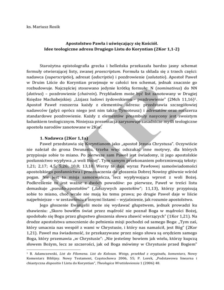 ks. Mariusz Rosik Apostolstwo Pawła i uświęcający się Kościół. Idee teologiczne adresu Drugiego Listu do Koryntian (2Kor 1,1-‐2) Starożytna epistolografia grecka i helleńska przekazała bardzo jasny schemat formuły otwierającej listy, zwanej praescriptum. Formuła ta składa się z trzech części: nadawca (superscriptio), adresat (adscriptio) i pozdrowienie (salutatio). Apostoł Paweł w Druim Liście do Koryntian przejmuje w całości ten schemat, jednak znacznie go rozbudowuje. Najczęściej stosowano jedynie krótką formułę: N (nominativus) do NN (dativus) – pozdrowienie (chairein). Przykładem może być list zanotowany w Drugiej Księdze Machabejskiej: „Lizjasz ludowi żydowskiemu -‐ pozdrowienie” (2Mch 11,16)1. Apostoł Paweł rozszerza każdy z elementów adresu: przedstawia szczegółowiej nadawców (gdyż oprócz niego jest nim także Tymoteusz) i adresatów oraz rozszerza standardowe pozdrowienie. Każdy z elementów preambuły nasycony jest swoistym ładunkiem teologicznym. Niniejsza prezentacja zarysowuje zasadnicze myśli teologiczne apostoła narodów zanotowane w 2Kor. 1. Nadawca (2Kor 1,1a) Paweł przedstawia się Koryntianom jako „apostoł Jezusa Chrystusa”. Oczywiście nie należał do grona Dwunastu, trzeba więc odszukać inne motywy, dla których przypisuje sobie to miano. Po pierwsze sam Paweł jest świadomy, iż jego apostolskie posłannictwo wypływa „z woli Bożej”. Tym samym przekonaniem pobrzmiewają teksty: 1,21; 2,17; 4,5; 5,20; 10,8; 13,10. Wersy te dają wyraz Pawłowej samoświadomości apostolskiego posłannictwa i przeznaczenia do głoszenia Dobrej Nowiny głównie wśród pogan. Nie jest to misja samozwańcza, lecz wypływająca wprost z woli Bożej. Podkreślenie to jest ważne z dwóch powodów: po pierwsze, Paweł w treści listu demaskuje „pseudo-‐apostołów” („fałszywych apostołów”; 11,13), którzy przypisują sobie to miano, choć wcale nie mają ku temu prawa; po drugie Paweł daje w liście najpełniejsze – w zestawieniu z innymi listami – wyjaśnienie, jak rozumie apostolstwo. Jego głoszenie Ewangelii może się wydawać głupstwem, jednak prowadzi ku zbawieniu: „Skoro bowiem świat przez mądrość nie poznał Boga w mądrości Bożej, spodobało się Bogu przez głupstwo głoszenia słowa zbawić wierzących” (1Kor 1,21). Na drodze apostolstwa umocnienie do pełnienia misji pochodzi od samego Boga: „Tym zaś, który umacnia nas wespół z wami w Chrystusie, i który nas namaścił, jest Bóg” (2Kor 1,21). Paweł ma świadomość, że przekazywane przez niego słowa są orędziem samego Boga, który przemawia „w Chrystusie”: „Nie jesteśmy bowiem jak wielu, którzy kupczą słowem Bożym, lecz ze szczerości, jak od Boga mówimy w Chrystusie przed Bogiem” 1 B. Adamczewski, List do Filomena. List do Kolosan. Wstęp, przekład z oryginału, komentarz, Nowy Komentarz Biblijny. Nowy Testament, Częstochowa 2006, 55; P. Lorek, „Podstawowa linearna i chiastyczna dispositio I Listu do Koryntian”, Theologica Wratislaviensia 1 (2006) 48. (2Kor 2,17). To bowiem sam Chrystus jest przedmiotem przepowiadania: „Nie głosimy bowiem siebie samych, lecz Chrystusa Jezusa jako Pana, a nas -‐ jako sługi wasze przez Jezusa” (2Kor 4,5). Apostoł pełni swoistą „władzę” nad tymi, którym głosi Dobrą Nowinę: „Choćby mi bowiem wypadło jeszcze bardziej chlubić się z władzy jaką nam dał Pan ku zbudowaniu, a nie ku zagładzie waszej, nie będę się wstydził” (2Kor 1,8). Tym samym echem pobrzmiewa 2Kor 13,10: „Dlatego też jako nieobecny tak piszę, abym jako obecny wśród was nie musiał postępować surowiej -‐ według władzy, którą mi dał Pan ku zbudowaniu, a nie ku zgubie waszej”. Drugim nadawcą listu jest Tymoteusz. Określony został przez Pawła jako „brat”. Termin ten występuje także w 1Tes 3,2 i Kol 1,1 (por. „moje umiłowane i wierne dziecko/syn” w 1Kor 4,17 i „syn” w Fil 2,22)2. Paweł spotkał po raz pierwszy Tymoteusza w Listrze, podczas swej drugiej podróży misyjnej (Dz 16,1). Tymoteusz pochodził z rodziny pogańsko – żydowskiej (Żydówką była matka Eunice; 2Tm 1,5). Z czasem stał się jednym z najważniejszych współpracowników Pawła. Podróżował z nim przez Azję Mniejszą i Macedonię (Dz 17,14); ponownie spotkał się z Pawłem w Atenach (Dz 18,5); został wysłany do Tesaloniki 1Tes 3,1-‐2). Towarzyszył Pawłowi także podczas trzeciej podróży. Gdy postaje 2Kor, Tymoteusz jest na nowo z Pawłem w Macedonii (2,12; 8,5; 9,2; Dz 20,1)3. Cieszył się urzędem ewangelisty (2Tm 4,5), który został mu wyznaczony za sprawą proroctwa (1Tm 118). Nie uchodził więc, jak Paweł, za apostoła. 2. Adresat (2Kor 1,2a) 2Kor skierowany jest „do kościoła Bożego, który jest w Koryncie”. Termin „kościół” pojawia się w tym piśmie 11 razy, za każdym razem wskazując na lokalną społeczność wierzących w Chrystusa; w 11,28 ma wymiar bardziej powszechny, gdyż mowa jest o „wszystkich kościołach”. Fraza „kościół Boży, który jest w” winna być rozumiana jako wskazanie na jedną konkretną wspólnotę, która jest manifestacją Kościoła powszechnego w danym mieście. Cały Kościół Chrystusowy przejawia w konkretnym mieście swą obecność właśnie w tej wspólnocie. Zamiast więc o Kościele korynckim winno się mówić o Kościele Bożym, który gromadzi się również w Koryncie. Adresatami listu są „wszyscy święci, którzy są w całej Achai”. Chrześcijanom przypisuje się miano „świętych”. Korzeni tego określenia szukać należy w Starym Testamencie, gdzie przymiotnik kadosz, tłumaczony w LXX jako „święty”, w pierwszym znaczeniu wskazuje na ideę oddzielenia czy separacji. Pojęcie świętości w rozumieniu judaizmu łączy w sobie ideę doskonałości i całkowitej odmienności, inności czy -‐ mówiąc językiem filozoficznym – transcendencji. Inność ta