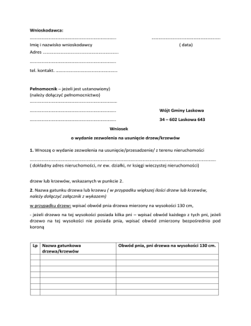 Wnioskodawca: ……………………………………………………………….. ………………………………………………….. Imię i nazwisko wnioskodawcy ( data) Adres ……………………………………………………….. ……………………………………………………………….. tel. kontakt. …………………………………………….. Pełnomocnik – jeżeli jest ustanowiony) (należy dołączyć pełnomocnictwo) ………………………………………………………………… ……………………………………………………………….. Wójt Gminy Laskowa ……………………………………………………………….. 34 – 602 Laskowa 643 Wniosek o wydanie zezwolenia na usunięcie drzew/krzewów 1. Wnoszę o wydanie zezwolenia na usunięcie/przesadzenie/ z terenu nieruchomości ……………………………………………………………………………………………………………………………………………. ( dokładny adres nieruchomości, nr ew. działki, nr księgi wieczystej nieruchomości) drzew lub krzewów, wskazanych w punkcie 2. 2. Nazwa gatunku drzewa lub krzewu ( w przypadku większej ilości drzew lub krzewów, należy dołączyć załącznik z wykazem) w przypadku drzew: wpisać obwód pnia drzewa mierzony na wysokości 130 cm, - jeżeli drzewo na tej wysokości posiada kilka pni – wpisać obwód każdego z tych pni, jeżeli drzewo na tej wysokości nie posiada pnia, wpisać obwód zmierzony bezpośrednio pod koroną Lp Nazwa gatunkowa drzewa/krzewów Obwód pnia, pni drzewa na wysokości 130 cm. 3. Wielkość powierzchni z której zostaną usunięte krzewy (w m kwadratowych)………………….. 4. Przyczyna zamierzonego usunięcia drzewa lub krzewu: …………………………………………………………………………………………………………………………………………… ……………………………………………………………………………………………………………………………………………. ……………………………………………………………………………………………………………………………………………… ……………………………………………………………………………………………………………………………………………… …………………………………………………………………………………………………………………………………………….. 5. Wskazanie, czy zamierzone usunięcie drzewa lub krzewu wynika z celu związanego z prowadzeniem działalności gospodarczej: TAK NIE (właściwe podkreślić) 6. Termin zamierzonego usunięcia drzewa lub krzewu ( dzień-miesiąc-rok) do dnia ………………………………………… 7. Oświadczam, że wnioskodawca planuje/nie planuje (właściwe podkreślić) wykonanie nasadzeń zastępczych. ................................................................................... ( czytelny podpis wnioskodawcy) Do wniosku załączam: ( właściwy pkt. zakreślić) W przypadku gdy posiadacz gruntu nie jest właścicielem 1. – pisemna zgoda właściciela nieruchomości nie dotyczy właściciela nieruchomości, użytkownika wieczystego nieruchomości spółdzielni mieszkaniowych, wspólnot mieszkaniowych ( w których właściciele lokali powierzyli zarząd nieruchomością wspólną zarządowi), zarządców nieruchomości będących własnością Skarbu Państwa oraz posiadaczy nieruchomości o nieuregulowanym stanie prawnym, niebędących żadnym z wyżej wymienionych podmiotów; Jeżeli w księdze wieczystej nie figuruje aktualny właściciel (właściciele) gruntu - postanowienie sadu o nabycie prawa do spadku, - akt notarialny o przyjęciu spadku, - akt notarialny dotyczący kupna lub darowizny gruntu - dokument potwierdzający zmianę nazwiska. 2. zgodę /y pozostałych współwłaścicieli nieruchomości (w przypadku współwłasności); 3. oświadczenie o udostepnieniu informacji o zamiarze złożenia wniosku o wydanie zezwolenia na usunięcie drzewa lub krzewu (dotyczy spółdzielni mieszkaniowych i wspólnot mieszkaniowych); 4. załącznik graficzny określający usytuowanie drzewa lub krzewu w odniesieniu do granic nieruchomości i obiektów budowlanych istniejących lub projektowanych na tej nieruchomości: - rysunek lub mapę, albo - projekt zagospodarowania działki lub terenu, wykonany przez projektanta posiadającego odpowiednie uprawnienia budowlane ( w przypadku realizacji inwestycji, dla której jest on wymagany zgodnie z ustawą z dnia 7 lipca 1994 r. – Prawo budowlane) określające usytuowanie drzewa lub krzewu w odniesieniu do granic nieruchomości i obiektów budowlanych istniejących lub projektowanych na tej nieruchomości; 5. projekt planu nasadzeń zastępczych (jeżeli są planowane), rozumianych jako posadzenie drzew lub krzewów lub o powierzchni nie mniejszej niż powierzchnia usuwanych krzewów, stanowiących kompensacje przyrodniczą za usuwane drzewa lub krzewy w rozumieniu art. 3 pkt.8 ustawy z dnia 27 kwietnia 2001 Prawo ochrony środowiska, lubprzesadzenia drzewa lub krzewu (jeżeli jest planowane), wykonany w formie rysunku, mapy lub projektu zagospodarowania działki lub terenu, oraz informację o liczbie, gatunku lub odmianie drzew lub krzewow oraz miejscu i planowanym terminie ich wykonania; 6. Zezwolenie w stosunku do gatunków chronionych na czynności podlegające zakazom określonym w art. 51 ust. 1 pkt. 1-4 i 10 oraz w art. 52 ust. 1 pkt. 1, 3. 7, 8, 12, 13, i 15 ustawy o ochronie przyrody, jeżeli zostało wydane; 7. decyzje o środowiskowych uwarunkowaniach albo postanowienie w sprawie uzgodnienia warunków realizacji przedsięwzięcia w zakresie oddziaływania na obszar Natura 2000, w przypadku realizacji przedsięwzięcia, dla którego wymagan