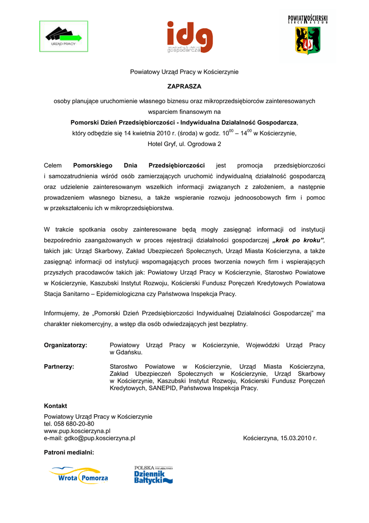 Powiatowy Urząd Pracy w Kościerzynie ZAPRASZA osoby planujące uruchomienie własnego biznesu oraz mikroprzedsiębiorców zainteresowanych wsparciem finansowym na Pomorski Dzień Przedsiębiorczości - Indywidualna Działalność Gospodarcza, 00 00 który odbędzie się 14 kwietnia 2010 r. (środa) w godz. 10 – 14 w Kościerzynie, Hotel Gryf, ul. Ogrodowa 2 Celem Pomorskiego Dnia Przedsiębiorczości jest promocja przedsiębiorczości i samozatrudnienia wśród osób zamierzających uruchomić indywidualną działalność gospodarczą oraz udzielenie zainteresowanym wszelkich informacji związanych z założeniem, a następnie prowadzeniem własnego biznesu, a także wspieranie rozwoju jednoosobowych firm i pomoc w przekształceniu ich w mikroprzedsiębiorstwa. W trakcie spotkania osoby zainteresowane będą mogły zasięgnąć informacji od instytucji bezpośrednio zaangażowanych w proces rejestracji działalności gospodarczej „krok po kroku”, takich jak: Urząd Skarbowy, Zakład Ubezpieczeń Społecznych, Urząd Miasta Kościerzyna, a także zasięgnąć informacji od instytucji wspomagających proces tworzenia nowych firm i wspierających przyszłych pracodawców takich jak: Powiatowy Urząd Pracy w Kościerzynie, Starostwo Powiatowe w Kościerzynie, Kaszubski Instytut Rozwoju, Kościerski Fundusz Poręczeń Kredytowych Powiatowa Stacja Sanitarno – Epidemiologiczna czy Państwowa Inspekcja Pracy. Informujemy, że „Pomorski Dzień Przedsiębiorczości Indywidualnej Działalności Gospodarczej” ma charakter niekomercyjny, a wstęp dla osób odwiedzających jest bezpłatny. Organizatorzy: Powiatowy Urząd w Gdańsku. Pracy w Kościerzynie, Wojewódzki Urząd Pracy Partnerzy: Starostwo Powiatowe w Kościerzynie, Urząd Miasta Kościerzyna, Zakład Ubezpieczeń Społecznych w Kościerzynie, Urząd Skarbowy w Kościerzynie, Kaszubski Instytut Rozwoju, Kościerski Fundusz Poręczeń Kredytowych, SANEPID, Państwowa Inspekcja Pracy. Kontakt Powiatowy Urząd Pracy w Kościerzynie tel. 058 680-20-80 www.pup.koscierzyna.pl e-mail: [email protected] Patroni medialni: Kościerzyna, 15.03.2010 r.