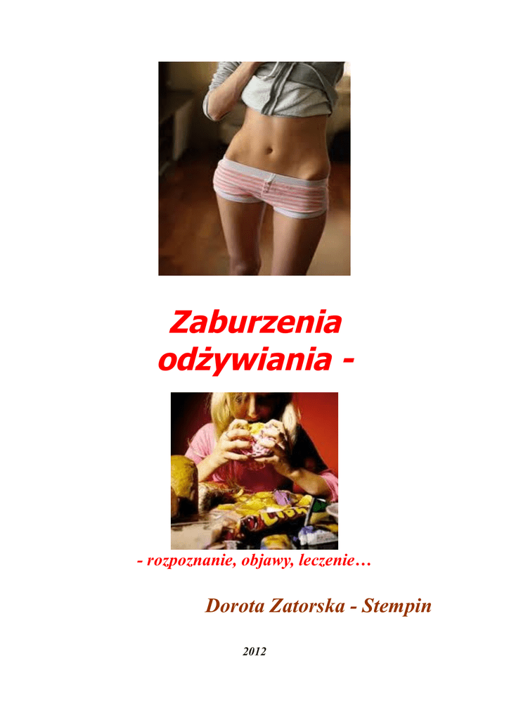 Zaburzenia odżywiania - - rozpoznanie, objawy, leczenie… Dorota Zatorska - Stempin 2012 1 „Zaburzenia odżywiania - objawy, rozpoznanie, leczenie…” " Ciało ma znaczenie, ale kiedy dochodzimy do tego, co u podłoża naszej obsesji na punkcie wagi, okazuje się, że kobieta obsesyjna na punkcie swego ciała jest także obsesyjna w odniesieniu do życia emocjonalnego. Przez troskę o ciało wyraża poważny niepokój o stan duszy" (Kim Chernin :„Obsesja refleksje nad tyranią szczupłości„) Dorota Zatorska - Stempin 2012 2 Zaburzenia odżywiania Zaburzenia łaknienia mają swoje korzenie we wczesnych doświadczeniach osoby chorej nabytych w rodzinie i prawie zawsze ujawniają się w okresie dojrzewania płciowego. Okres ten jest szczególnie ważny dla dziewcząt, którym w procesie wychowania pozostawia się zbyt mało samodzielności. Dążeniem ich jest uwolnienie się od rodziny i odnalezienie się w roli kobiecej. Często uwaga ich koncentruje się na lansowaniu wyidealizowanym wzorcu szczupłej sylwetki. Osoby chore na anoreksję to mistrzynie kamuflażu, dlatego aby rozpoznać chorobę, wymagana jest umiejętność czytania różnych form komunikatów niewerbalnych. Wczesne zauważenie niepokojących objawów, dziwnych zachowań związanych z jedzeniem, wymaga od wielu specjalistów umiejętnego odczytywania tych sygnałów. Ważne jest, aby opiekunowie tych chorych potrafili rozpoznać już we wczesnym stadium chorobę. Jednym z kryteriów pomocnych w określaniu prawidłowej masy ciała, należnej dla określonego wieku, wzrostu płci są stosowane różne metody obliczeń wagi. Najczęściej stosowane jest obliczanie tzw. BMI (Body Mass Index- indeks wagi ciała). Tym wskaźnikiem posługują się lekarze, psycholodzy, pielęgniarki w diagnozowaniu chorób związanych z zaburzeniami odżywiania. BMI oblicza się według prostego wzoru : wagę ciała w kg dzielimy przez wzrost w m2. wyniszczenie Poniżej 15 poważna niedowaga 15,0 - 16,9 niedowaga 17,0 - 18,9 waga prawidłowa 19,0 - 24,9 3 ANOREKSJA NERVOSA Przez pojęcie anoreksja rozumie się uwarunkowane przyczynami psychicznymi odmawianie jedzenia, co w konsekwencji prowadzi do ekstremalnej utraty wagi. Takiemu zachowaniu towarzyszy paniczny strach przed utyciem. Na tę chorobę zapadają najczęściej dziewczęta i młode kobiety (na 100 chorych dziewcząt przypada 4-5 chłopców). Kobiety cierpiące na jadłowstręt psychiczny podświadomie usiłują poprzez swoją chudość odłączyć się od matki, a pośrednio od swojej kobiecości. Atrybuty kobiecego wyglądu: biust, biodra, pośladki, uda są ofiarą poświęcaną żądzy odchudzenia się. Występujący wtórnie brak miesiączki jest traktowany jak dodatkowe zwycięstwo w walce o pozostanie wychudzoną dziewczynką, która jeszcze nie miesiączkuje. Także panowanie nad głodem jest odbierane jako zdobycie nowej sfery niezależności. U chłopców cierpiących na tą chorobę, na pierwszy plan wysuwa się nie tylko problem identyfikacji płciowej, co dążenie do niezależności i wyobcowania. Anoreksja jest chorobą, która wymaga długotrwałego okresu leczenia. Nie jest to leczenie łatwe. Leczenie zaburzeń odżywiania jest złożonym procesem, gdzie ważną rolę odgrywa wielu specjalistów. W pierwszej jednak kolejności ważne jest, żeby osoba chora chciała się wyleczyć. W leczeniu powinni brać udział: internista, psychiatra, psychoterapeuta, dietetyk. Jeżeli osoba chora trafi na oddział szpitalny to również biorą udział pozostali członkowie zespołu terapeutycznego: pielęgniarka, terapeuta zajęciowy, rehabilitanci... Anoreksja, dieta, bulimia, zaburzenia odżywiania, dieta, rodzina, szczupłość, wyniszczenie, otyłość, Ana, wilczy głód, depresja, zaburzenia, terapia, anoreksja , łaknienie, hormony, lęki, obawy, rodzina, obawa, wyniszczenie Anoreksja, bulimia, zaburzenia odżywiania, dieta, szczupłość, wyniszczenie, otyłość, wilczy głód, depresja, zaburzenia, terapia, anoreksja , łaknienie, hormony, lęki, obawy, rodzina, Anoreksja, dieta, bulimia, zaburzenia odżywiania, dieta, rodzina, szczupłość, wyniszczenie, otyłość, Ana, wilczy głód, depresja, zaburzenia, terapia, anoreksja , łaknienie, hormony, lęki, obawy, rodzina, obawa, wyniszczenie Anoreksja, bulimia, zaburzenia odżywiania, dieta, szczupłość, wyniszczenie, otyłość, wilczy głód, depresja, zaburzenia, terapia, anoreksja , łaknienie, lęki…